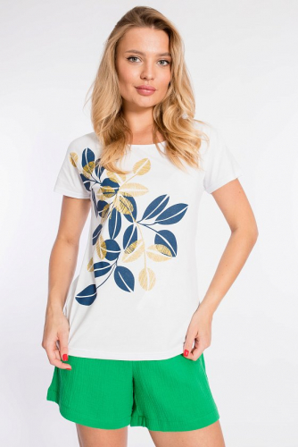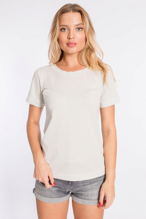 Футболка выполнена из стрейчевого полотна c люрексом. Рукава короткие. Вырез горловины спереди круглый, а сзади V-образный с декоративной планкой.