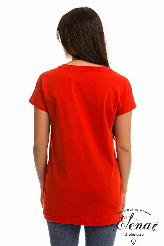Футболка с принтом спереди выполнена из однотонной кулирки. Круглый вырез горловины оформлен планкой. Линия плеча спущена,низ футболки разноуровневый, спинка длиннее переда.
