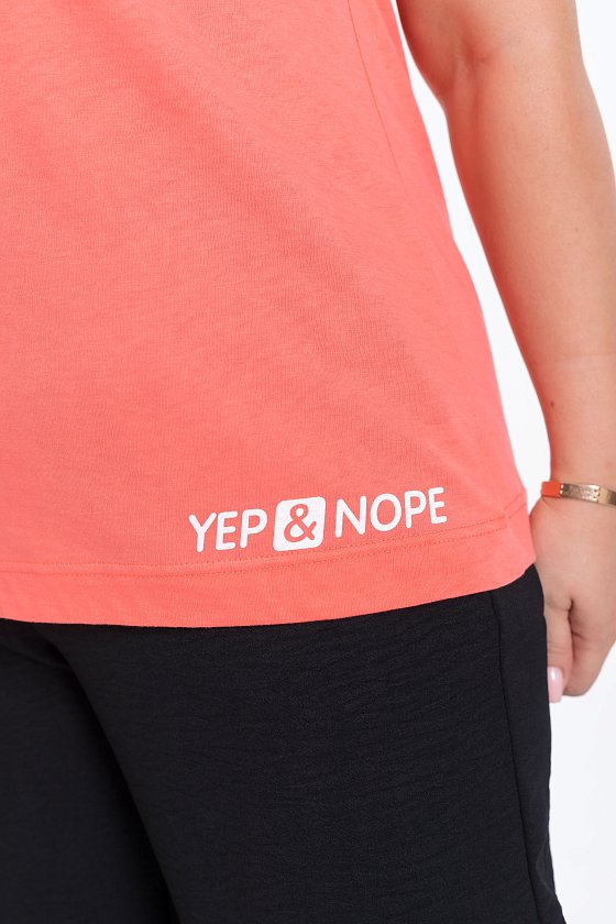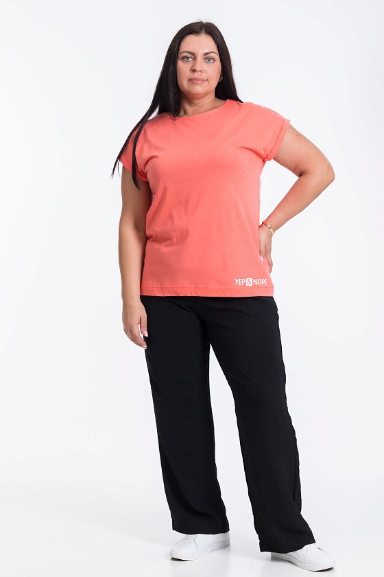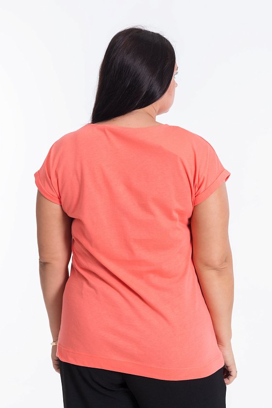 Женская футболка из кулирки — отличный выбор для повседневной носки. Изготовленная из мягкой и приятной к телу ткани, она обеспечивает комфорт в течение дня. Круглый вырез горловины и короткие цельнокроеные рукава с отворотами придают изделию аккуратный вид. Наличие принта спереди добавляет футболке оригинальности. Однотонный коралловый цвет позволяет сочетать её с различными элементами гардероба. Футболка подойдёт для прогулок, неформальных встреч или отдыха.