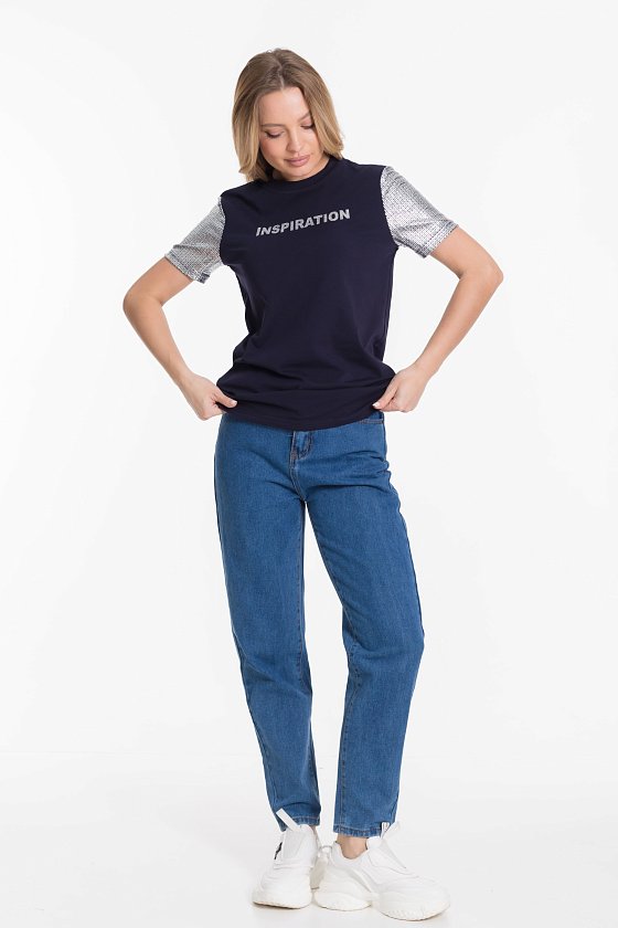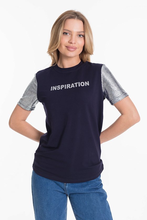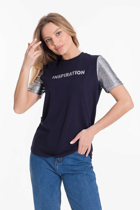 Футболка из однотонной кулирки с лайкрой и вискозы цвета серебра. Короткий втачной рукав в цвет отделочного полотна.