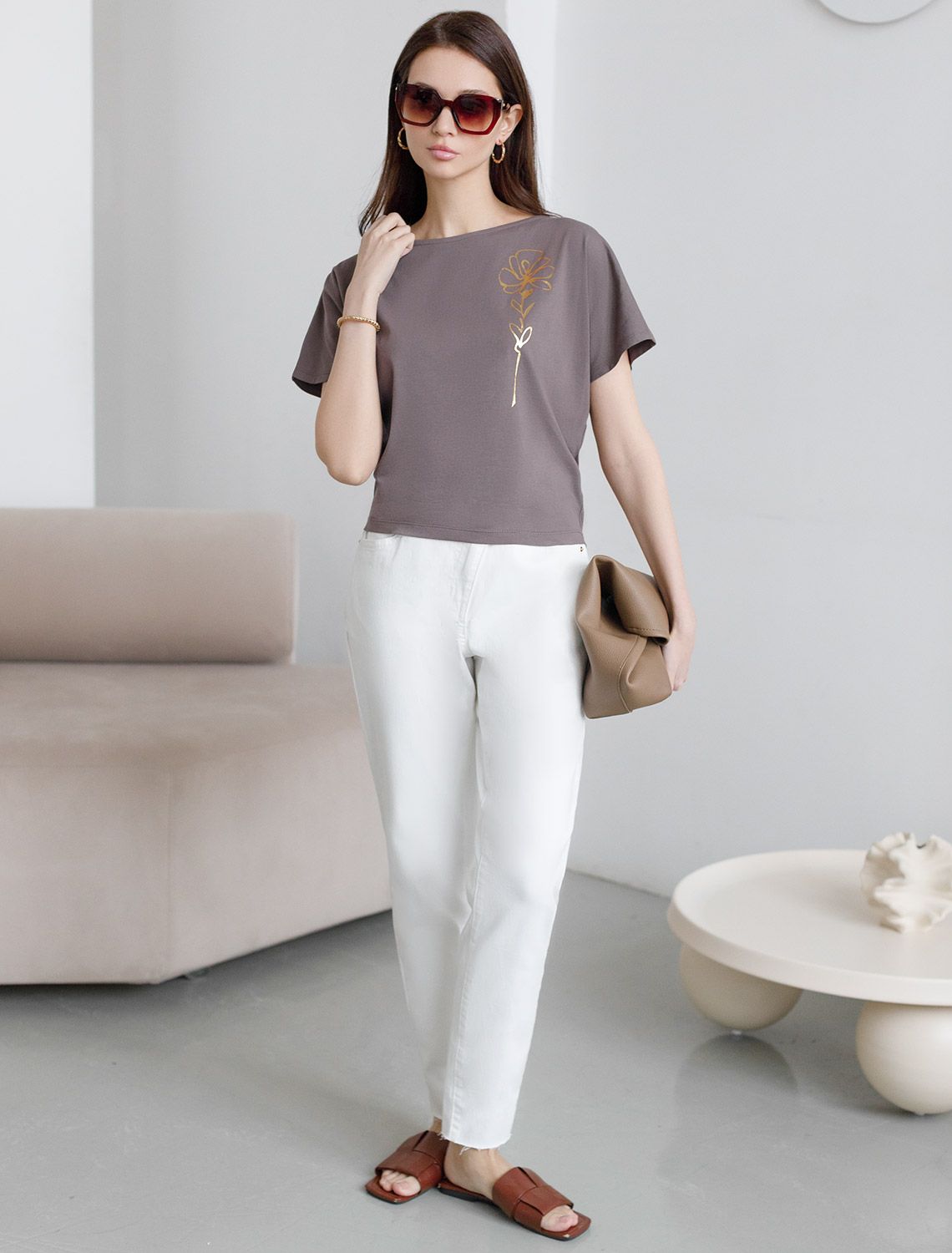 Футболка кофейного цвета идеально подходит для вечеринки и создания яркого образа. Оригинальный блестящий принт из фольги в виде цветка придает изделию шикарный вид, который привлечет внимание на любом мероприятии. Модель с вырезом лодочка и цельнокроеным рукавом обеспечивает свободу движений и комфорт в носке. Такой фасон изделия подходит на большие размеры, гармонично сидит на фигуре и помогает создать легкий акцент на достоинствах. Благодаря особенностям кроя с цельнокроеным рукавом удается искусно скроет любые возможные недостатки в области плеч и рук, обеспечивая комфортное прилегание без ощущения скованности. Аккуратный вырез лодочка красиво подчеркивает шею и делает образ элегантным, сохраняя актуальность для разных случаев — от рабочих встреч до вечерних прогулок и праздничных мероприятий.