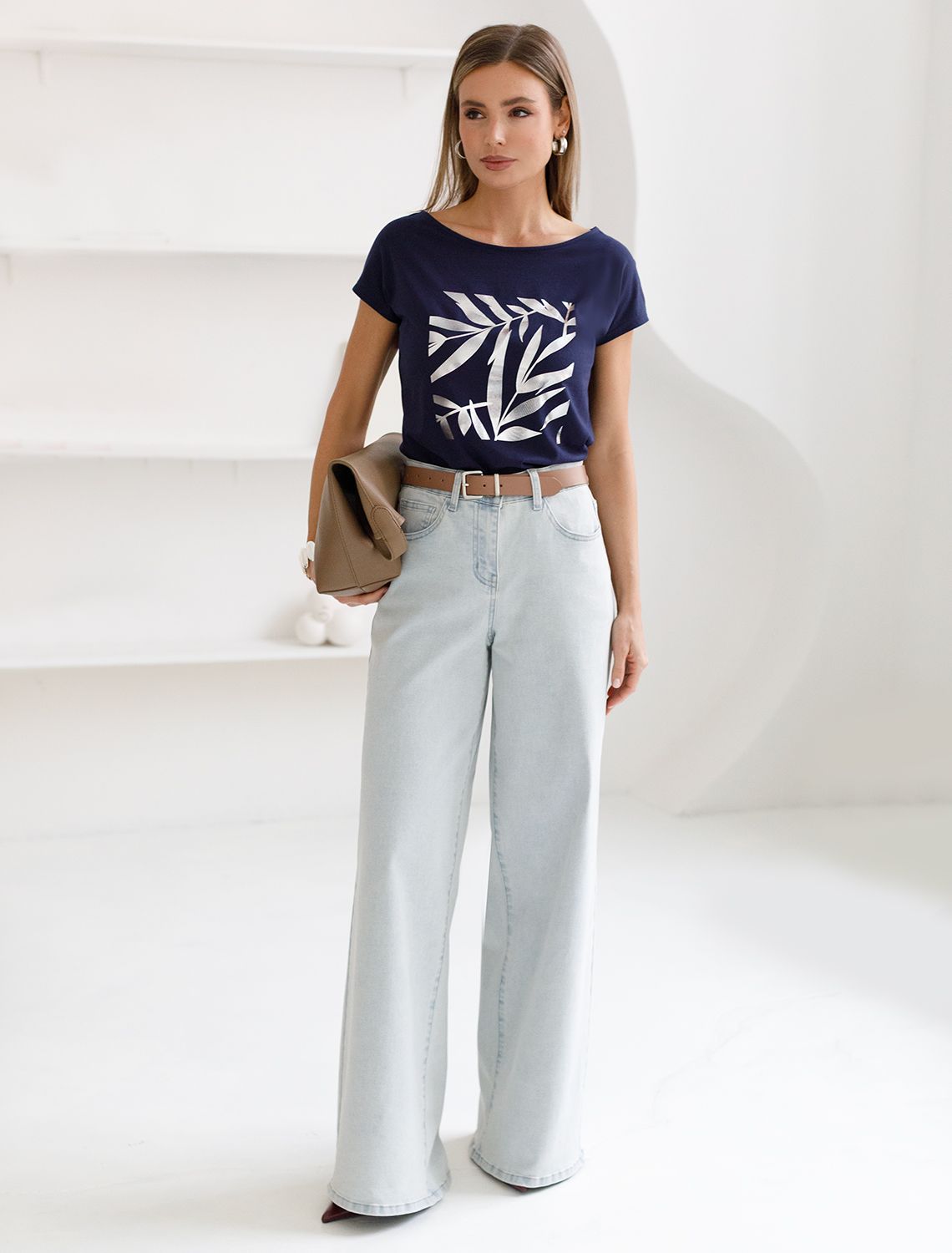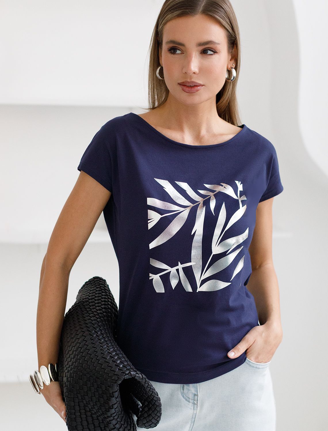 Футболка темно-синего цвета идеально подходит для вечеринки и создания яркого образа. Оригинальный блестящий принт из фольги серебристого цвета в виде листиков придает изделию шикарный вид, который привлечет внимание на любом мероприятии. Модель с вырезом лодочка и цельнокроеным коротким рукавом обеспечивает свободу движений и комфорт в носке. Такой фасон изделия подходит на большие размеры, гармонично сидит на фигуре и помогает создать легкий акцент на достоинствах. Аккуратный вырез лодочка красиво подчеркивает шею и делает образ элегантным, сохраняя актуальность для разных случаев — от рабочих встреч до вечерних прогулок и праздничных мероприятий.