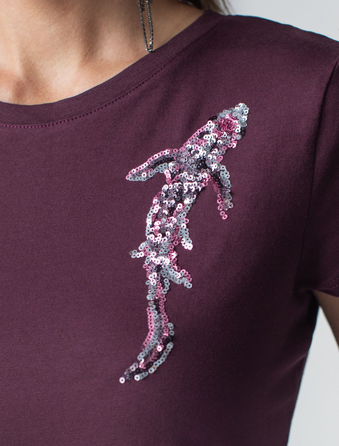 Нарядная футболка с блестящим принтом пайетками D49.135 бургунди_рыба