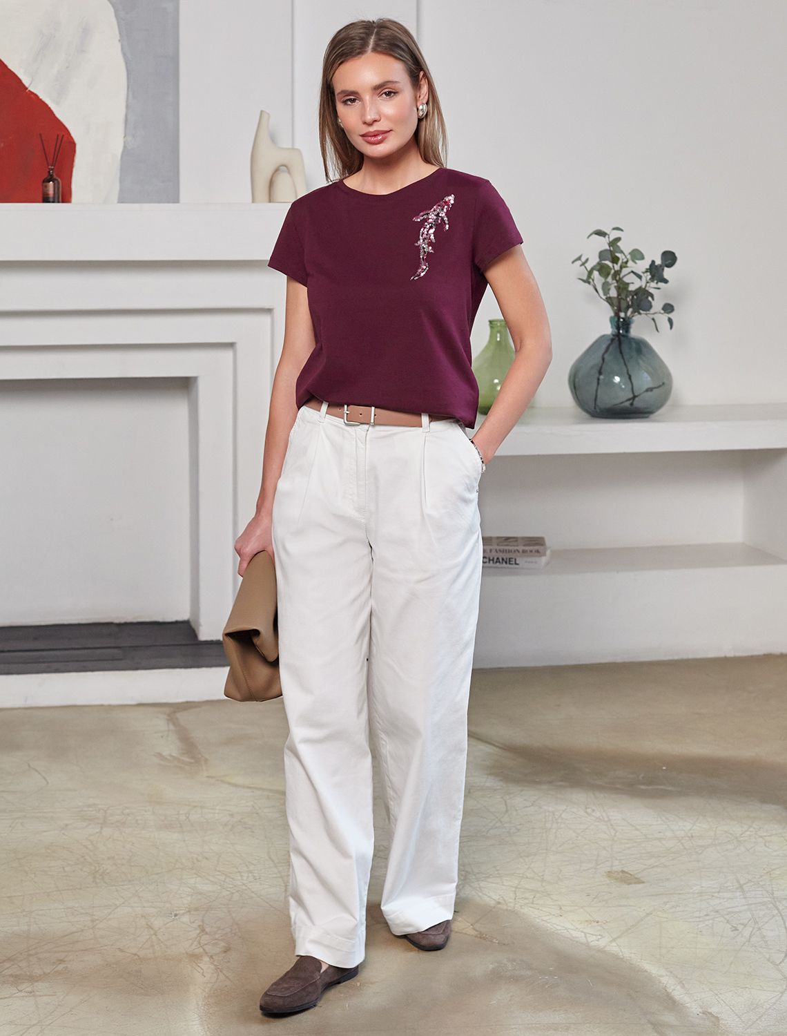 Футболка цвета бургунди идеально подходит для вечеринки и создания яркого образа. Оригинальный принт из ярких пайеток в виде рыбки придает изделию шикарный вид, который привлечет внимание на любом мероприятии. Модель с круглым вырезом и классическим коротким рукавом обеспечивает свободу движений и комфорт в носке. Такой фасон изделия подходит на большие размеры, гармонично сидит на фигуре и помогает создать легкий акцент на достоинствах. Аккуратный круглый вырез красиво подчеркивает шею и делает образ элегантным, сохраняя актуальность для разных случаев — от рабочих встреч до вечерних прогулок и праздничных мероприятий.