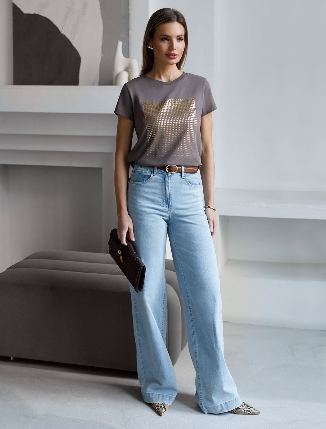 Футболка кофейного цвета идеально подходит для вечеринки и создания яркого образа. Оригинальный принт из фольги золотистого цвета придает изделию шикарный вид, который привлечет внимание на любом мероприятии. Модель с круглым вырезом и классическим коротким рукавом обеспечивает свободу движений и комфорт в носке. Такой фасон изделия подходит на большие размеры, гармонично сидит на фигуре и помогает создать легкий акцент на достоинствах. Аккуратный круглый вырез красиво подчеркивает шею и делает образ элегантным, сохраняя актуальность для разных случаев — от рабочих встреч до вечерних прогулок и праздничных мероприятий.