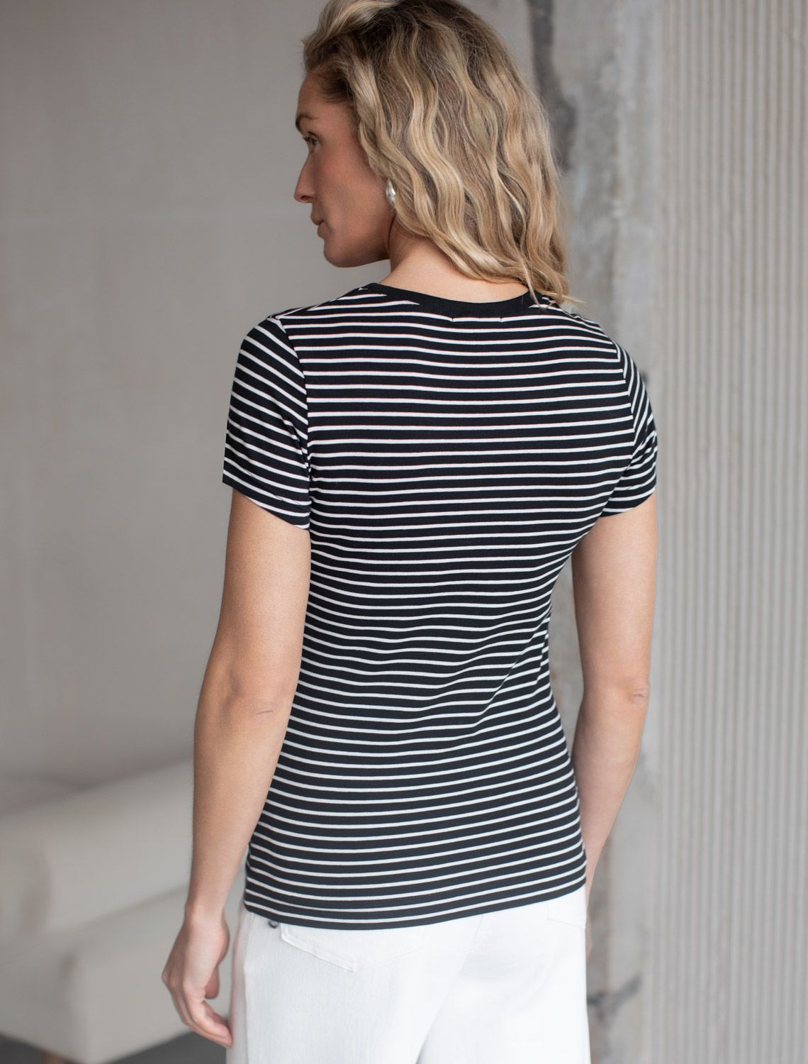 Стильная и модная женская футболка в тонкую черно-белую полоску станет отличным дополнением к вашему гардеробу. Футболка плотностью 170 Г/м2 изготовлена из премиального хлопка с добавлением эластана. Добавление эластана в состав изделия способствует формоустойчивости. Эта классическая футболка подходит для создания кэжуал образа на каждый день и идеально подойдет для работы. Модель не мнется, что делает ее практичным вариантом для активных женщин, которые ценят стиль и удобство. Благодаря современному принту полоска эта футболка легко комбинируется с различными элементами гардероба. Она станет универсальным решением для тех, кто предпочитает комфортный стиль casual. Повседневная футболка подчеркнет вашу индивидуальность и позволит вам выглядеть привлекательно в любой ситуации. Легкость в уходе и высокая износостойкость делают ее незаменимой вещью в вашем гардеробе. Одевайте эту модель как на работу, так и на встречу с друзьями — она всегда будет уместна! Стильная и практичная модель с простым кроем и лаконичным дизайном - идеальный вариант для тех, кто ценит качество, минимализм и классический стиль в одежде.