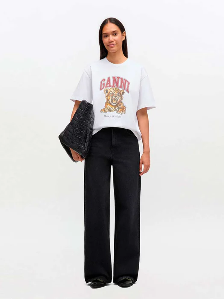 На футболке изображен тигровый принт, выполненный бисером, и надпись «Хорошего дня! Пожалуйста, сдавайте на переработку».