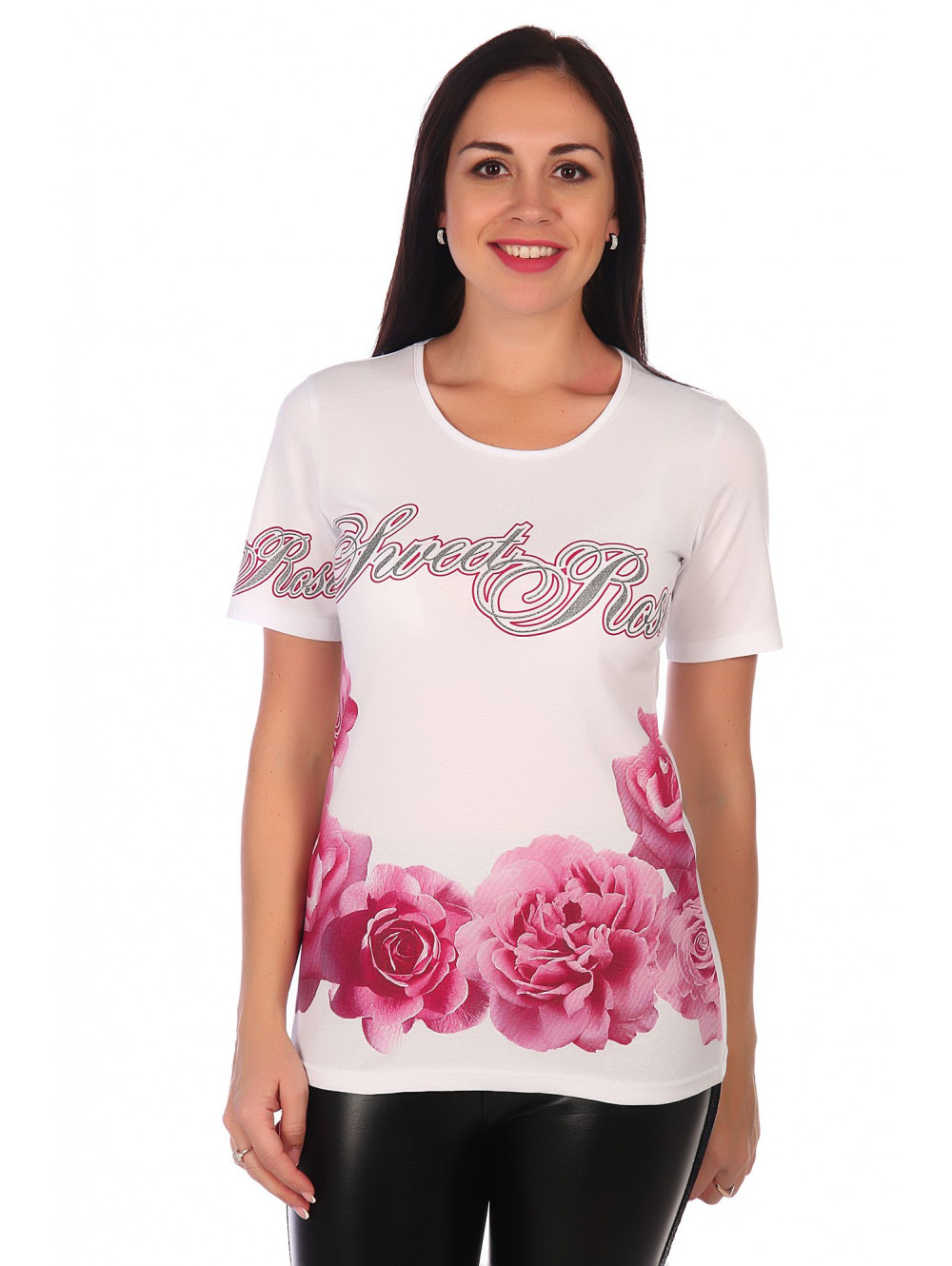 Футболка ГЕРЛЕН полуприлегающего силуэта с коротким рукавом. Украшена принтом в виде красивых цветов по низу изделия и рукавов.