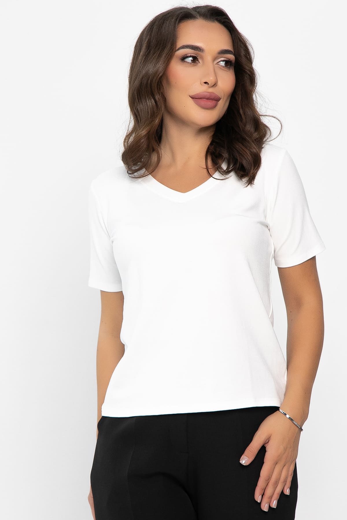 Белая женская футболка с V-образным вырезом и коротким рукавом станет основой вашего гардероба. Ее классический дизайн и удобный крой делают ее идеальной для повседневных образов и офисного стиля. Эта базовая вещь добавит вашему гардеробу элегантности и функциональности, позволяя создавать разнообразные комплекты.