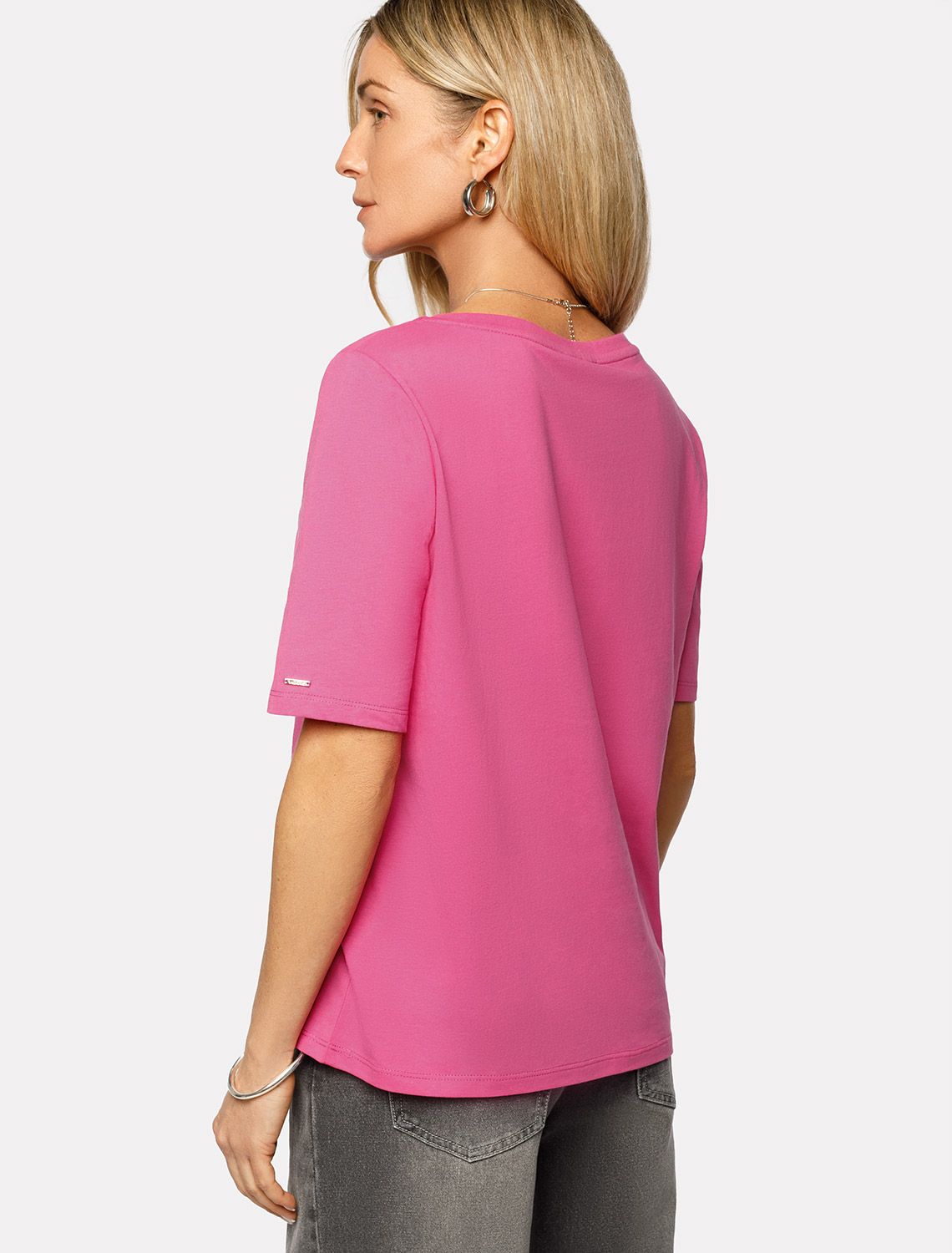 Базовая модель свободного кроя c V-вырезом легко впишется в повседненвый гардероб. Изделие хорошо держит форму и обеспечивает комфортный микроклимат в течение дня. розовая фуксия