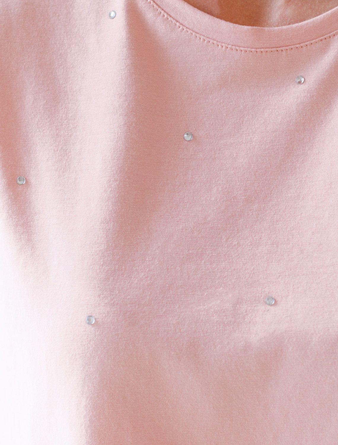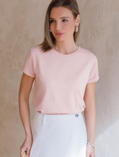 Футболка выполнена из премиального хлопка с эластаном. Лаконичный принт выполнен россыпью сияющих страз в тон изделия. Модель среднего объема дополнена подворотами на рукавах. Подходит для любого типа фигуры. Изделие дополнено металлическим логотипом бренда. пудра_стразы