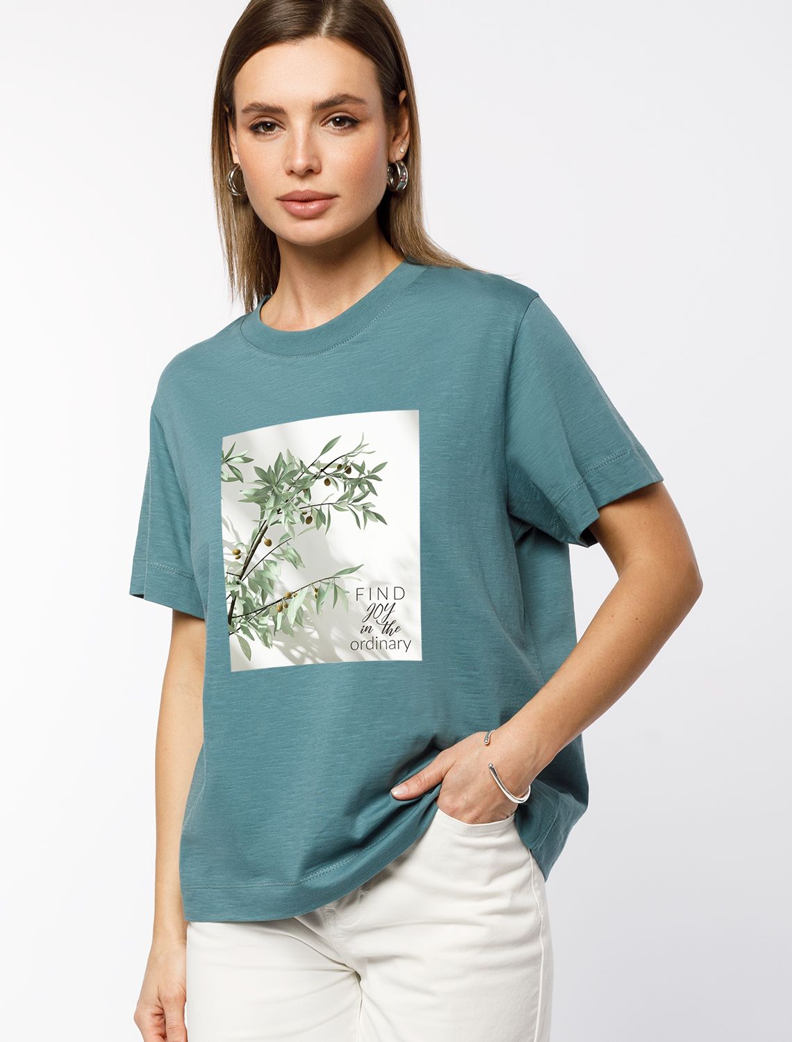Перевод принта: Find joy in the ordinary - находи радость в мелочах. Футболка выполнена из фактурного полотна из 100% хлопка. Модель с лаконичным авторским принтом легко впишется в любой весенне-летний гардероб. Ткань имеет характерный рисунок черточки за счет сочетания разных волокон хлопка 140-150 г. Хорошо держит форму и поддерживает комфортный микроклимат в течении дня. полынь_find joy