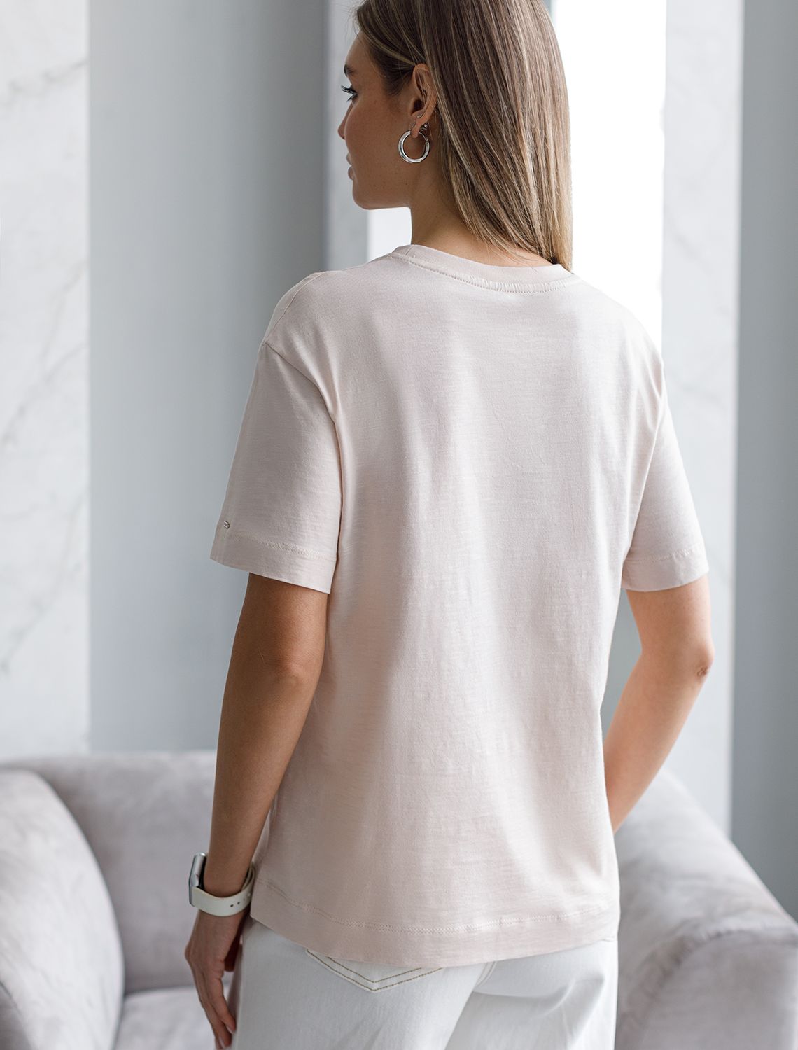 Перевод принта: Find joy in the ordinary - находи радость в мелочах. Футболка выполнена из фактурного полотна из 100% хлопка. Модель с лаконичным авторским принтом легко впишется в любой весенне-летний гардероб. Ткань имеет характерный рисунок черточки за счет сочетания разных волокон хлопка 140-150 г. Хорошо держит форму и поддерживает комфортный микроклимат в течении дня.