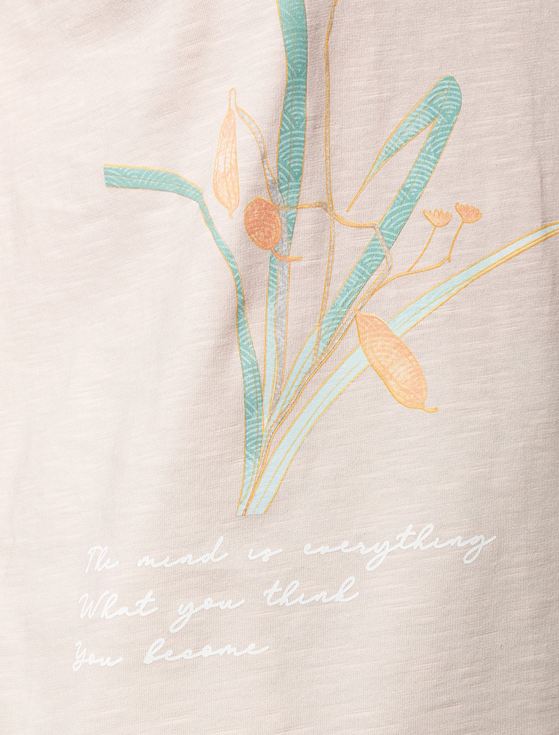 Перевод принта: The mind is everything, what you think you become - мысли материальны, ты то, о чем ты думаешь. Футболка выполнена из фактурного полотна из 100% хлопка. Модель с лаконичным авторским принтом легко впишется в любой весенне-летний гардероб. Ткань имеет характерный рисунок черточки за счет сочетания разных волокон хлопка 140-150 г. Хорошо держит форму и поддерживает комфортный микроклимат в течении дня.