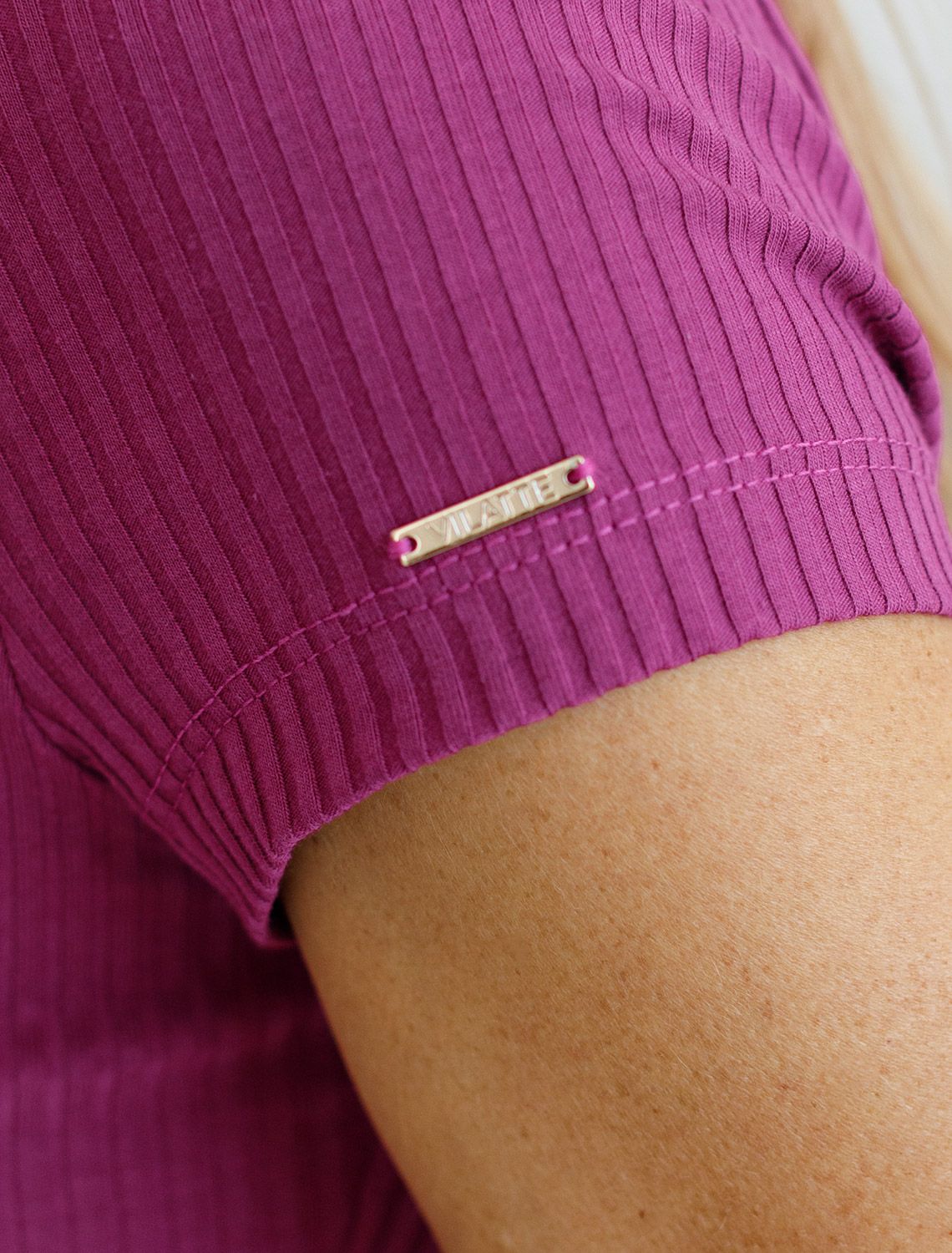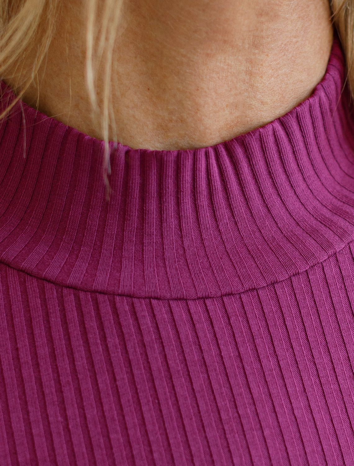 Футболка с воротом стойка выполнена из фактурного трикотажа в рубчик. Модель идеально сидит по фигуре не сковывая движения. Хлопковый трикотаж поддерживает оптимальную температуру тела, поэтому в изделии будет комфортно в течении всего дня. Наличие эластана в составе гарантирует формоустойчивости. Базовая модель впишется в любой гардероб и подойдет для офисного дресс-кода. пурпурный