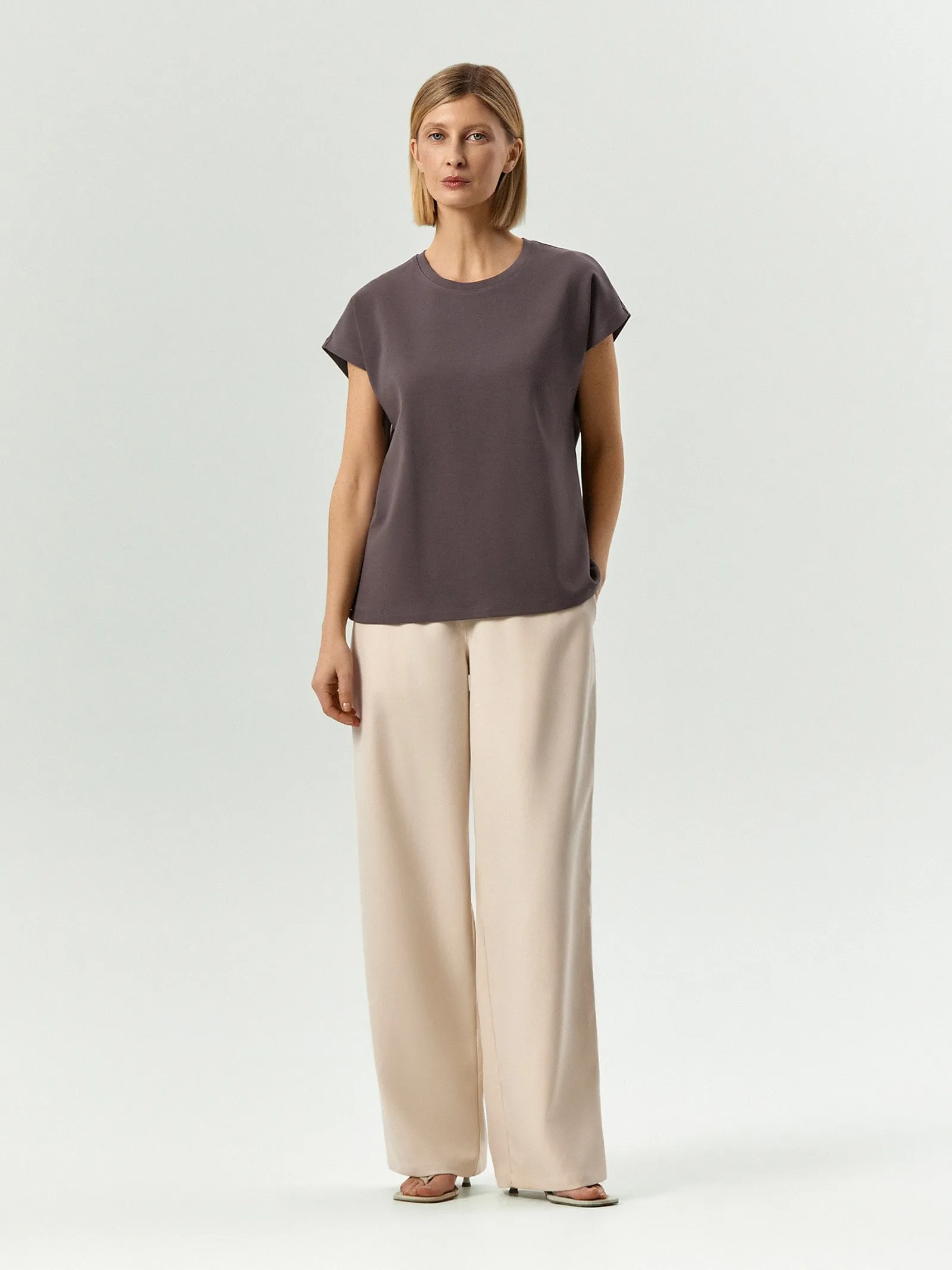 Базовая футболка в цвете графита для концептуальных и простых образов. Модель без рукавов со спущенным плечом удобно носить под жакет: ничего не собирается складками и не мешает. Выполнена из хлопка с небольшим добавлением эластана для лучшей посадки.