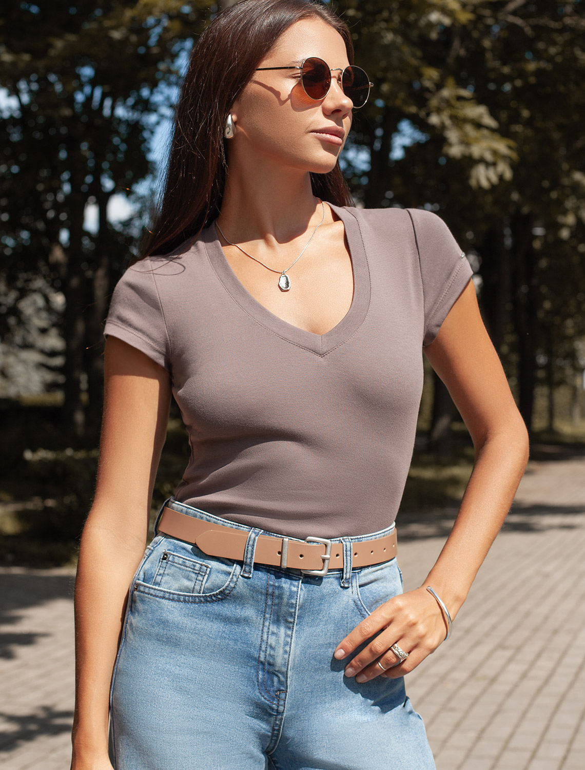 Облегающая футболка с V-образным вырезом глубокого кофейного оттенка создаст утонченный образ. Идеальная базовая модель для вашего гардероба! Глубокий V-образный вырез подчеркивает линию шеи и зрительно удлиняет силуэт. Футболка выполнена из хлопка с добавлением эластана, которая мягко облегает контуры тела, подчеркивая достоинства фигуры. Универсальный вариант для создания стильных повседневных образов.