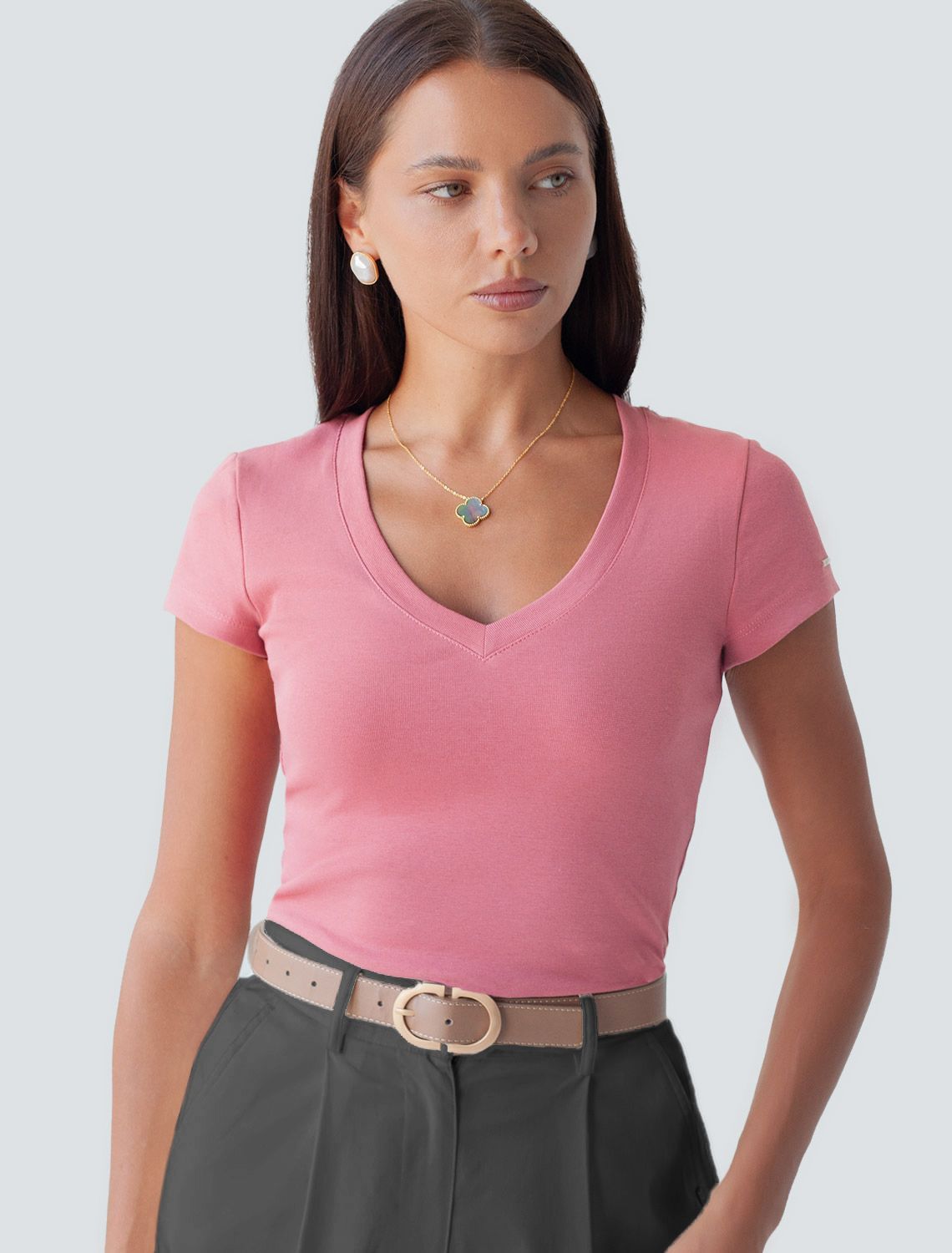 Облегающая футболка с V-образным вырезом оттенка "туманная роза" создаст утонченный образ. Идеальная базовая модель для вашего гардероба! Глубокий V-образный вырез подчеркивает линию шеи и зрительно удлиняет силуэт. Футболка выполнена из хлопка с добавлением эластана, которая мягко облегает контуры тела, подчеркивая достоинства фигуры. Универсальный вариант для создания стильных повседневных образов.