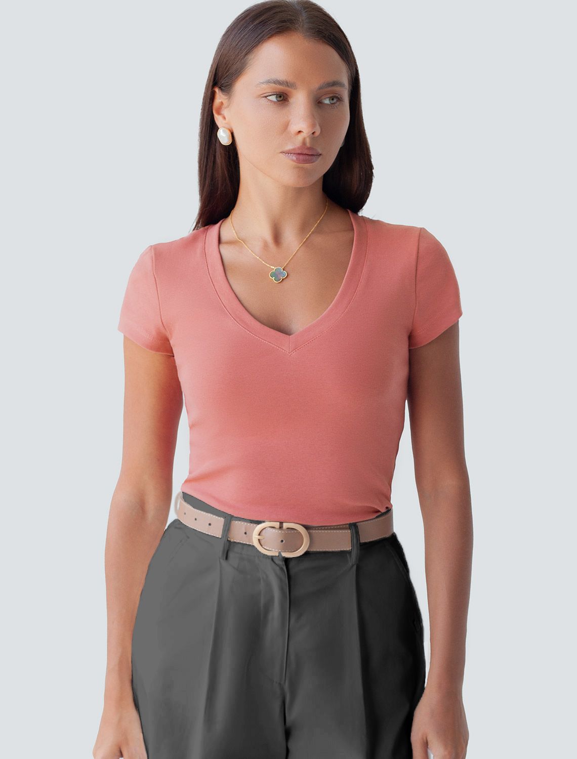 Облегающая футболка с V-образным вырезом террактового цвета создаст утонченный образ. Идеальная базовая модель для вашего гардероба! Глубокий V-образный вырез подчеркивает линию шеи и зрительно удлиняет силуэт. Футболка выполнена из хлопка с добавлением эластана, которая мягко облегает контуры тела, подчеркивая достоинства фигуры. Универсальный вариант для создания стильных повседневных образов.