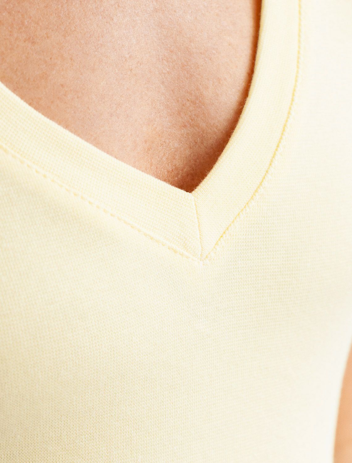 Облегающая футболка с V-образным вырезом бананового цвета создаст утонченный образ. Идеальная базовая модель для вашего гардероба! Глубокий V-образный вырез подчеркивает линию шеи и зрительно удлиняет силуэт. Футболка выполнена из хлопка с добавлением эластана, которая мягко облегает контуры тела, подчеркивая достоинства фигуры. Универсальный вариант для создания стильных повседневных образов. банановый