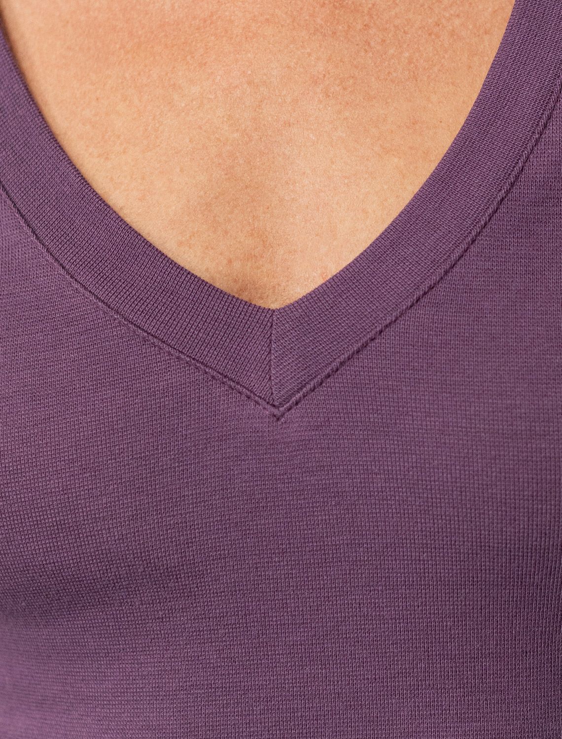 Облегающая футболка с V-образным вырезом цвета "бургунди" создаст утонченный образ. Идеальная базовая модель для вашего гардероба! Глубокий V-образный вырез подчеркивает линию шеи и зрительно удлиняет силуэт. Футболка выполнена из хлопка с добавлением эластана, которая мягко облегает контуры тела, подчеркивая достоинства фигуры. Универсальный вариант для создания стильных повседневных образов. бургунди