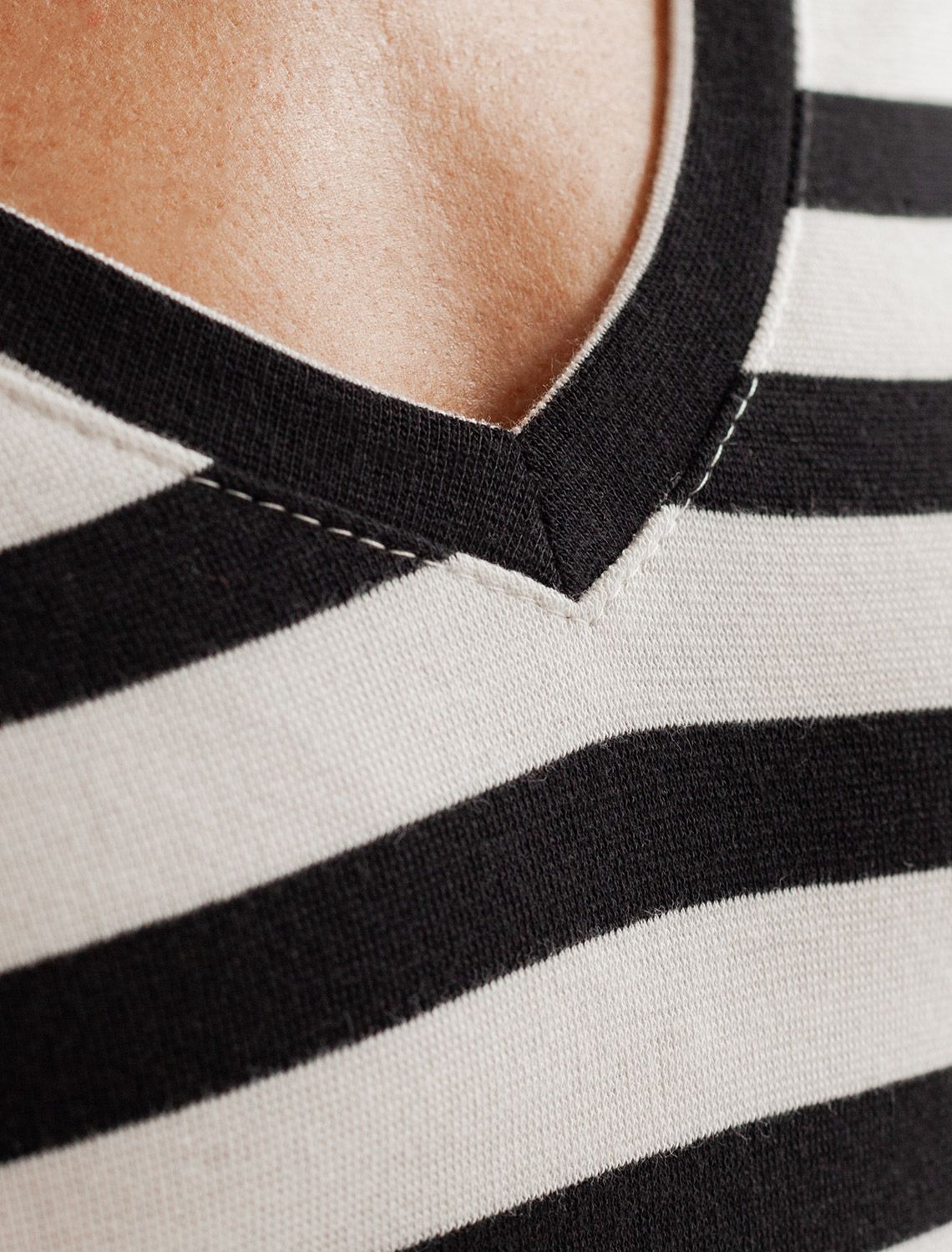 Облегающая футболка с V-образным вырезом в черно-белую полоску создаст утонченный образ. Идеальная базовая модель для вашего гардероба! Глубокий V-образный вырез подчеркивает линию шеи и зрительно удлиняет силуэт. Футболка выполнена из хлопка с добавлением эластана, которая мягко облегает контуры тела, подчеркивая достоинства фигуры. Универсальный вариант для создания стильных повседневных образов. белый-черный