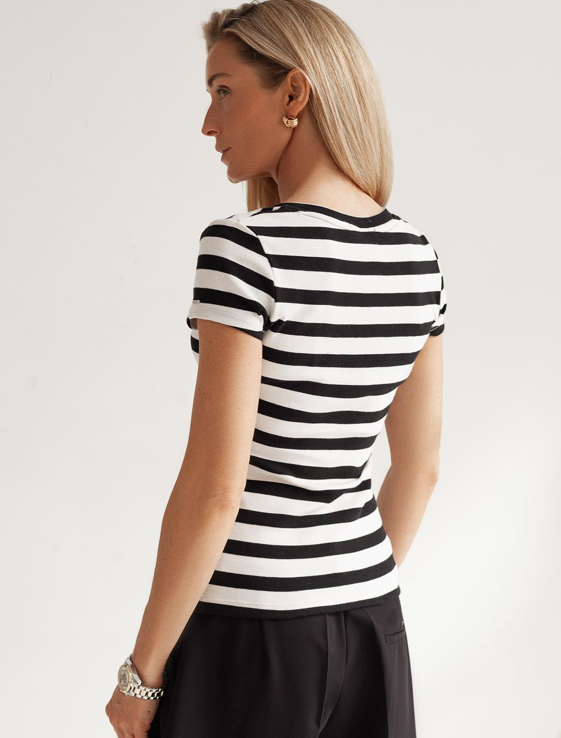 Облегающая футболка с V-образным вырезом в черно-белую полоску создаст утонченный образ. Идеальная базовая модель для вашего гардероба! Глубокий V-образный вырез подчеркивает линию шеи и зрительно удлиняет силуэт. Футболка выполнена из хлопка с добавлением эластана, которая мягко облегает контуры тела, подчеркивая достоинства фигуры. Универсальный вариант для создания стильных повседневных образов.