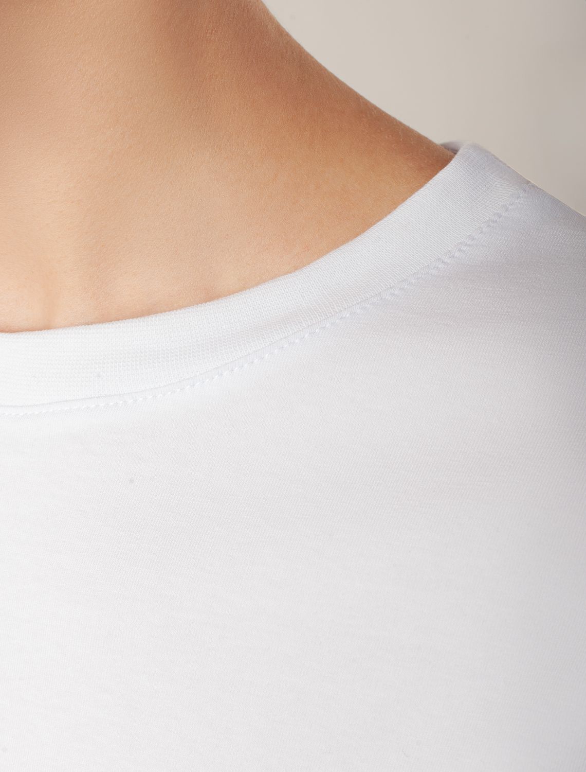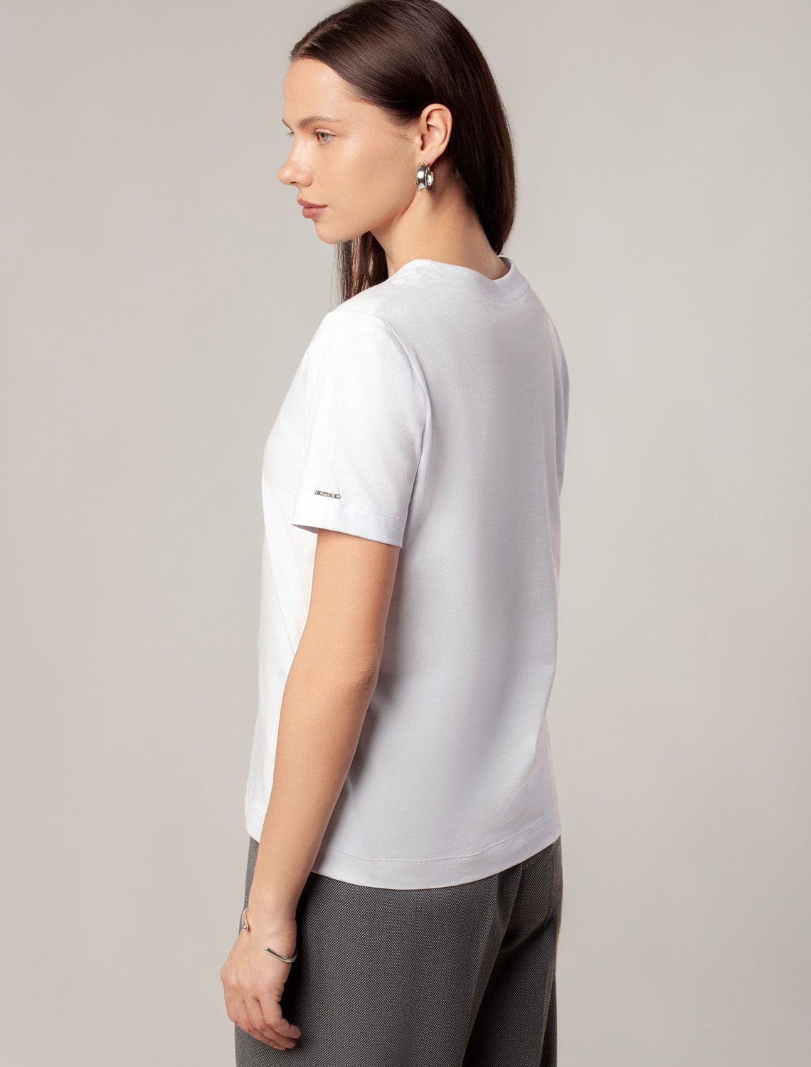 Базовая однотонная футболка из премиального хлопка. Горловина выполнена из рибаны в тон изделия, Добавление эластана в состав изделия способствует формоустойчивости. Самое высокое качество хлопковых волокон обеспечивает комфорт в любое время года. Идеально держит форму и сохраняет внешний вид в течение долговременного использования. Универсальная базовая вещь для ваших стилистических решений. Изделие дополнено металлическим логотипом бренда на рукаве.