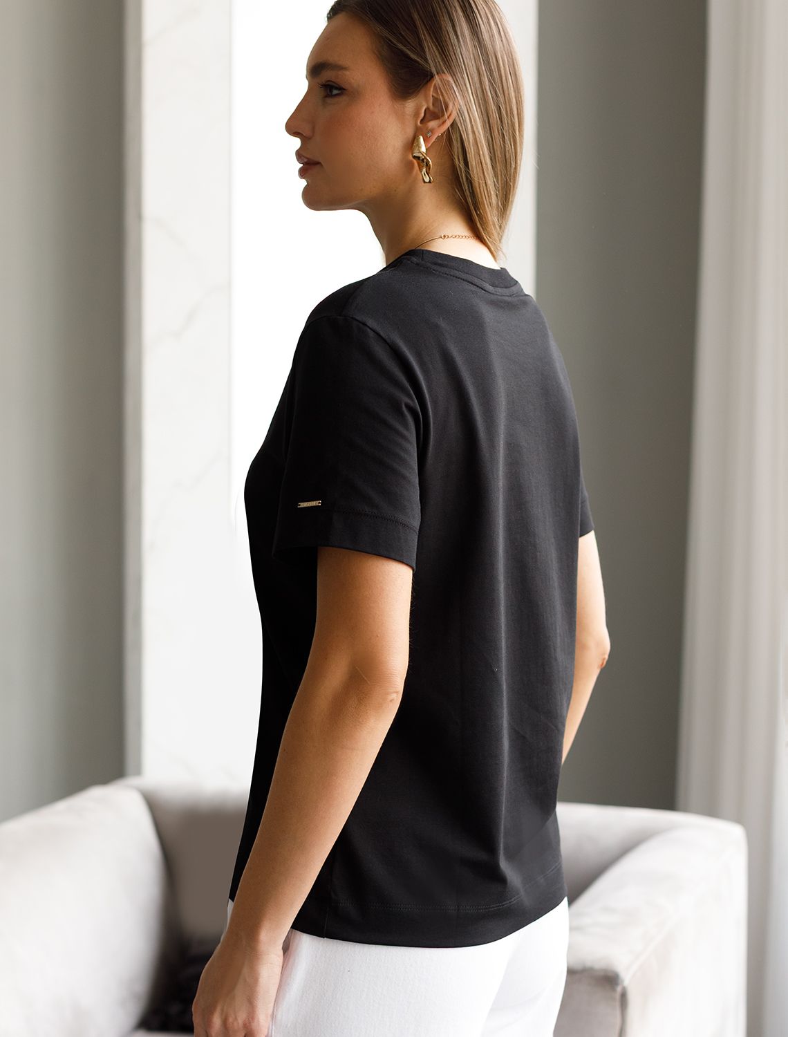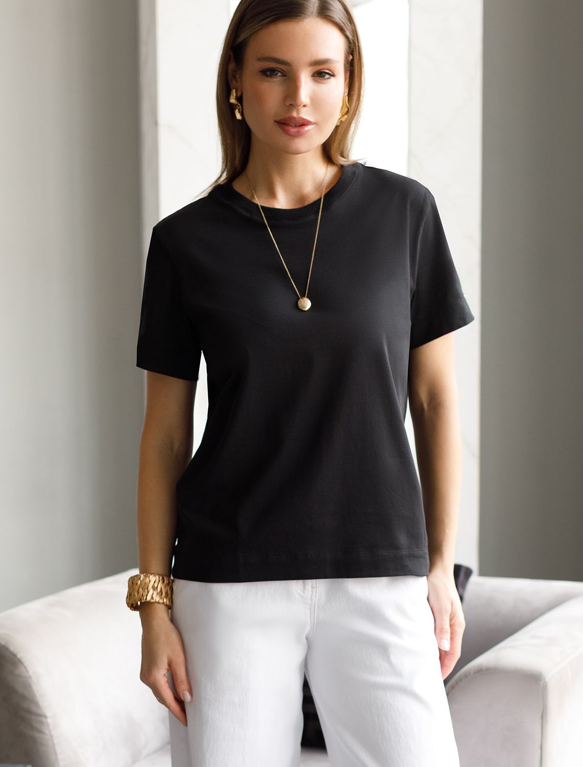 Базовая однотонная футболка из премиального хлопка. Горловина выполнена из рибаны в тон изделия, Добавление эластана в состав изделия способствует формоустойчивости. Самое высокое качество хлопковых волокон обеспечивает комфорт в любое время года. Идеально держит форму и сохраняет внешний вид в течение долговременного использования. Универсальная базовая вещь для ваших стилистических решений. Изделие дополнено металлическим логотипом бренда на рукаве.