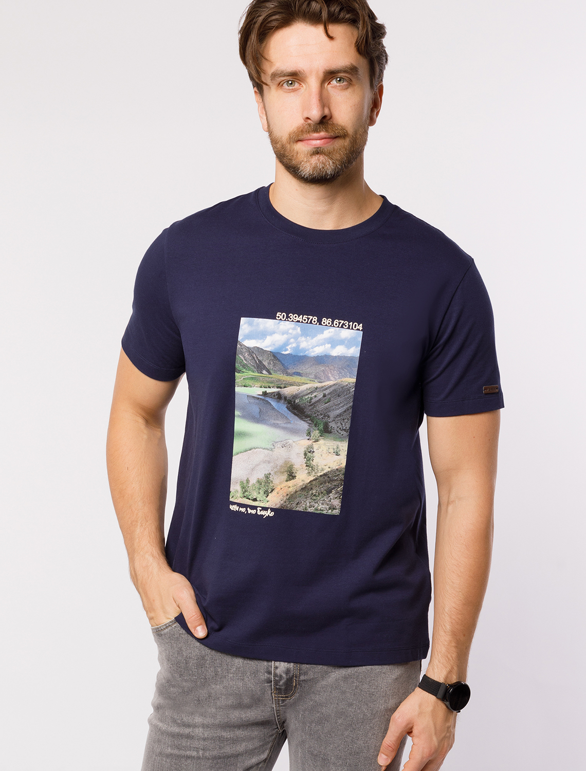 Принт выполнен красками с устойчивым покрытием. Футболка выполнена из премиального хлопка. Особым преимуществом является наличие эластана в составе изделия. Очень приятная на ощупь и комфортная при носке, футболка сохранит свой безупречный внешний вид в течении долгого времени. Модель дополнена нашивкой из эко-кожи с логотипом VILATTE. темно-синий_алтай