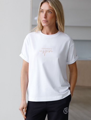 Рост 170, бюст 83, талия 64, бедра 88 Перевод принта: Dream, create, share, inspire — мечтай, создавай, делись, вдохновляй.