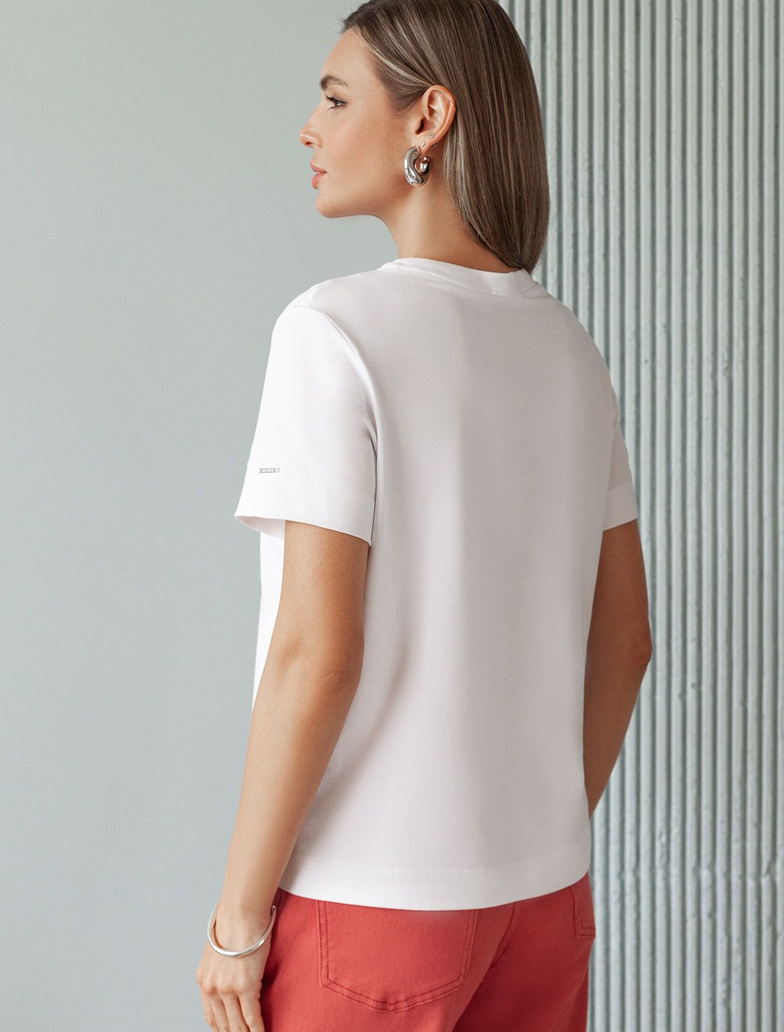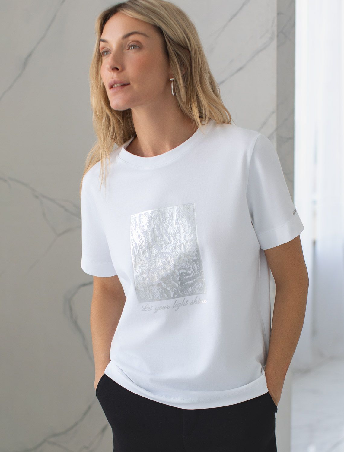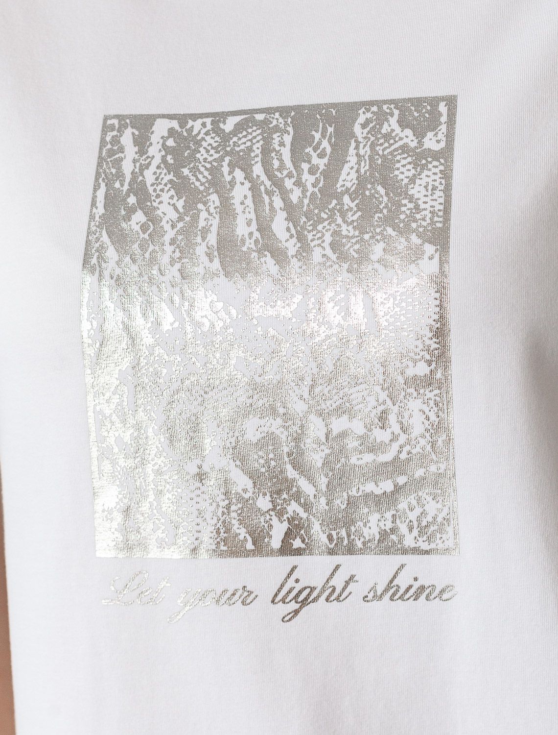 Футболка выполнена из премиального хлопка с эластаном. Эффектный фактурный принт нанесен фольгой с устойчивым покрытием, он станет дополнением не только в повседневных сочетаниях, но и отлично подойдет к вечерним образам.Изделие отлично держит форму, почти не мнется и комфортно сидит по фигуре. Отдельным украшением служит металлический логотип бренда на рукаве изделия.
