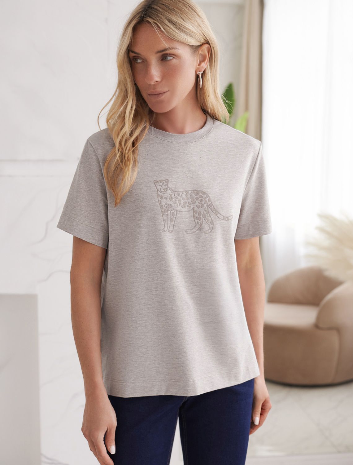 Футболка выполнена из премиального хлопка.Принт "леопард" нанесен фактурными красками с устойчивым покрытием. Наличие эластана в составе гарантирует комфорт и формоустойчивость. Изделие дополнено фирменным металлическим логотипом бренда.