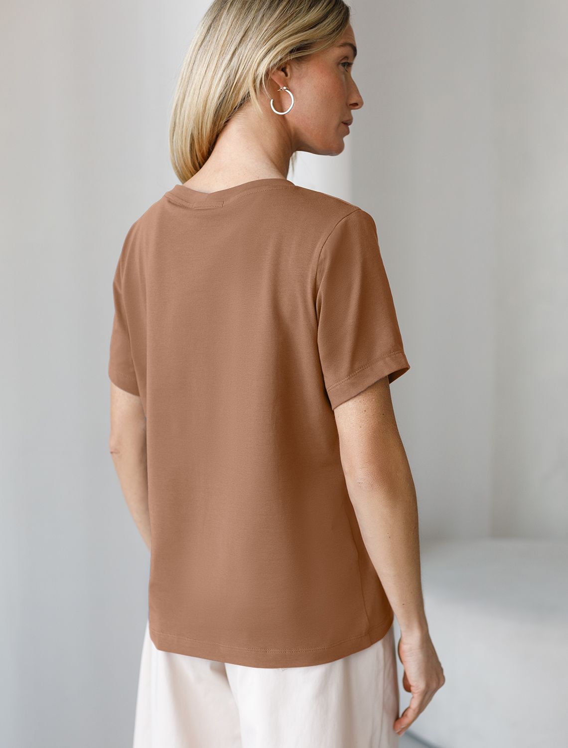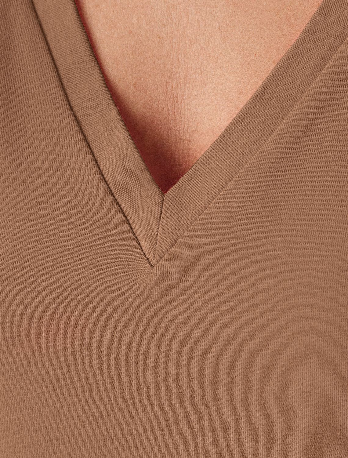 Футболка выполнена из премиального хлопка. Базовая модель с V-вырезом впишется в любой гардероб в любом сезоне. Наличие эластана в составе изделия гарантирует комфорт и формоустойчивость. На рукаве металлический логотип бренда. карамель