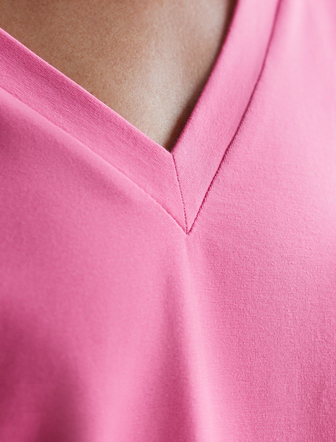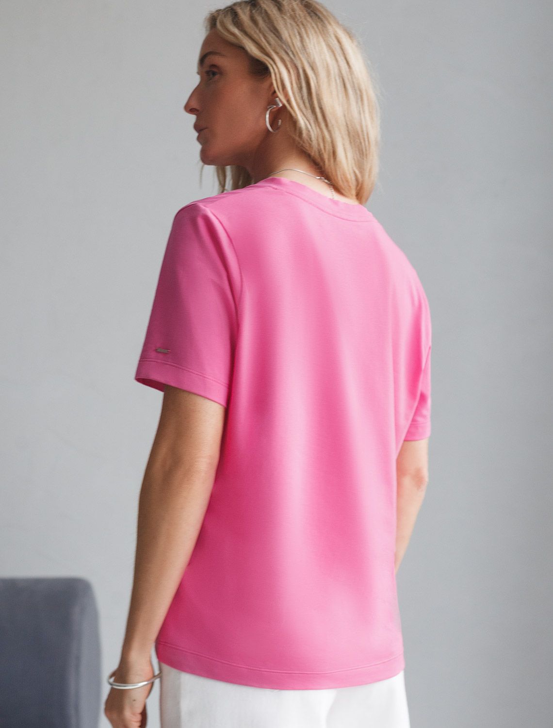 Футболка выполнена из премиального хлопка. Базовая модель с V-вырезом впишется в любой гардероб в любом сезоне. Наличие эластана в составе изделия гарантирует комфорт и формоустойчивость. На рукаве металлический логотип бренда. розовая фуксия