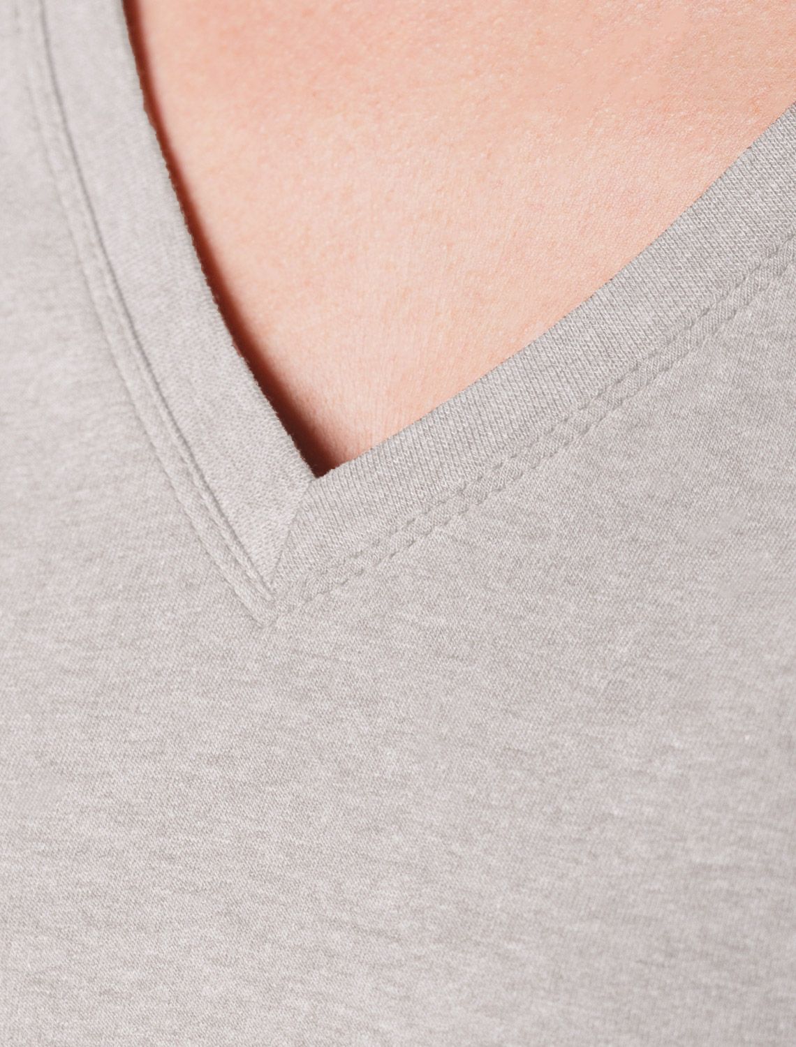 Однотонная футболка с V-образным вырезом выполнена из премиального хлопка. Добавление эластана в состав изделия способствует формоустойчивости. Самое высокое качество длинноволокнистых хлопковых волокон обеспечивает комфорт в любое время года.Универсальная базовая будет уместна не только в повседневном образе с денимом, но и в офисе с нестрогим дресс-кодом, в паре с брюками и жакетом.