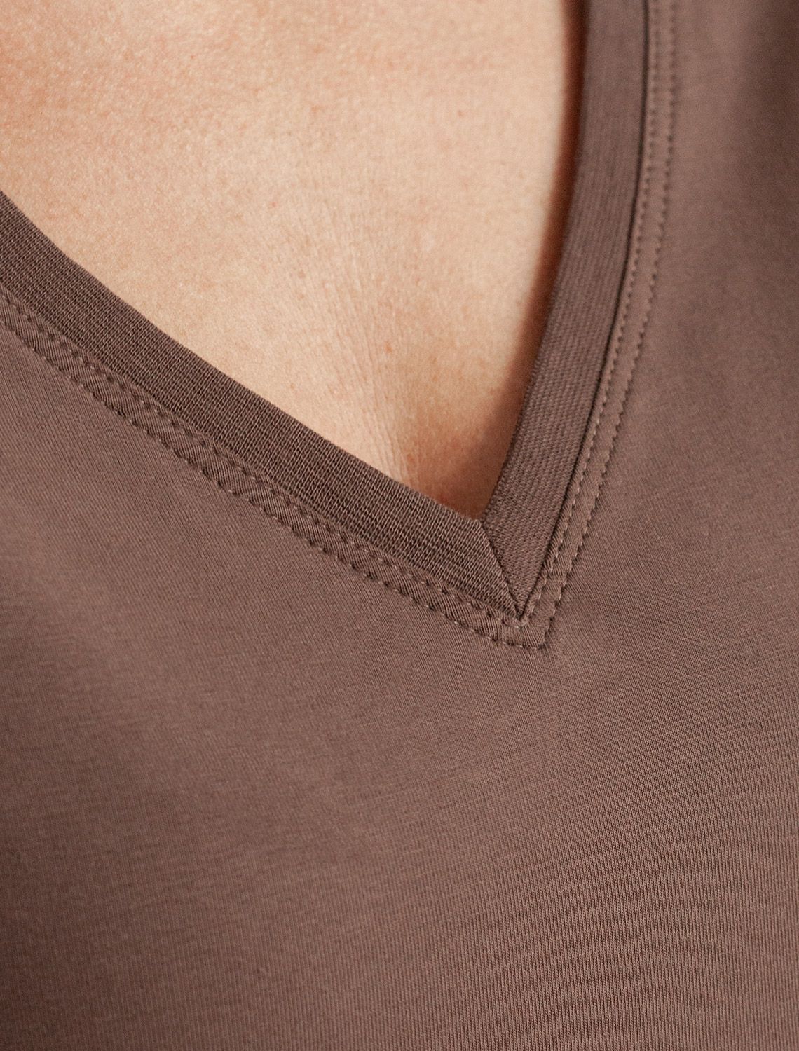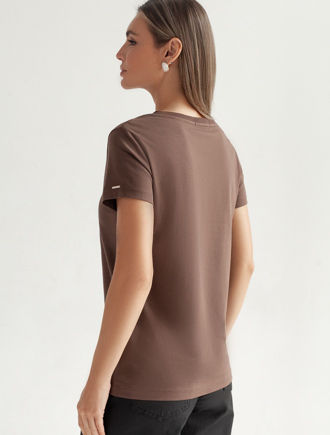 Однотонная футболка с V-образным вырезом выполнена из премиального хлопка. Добавление эластана в состав изделия способствует формоустойчивости. Самое высокое качество длинноволокнистых хлопковых волокон обеспечивает комфорт в любое время года.Универсальная базовая будет уместна не только в повседневном образе с денимом, но и в офисе с нестрогим дресс-кодом, в паре с брюками и жакетом. темный кофе