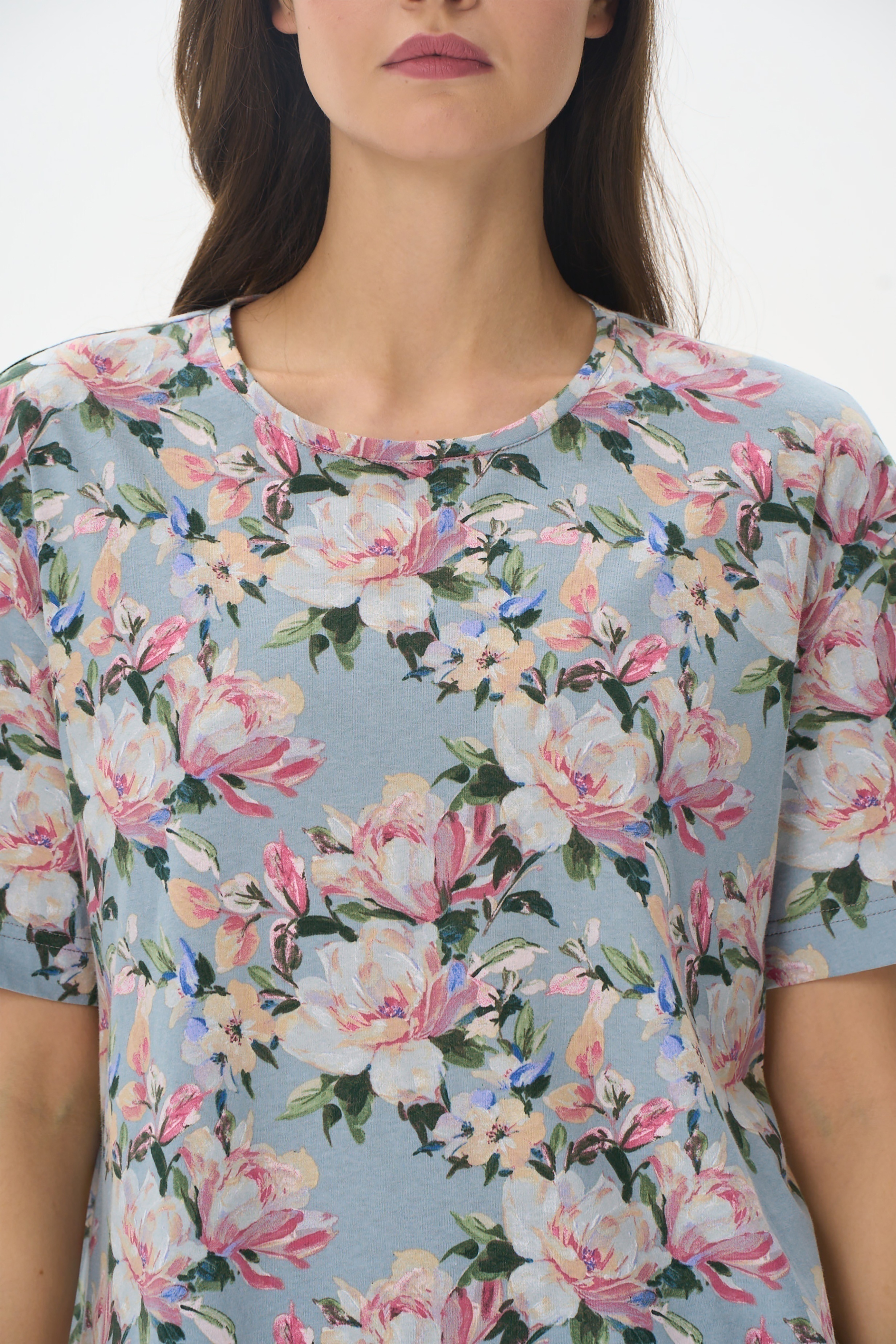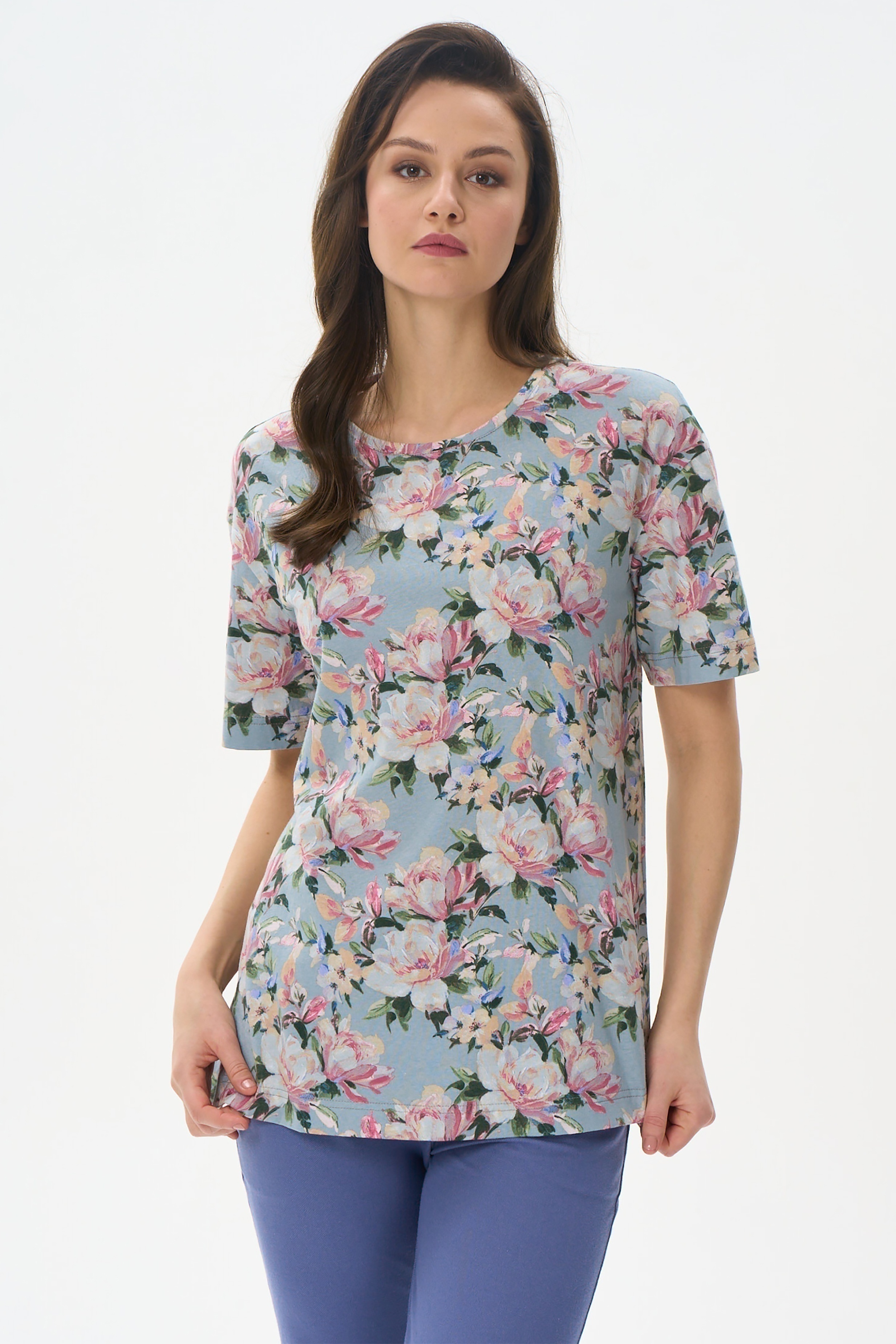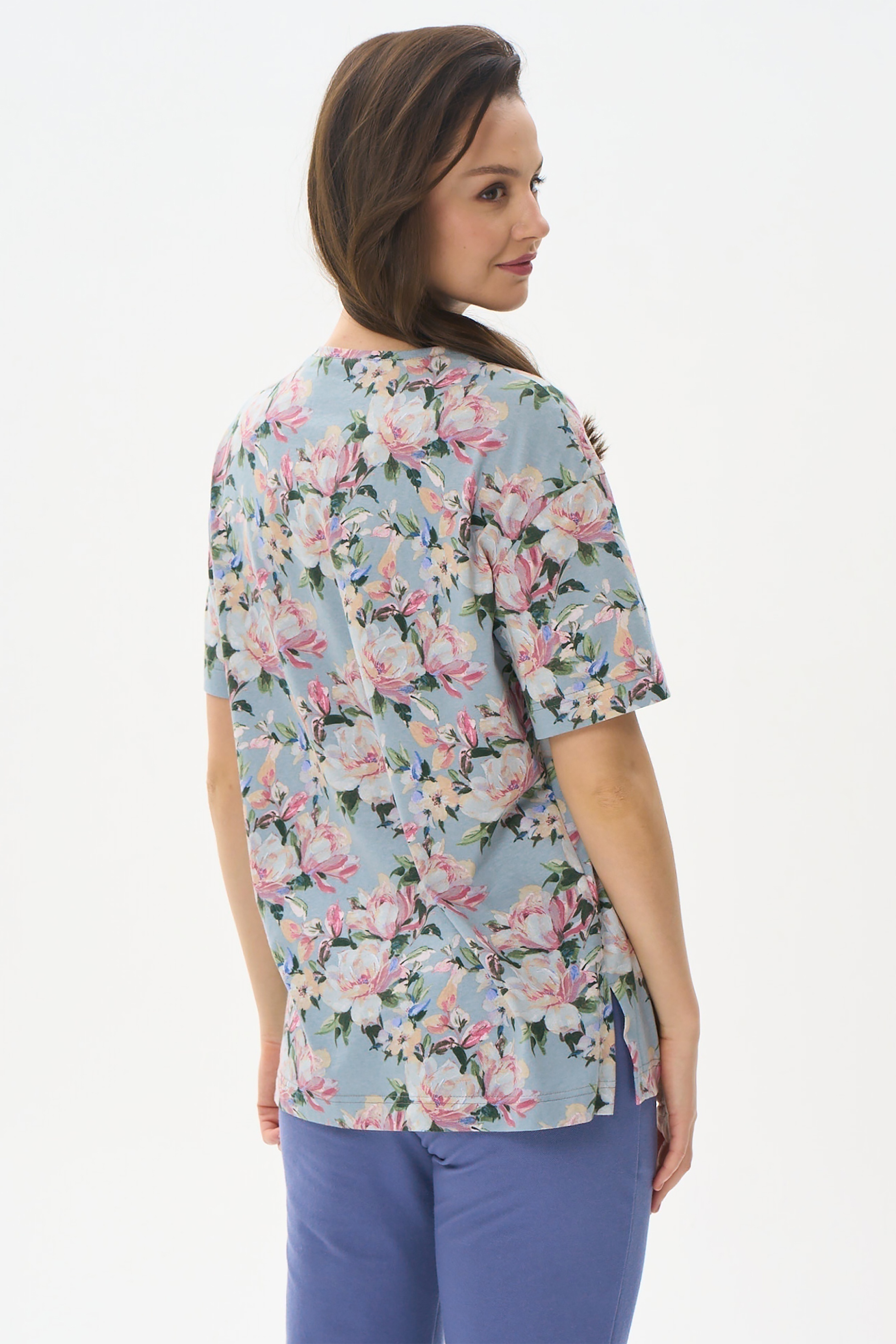 100% хлопок Удлиненная футболка свободного силуэта из хлопкового трикотажного полотна. Широкие рукава длиной до локтя. По низу изделия в боковых швах разрезы. Рост модели на фото 177 см