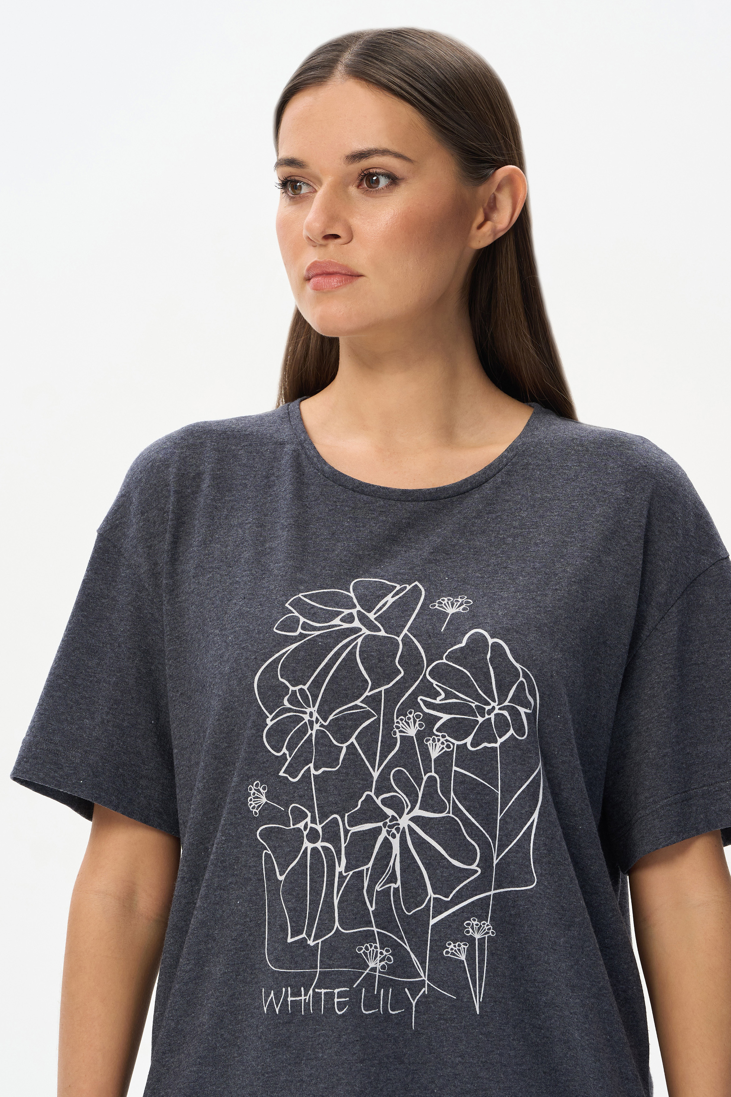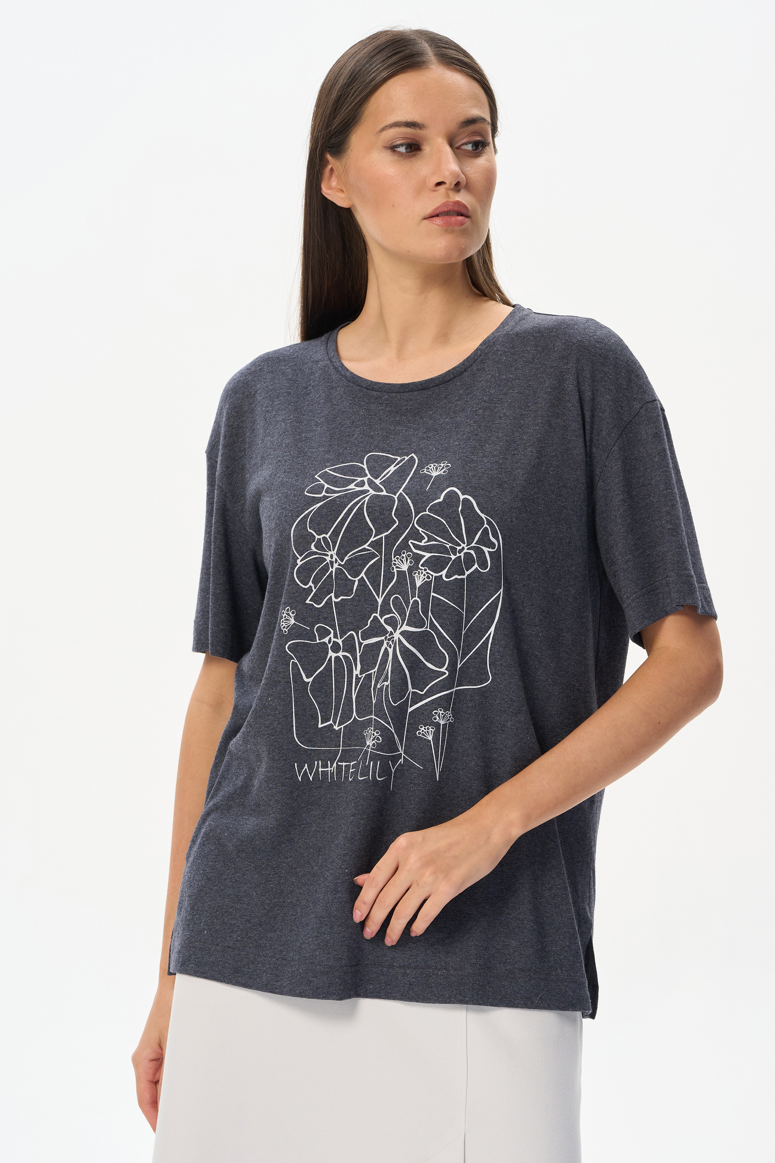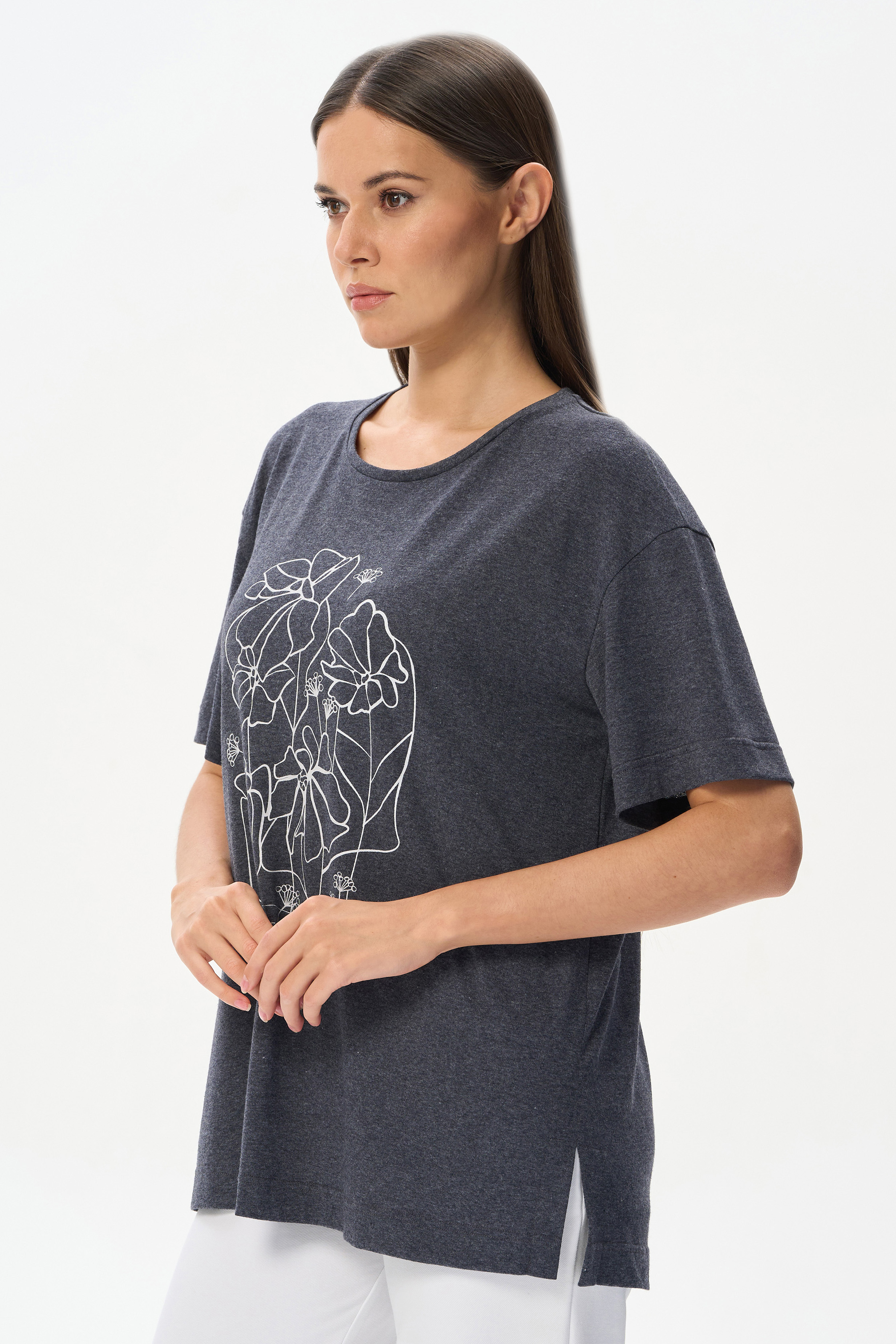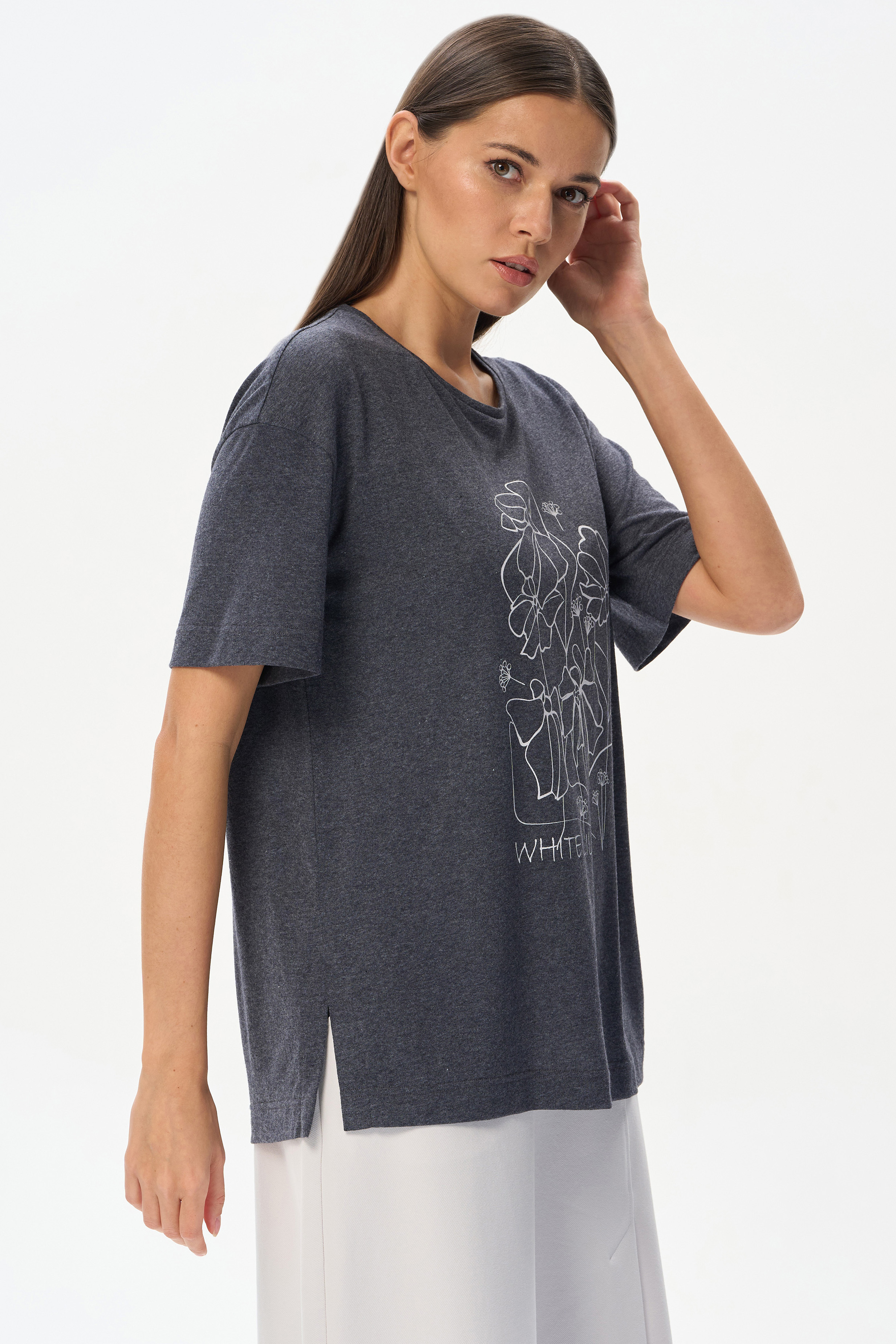 70% хлопок, 30% полиэстер Удлиненная футболка с принтом свободного силуэта из хлопкового меланжевого трикотажного полотна. Широкие рукава длиной до локтя. По низу изделия в боковых швах разрезы. Рост модели 175 см.