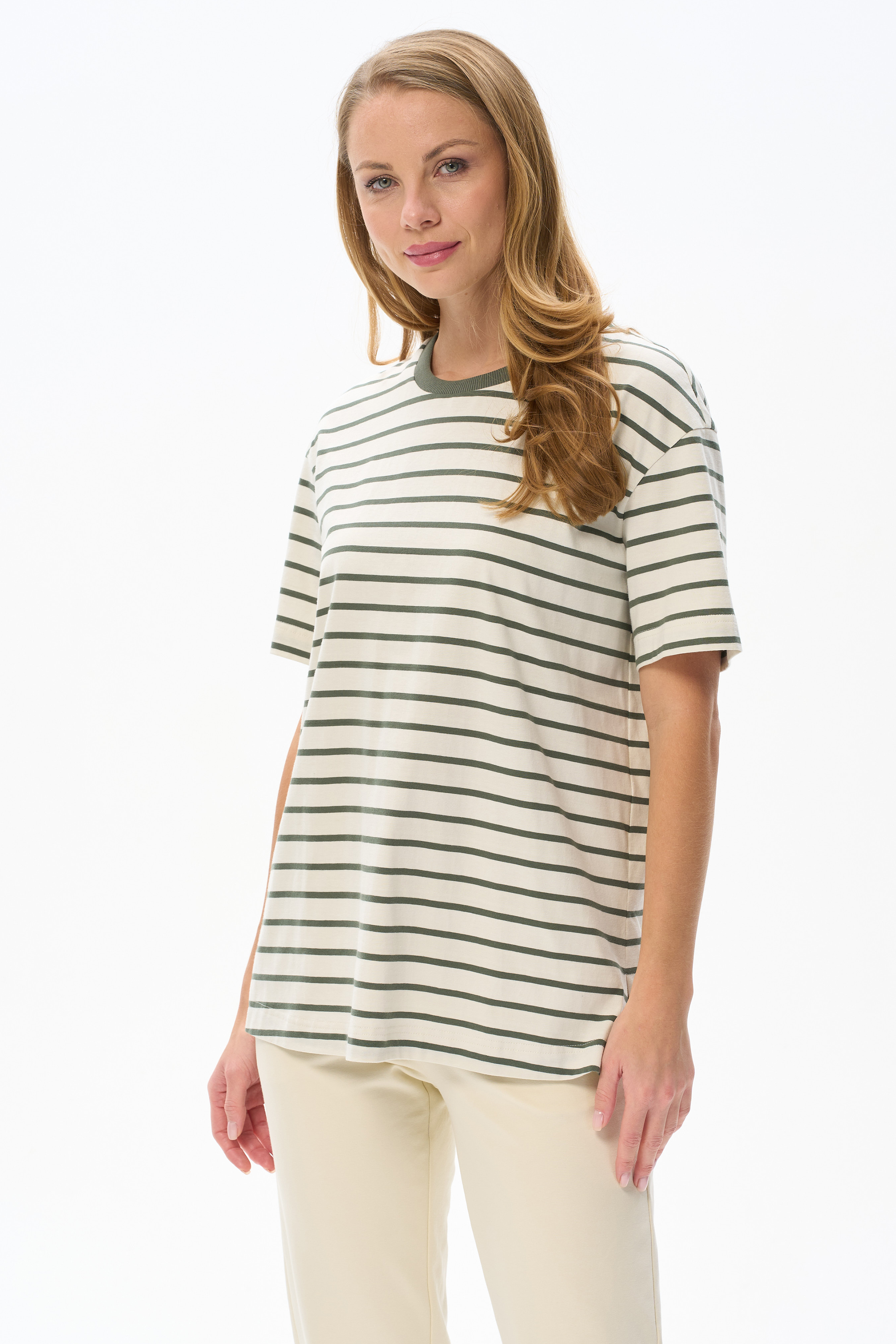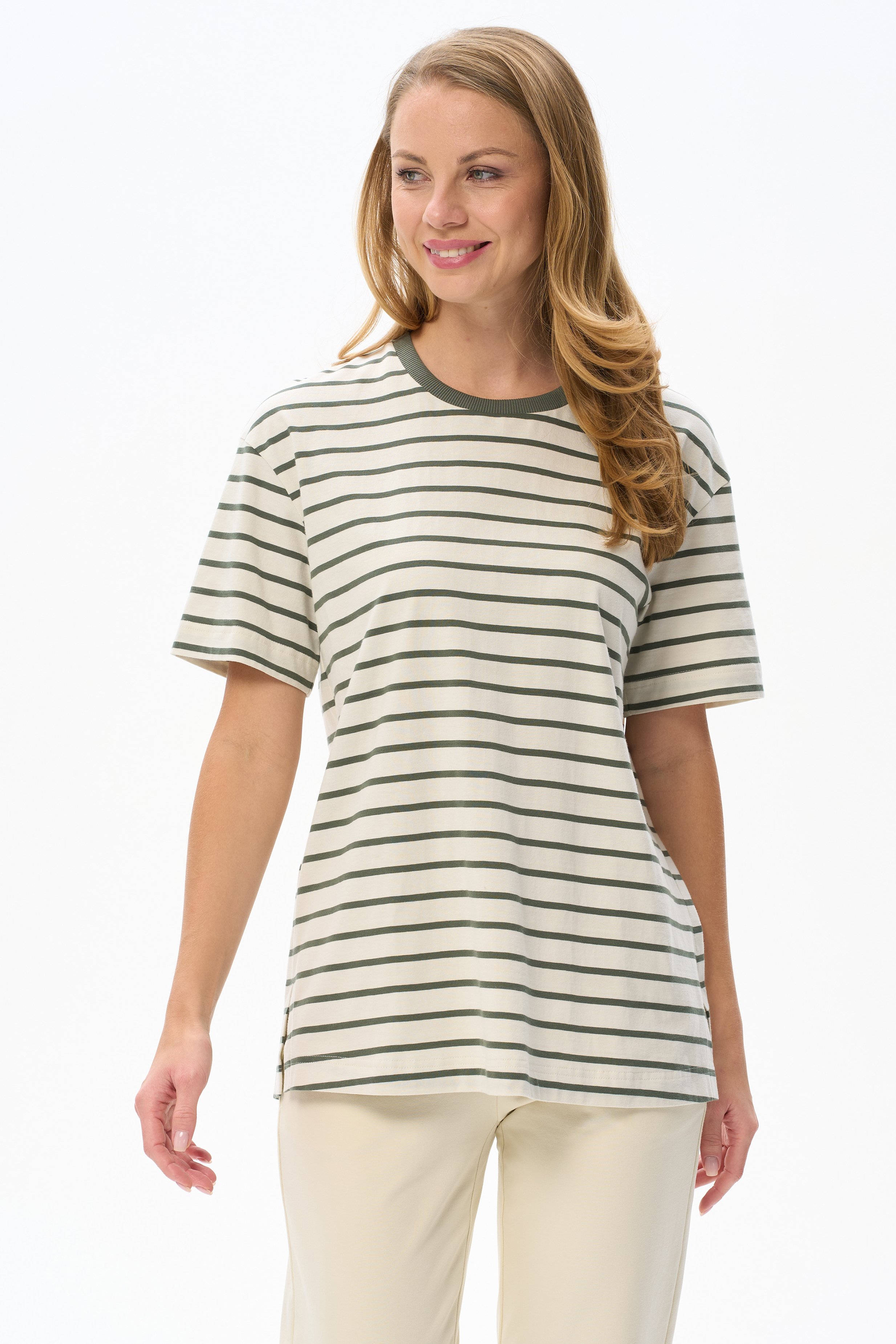 100% хлопок Удлиненная футболка свободного силуэта из плотного хлопкового трикотажного полотна, качества пенье. Круглый вырез горловины обработан хлопковым полотном рибана, широкие рукава. По низу изделия в боковых швах разрезы. Рост модели на фото 178.
