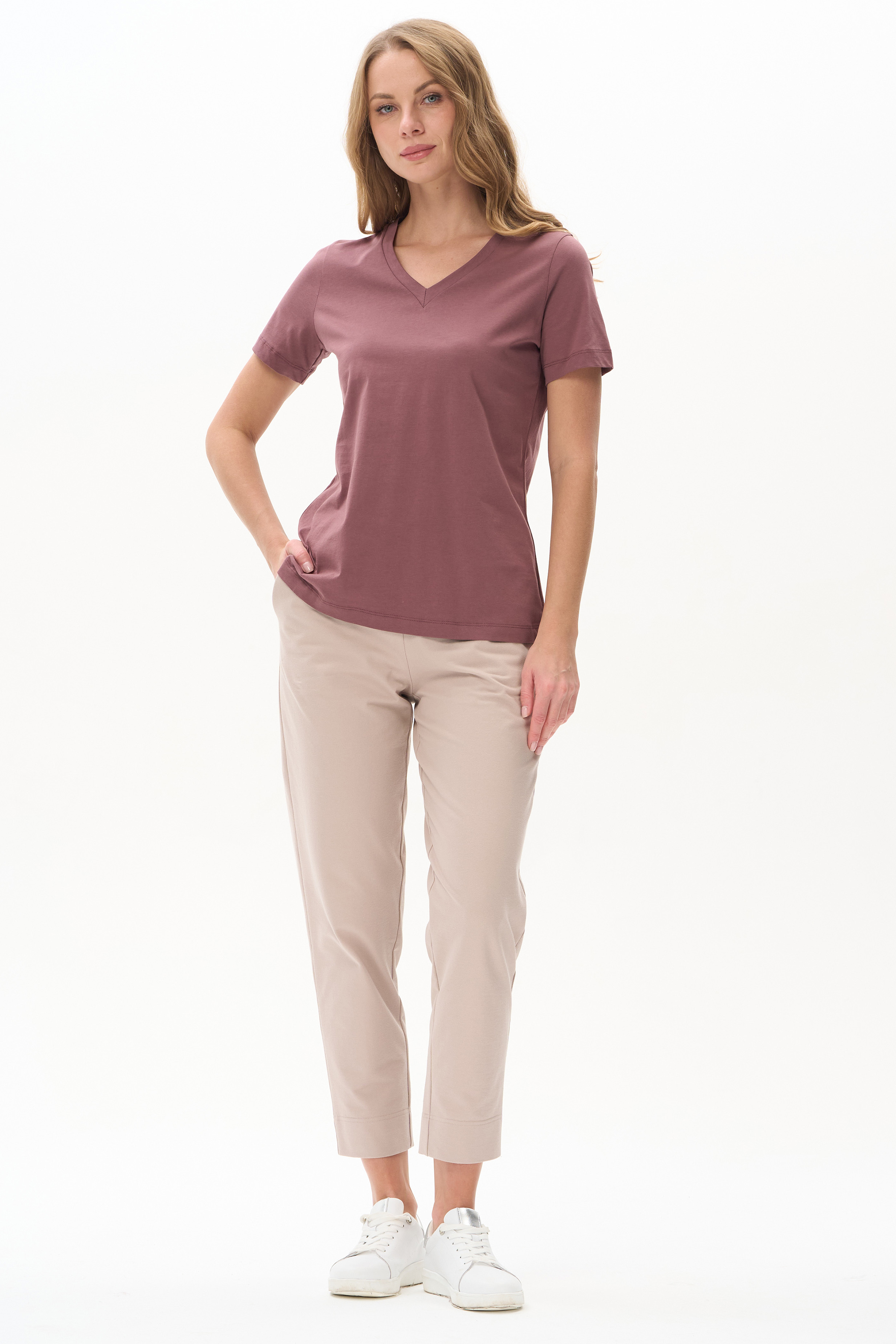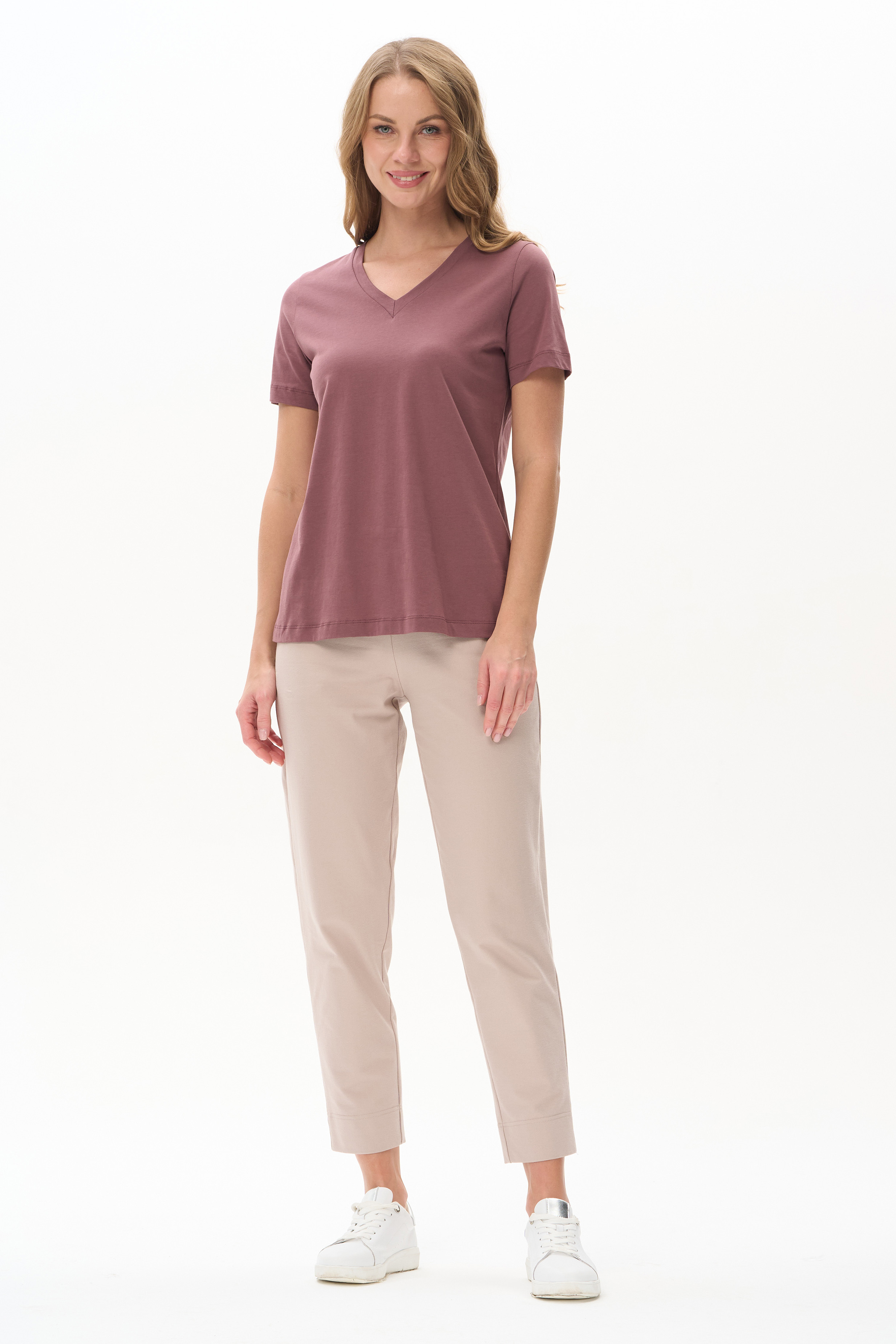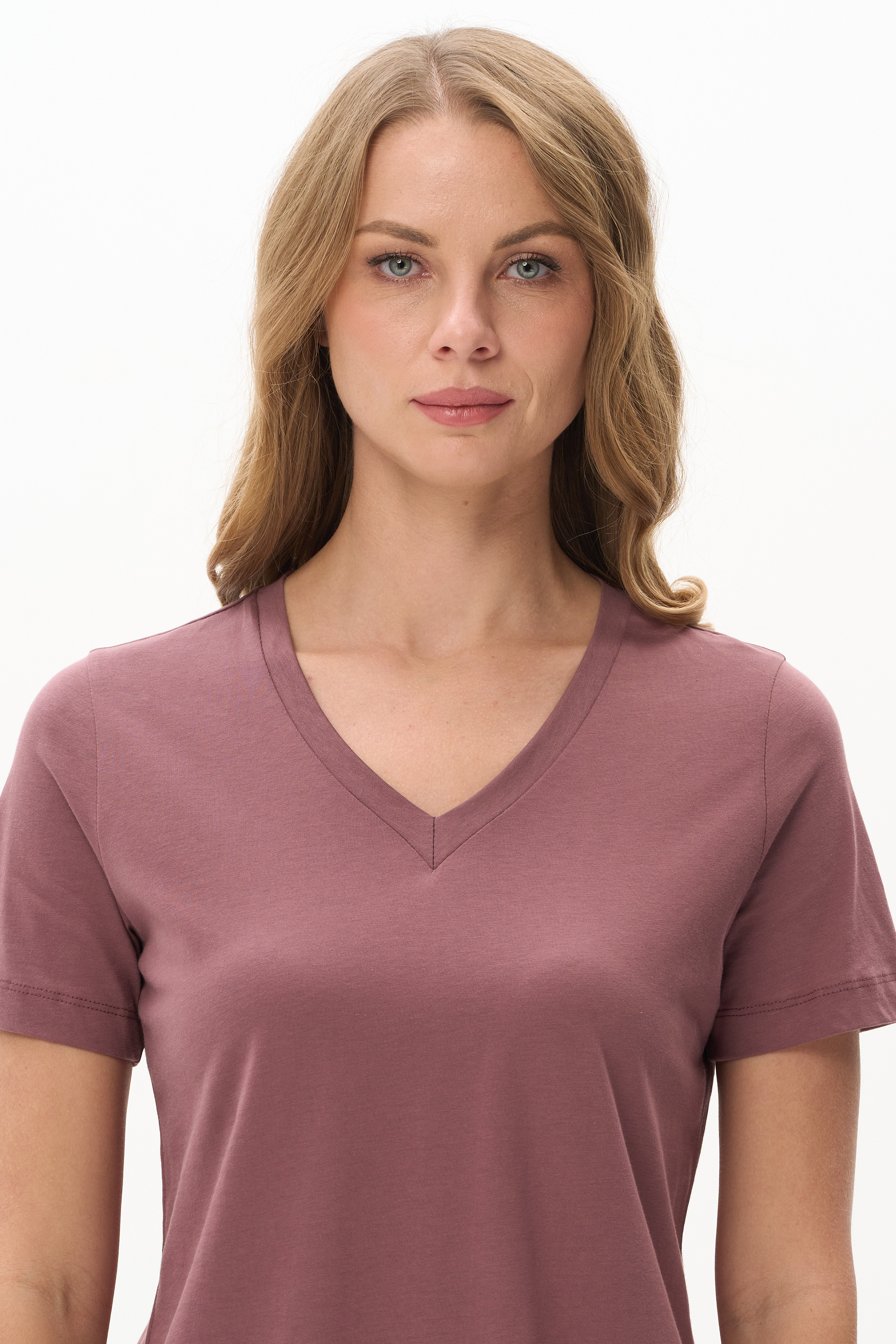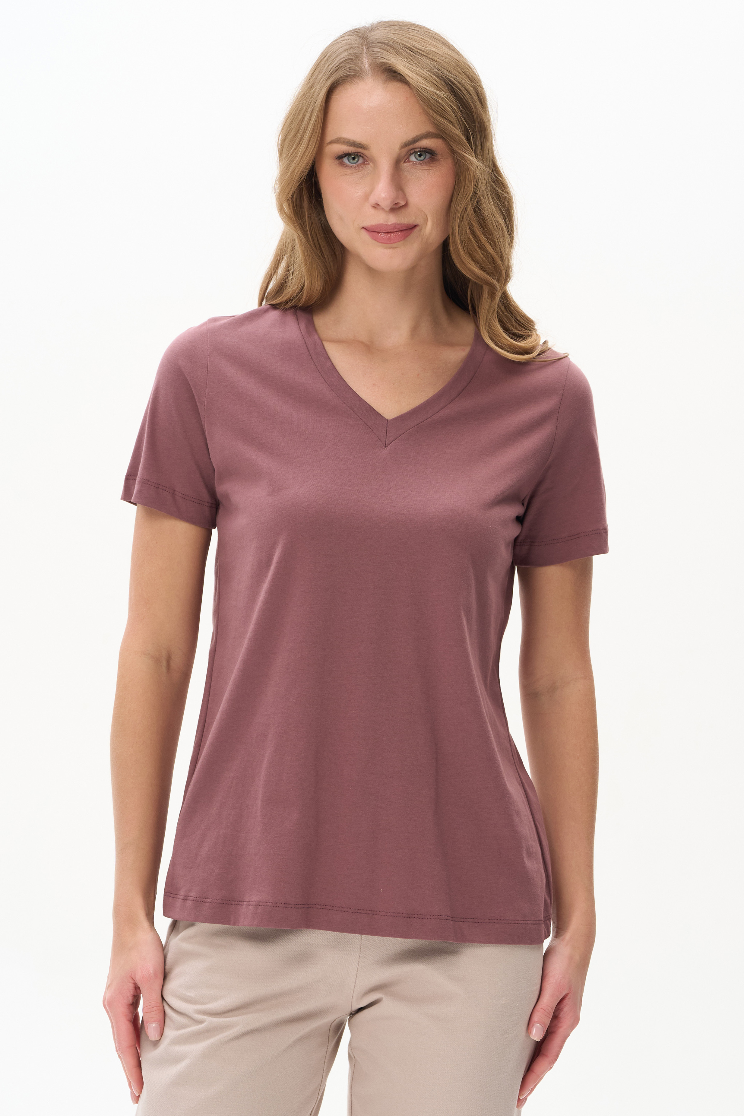 100% хлопок Повседневная базовая однотонная футболка из хлопкового полотна качества пенье 150 гр в оттенке Гортензия. Модель с V-образным вырезом горловины и втачными короткими рукавами. Рост модели 175 см.