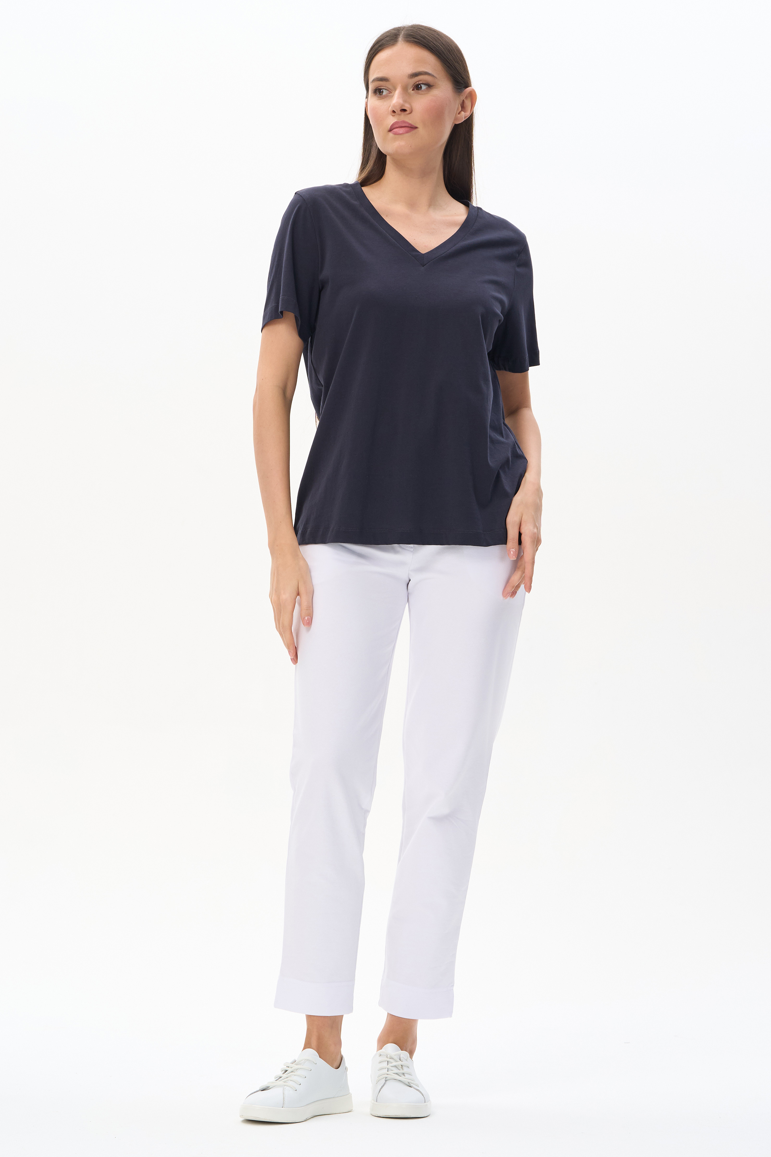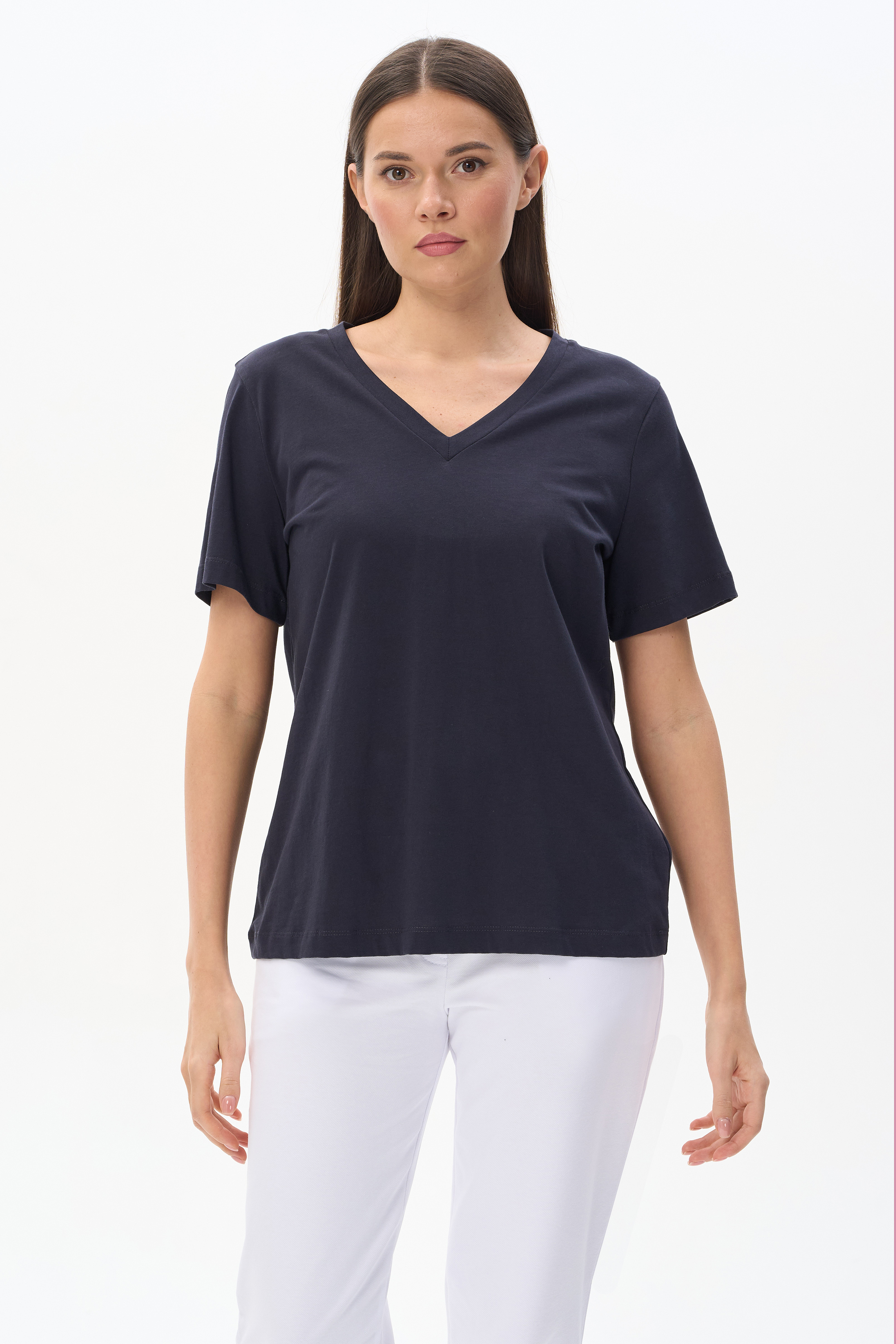 100% хлопок Футболка из хлопкового полотна качества ПЕ, плотностью 150 гр. V-образный вырез горловины, короткие втачные рукава. Рост модели 170 см.