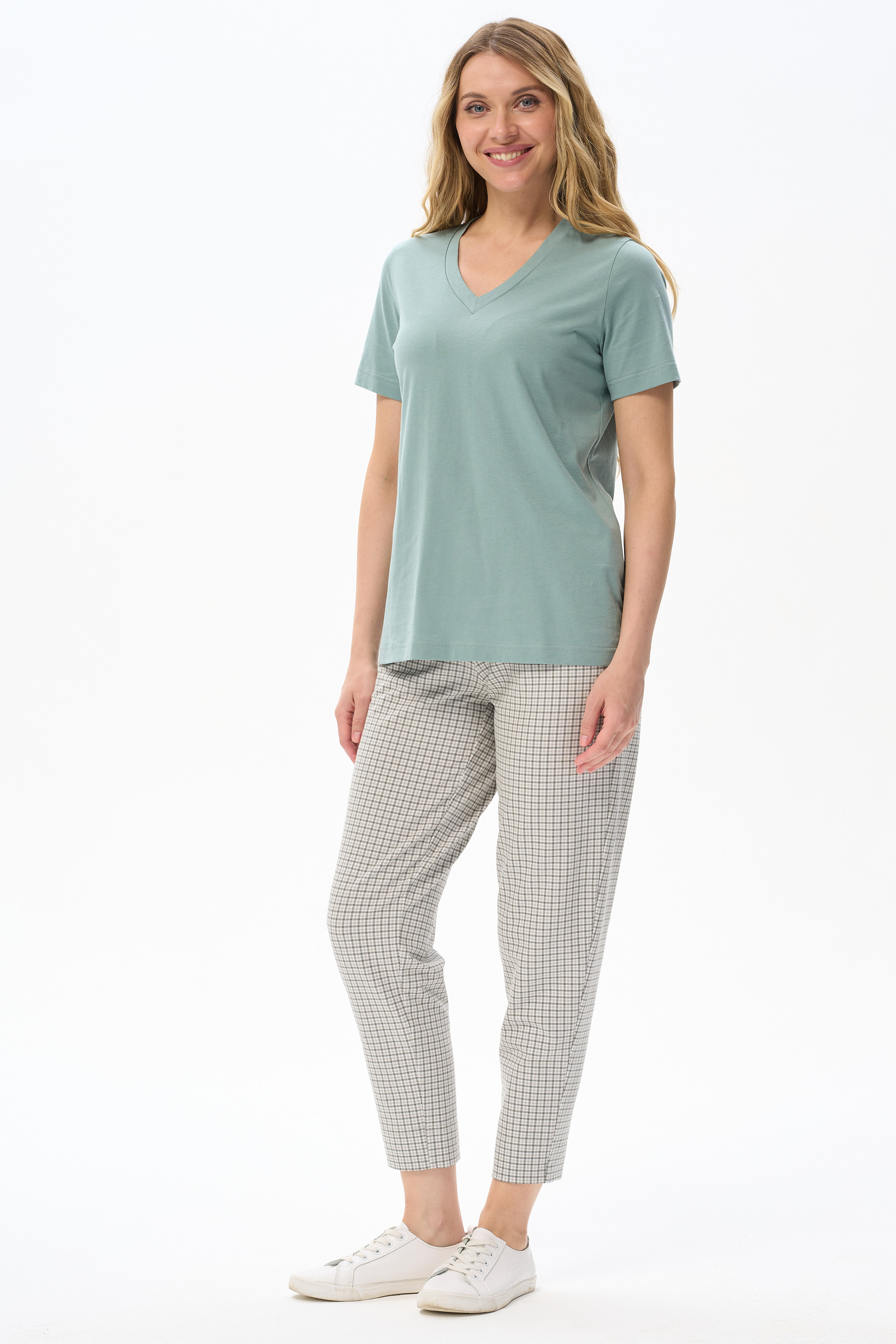 100% хлопок Футболка выполнена из хлопкового полотна. V-образный вырез горловины, короткие рукава. Рост модели на фото 170