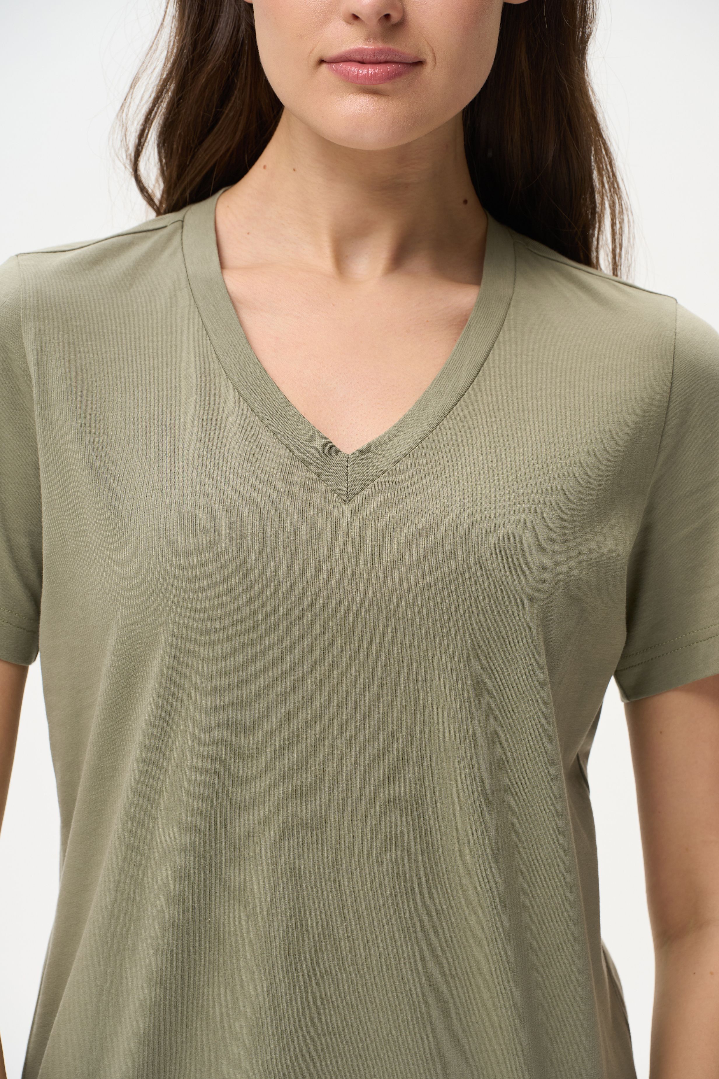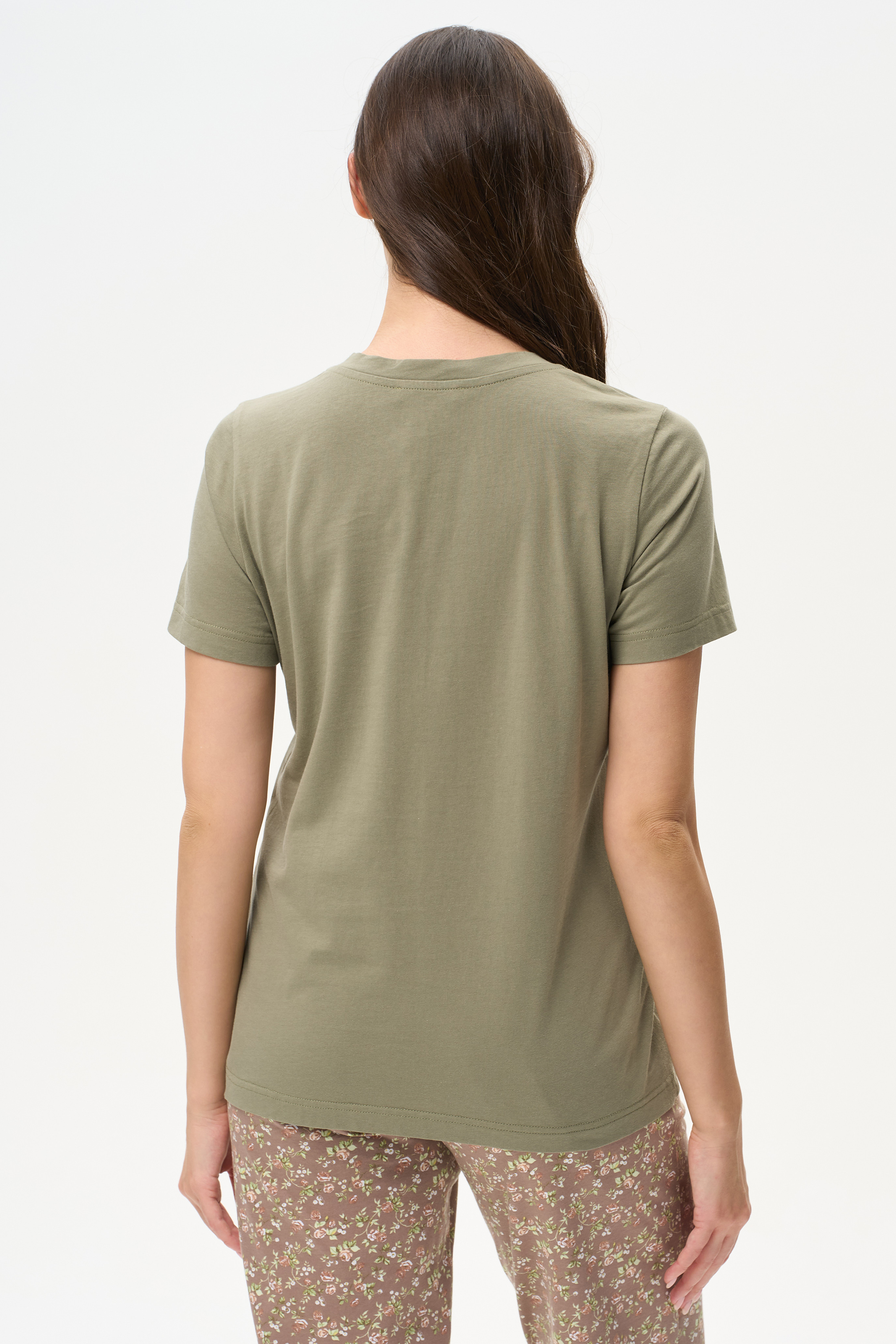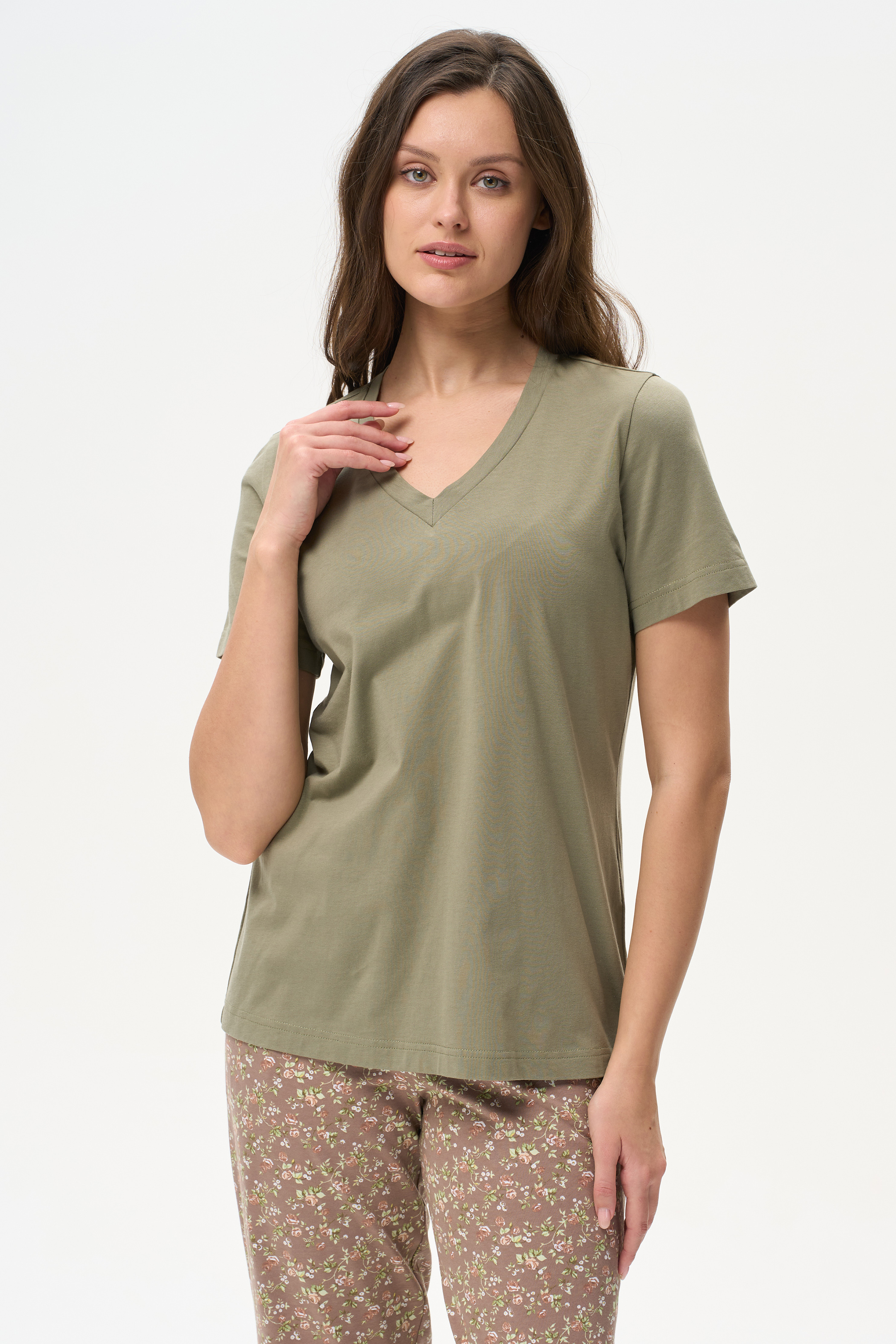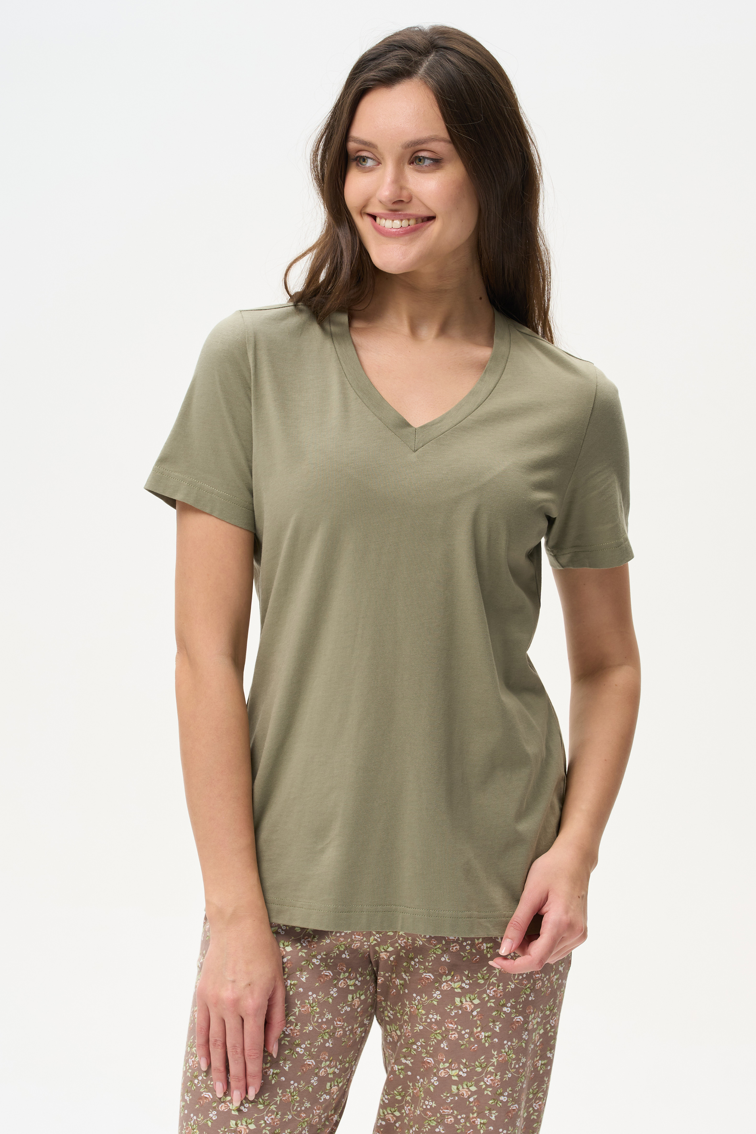 100% хлопок Футболка выполнена из хлопкового полотна. V-образный вырез горловины, короткие рукава. Рост модели на фото 178 см