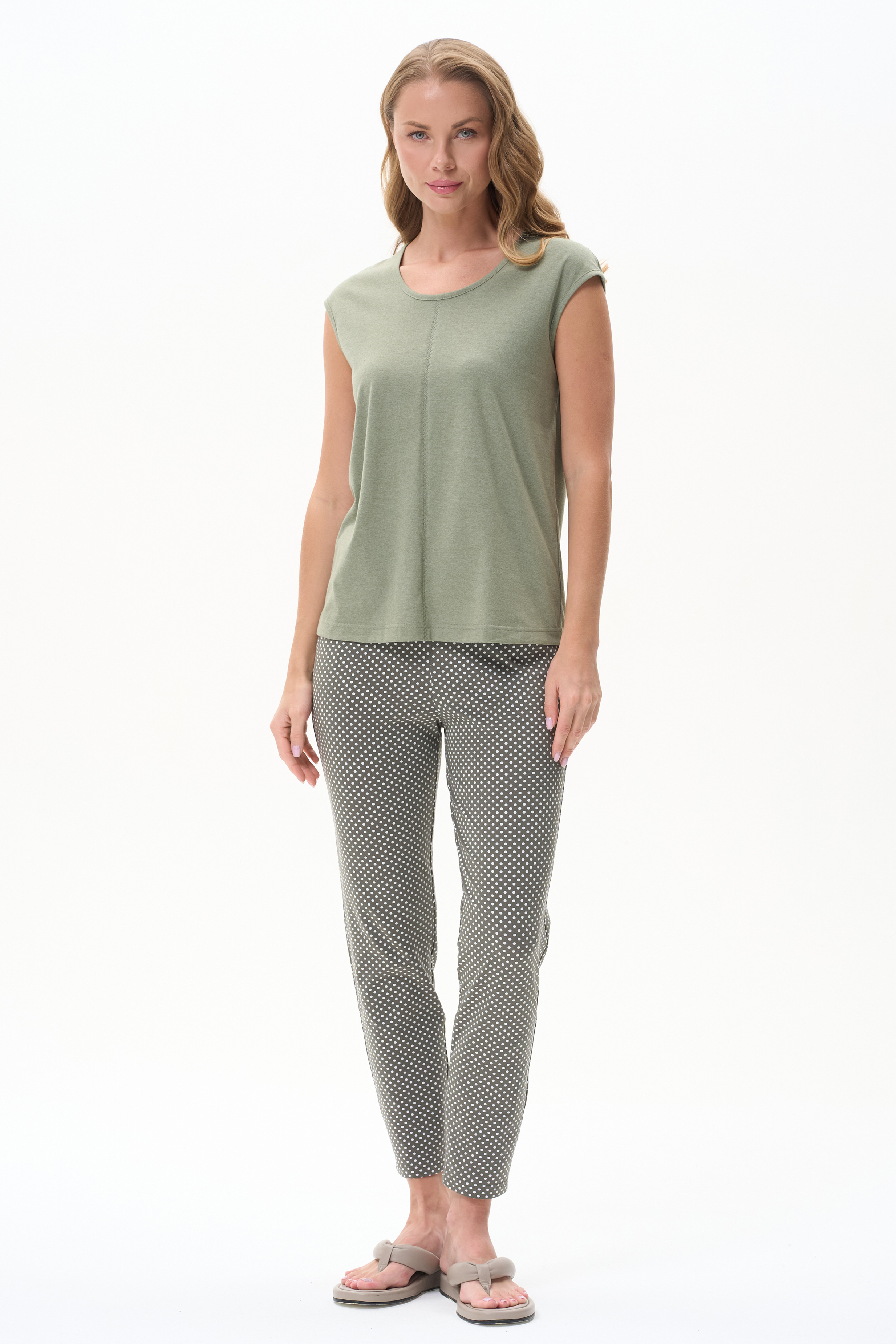 70% хлопок/ 30% полиэстер Футболка выполнена из хлопкового меланжевого трикотажного полотна. Средние швы полочки и спинки декорированы мережкой. Модель с круглой горловиной и цельнокроеным коротким рукавом. Рост модели на фото 178см.