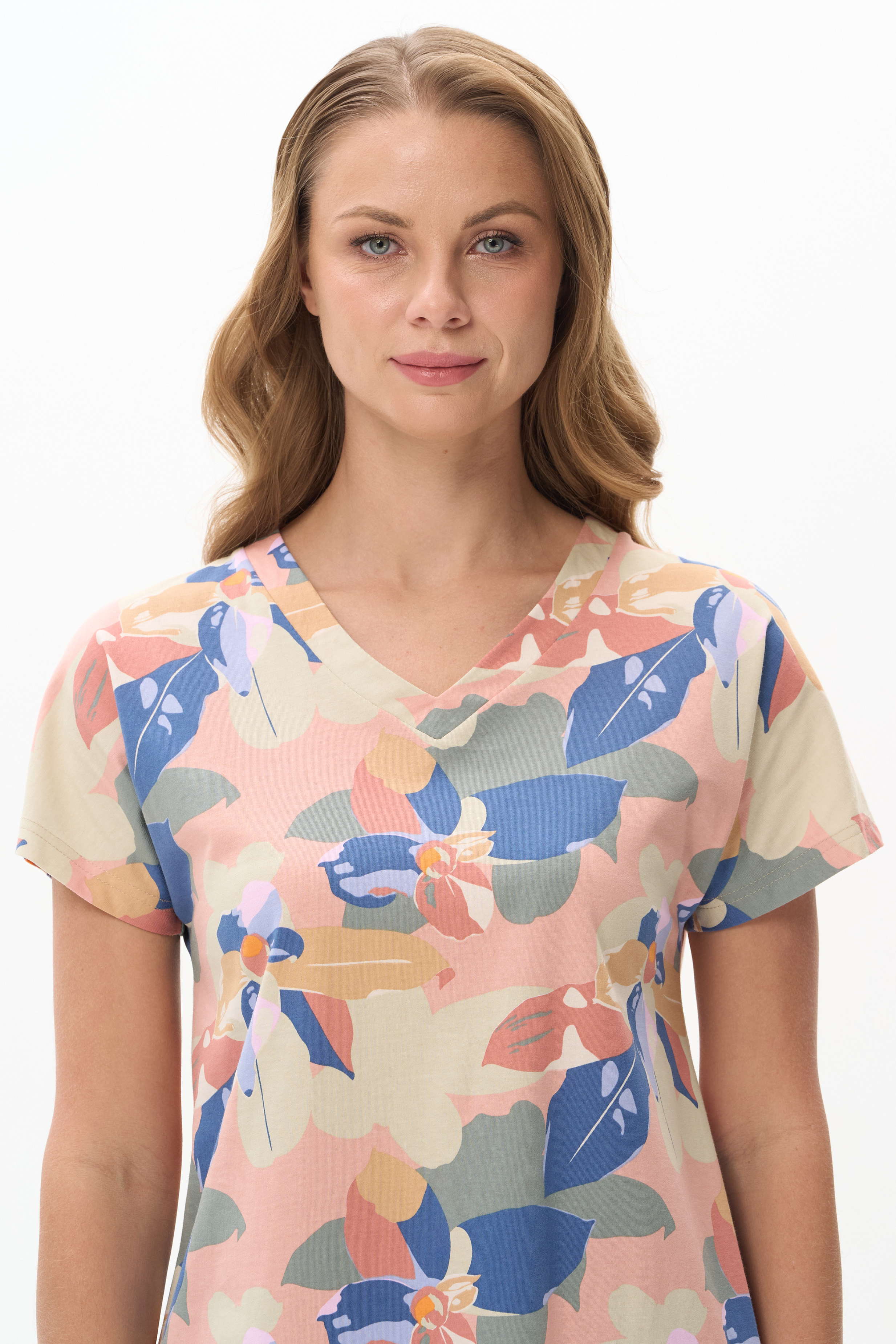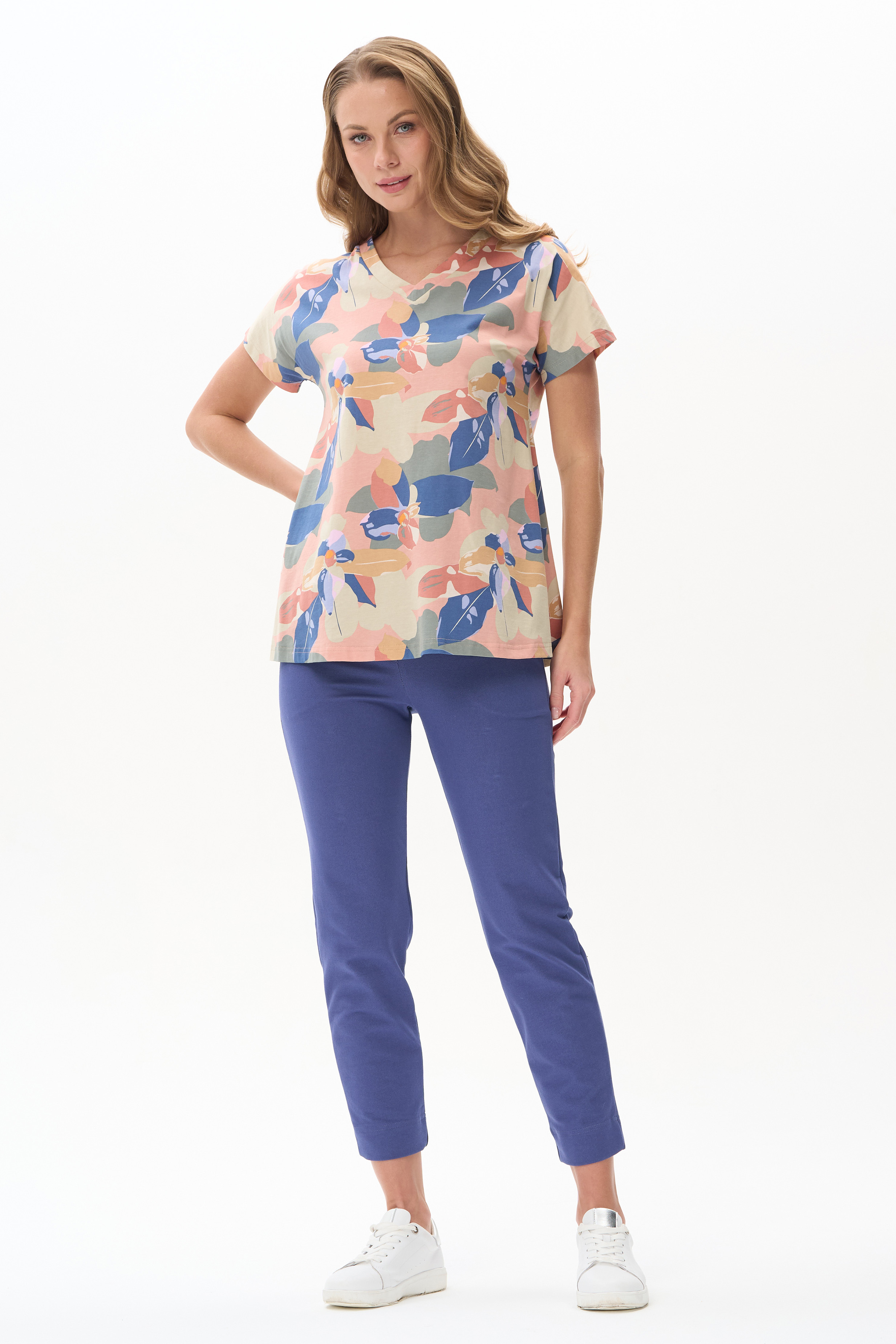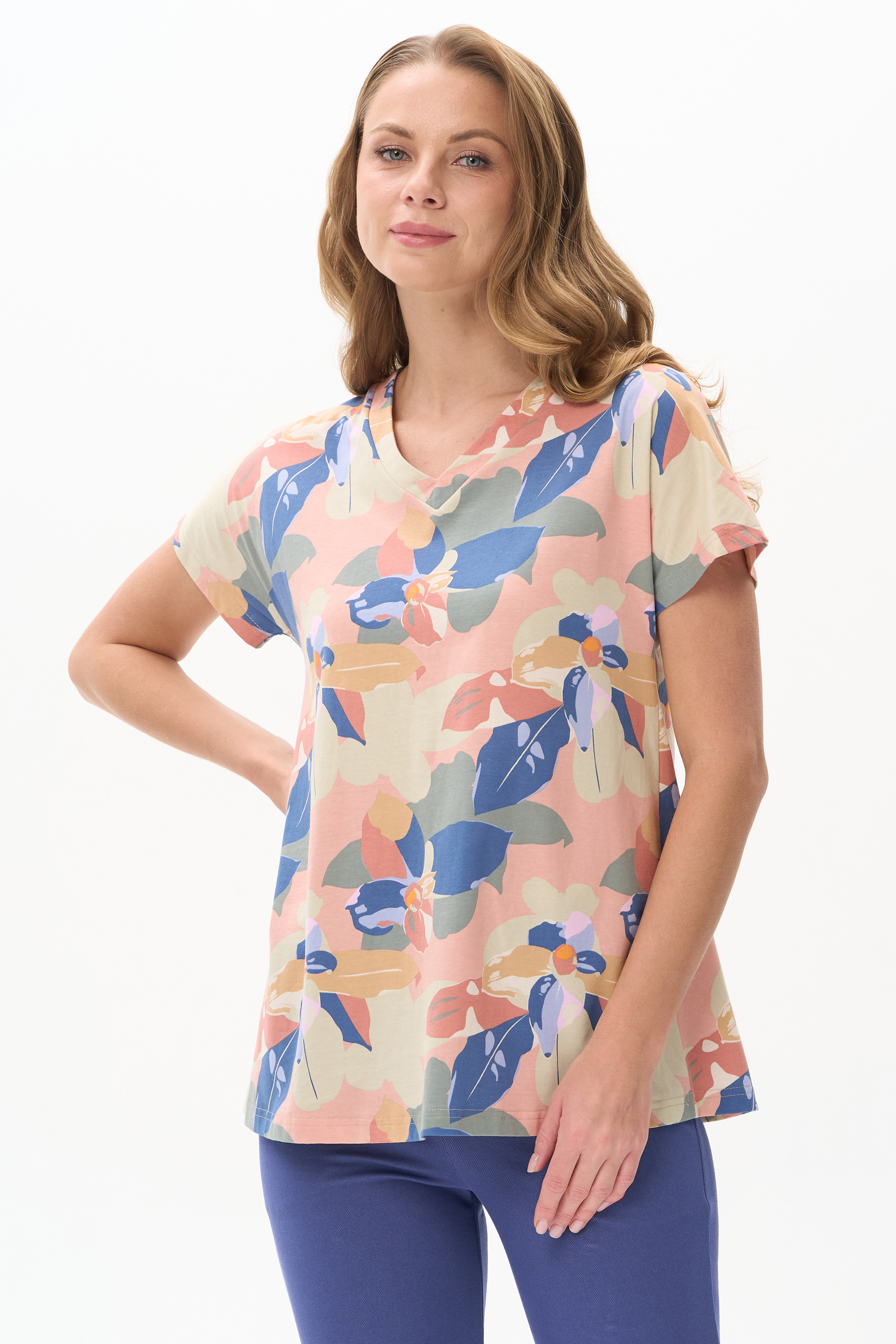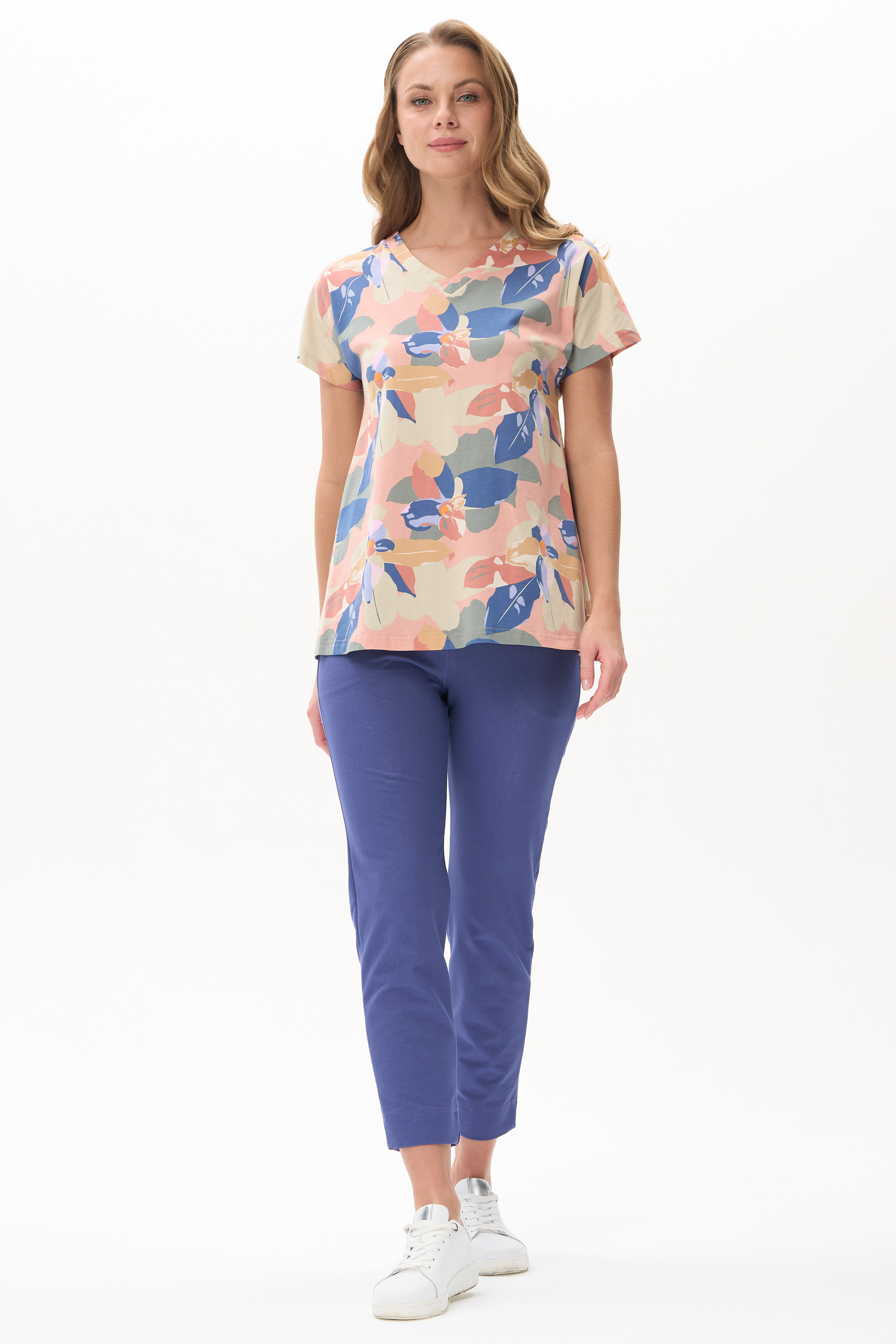 100% хлопок Свободная футболка из хлопкового трикотажного полотна. V-образный вырез горловины оформлен планкой, короткие цельнокроенные рукава. Рост модели на фото 175.