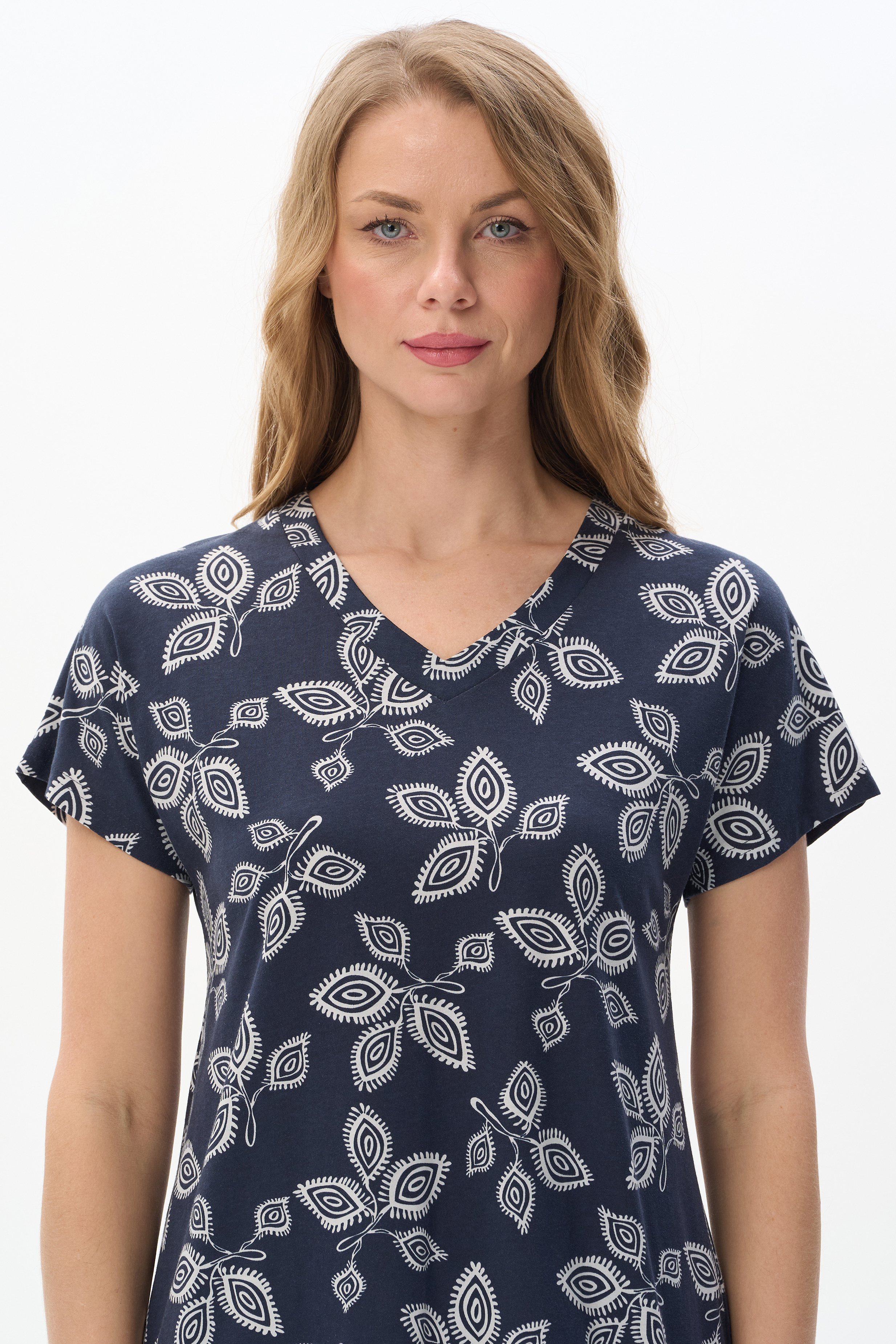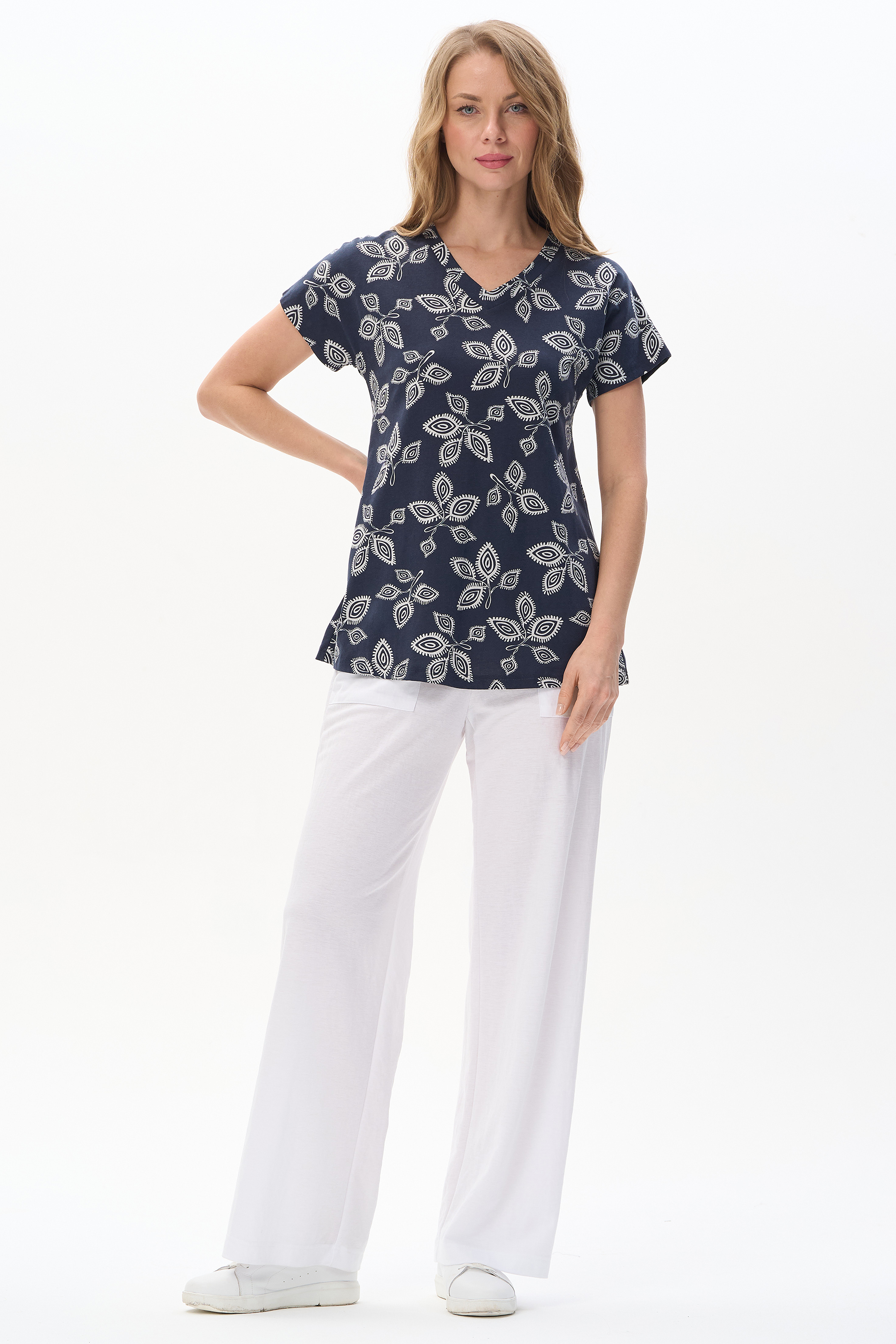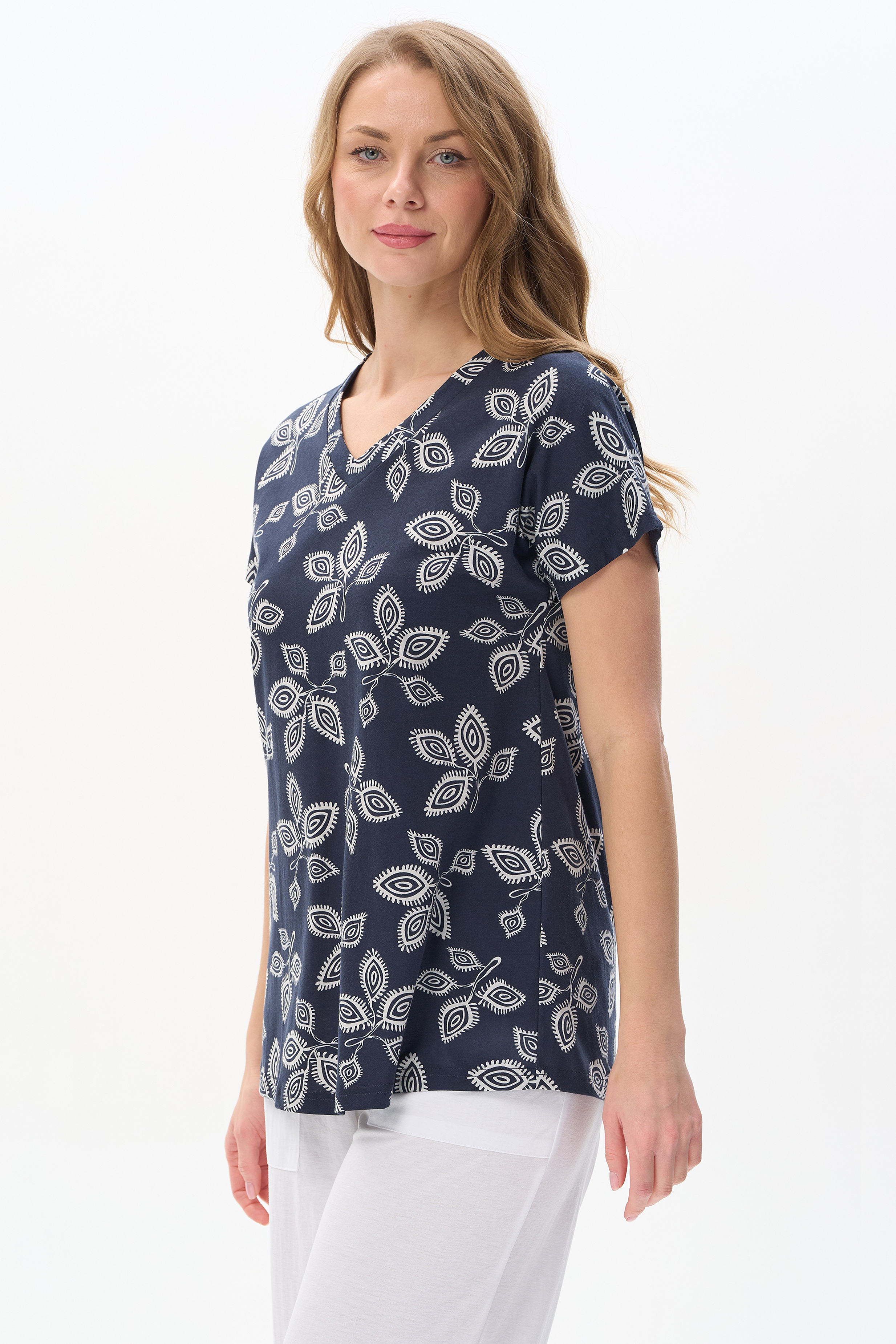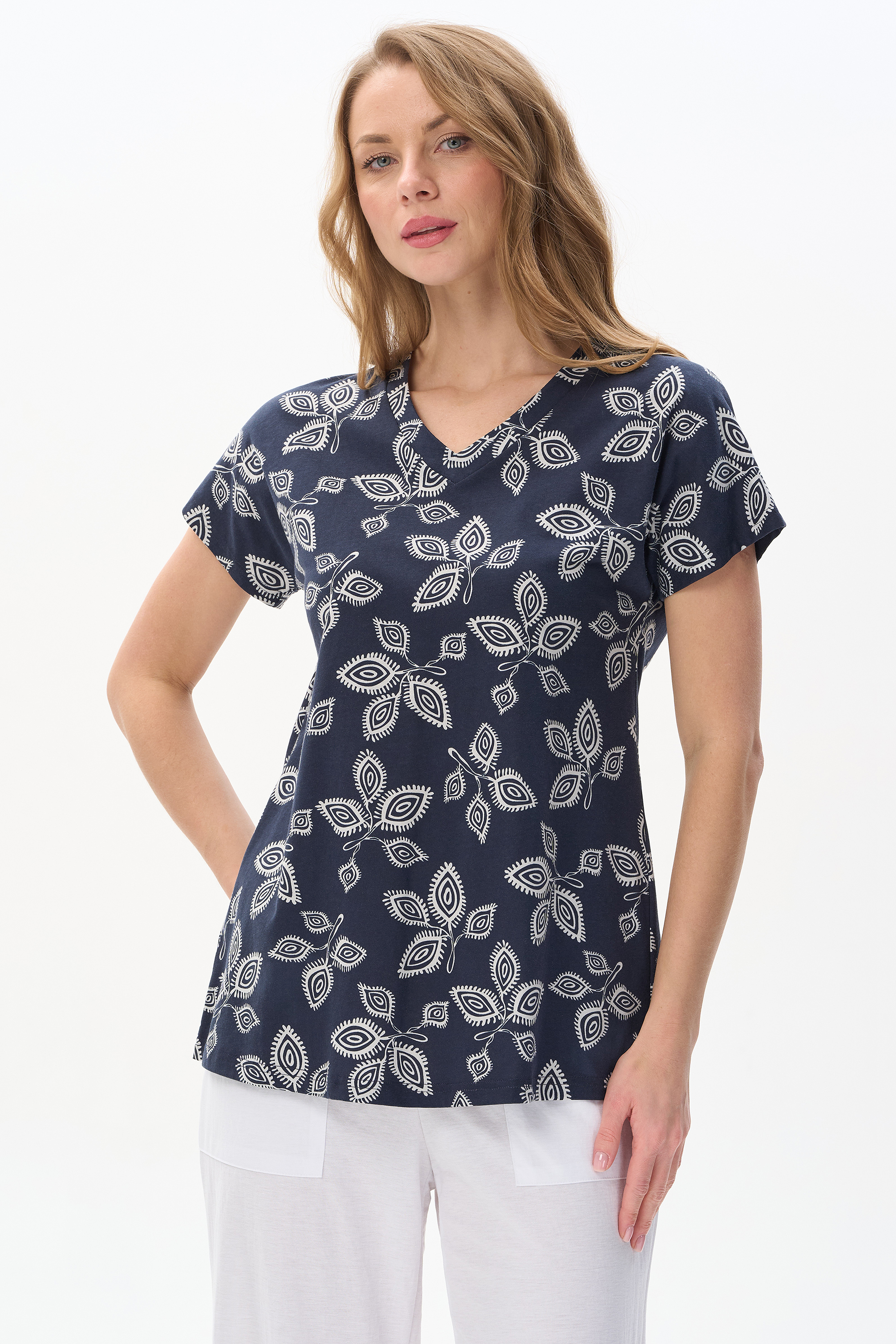 100% хлопок Свободная футболка из хлопкового трикотажного полотна. V-образный вырез горловины оформлен планкой, короткие цельнокроенные рукава. Рост модели на фото 177.