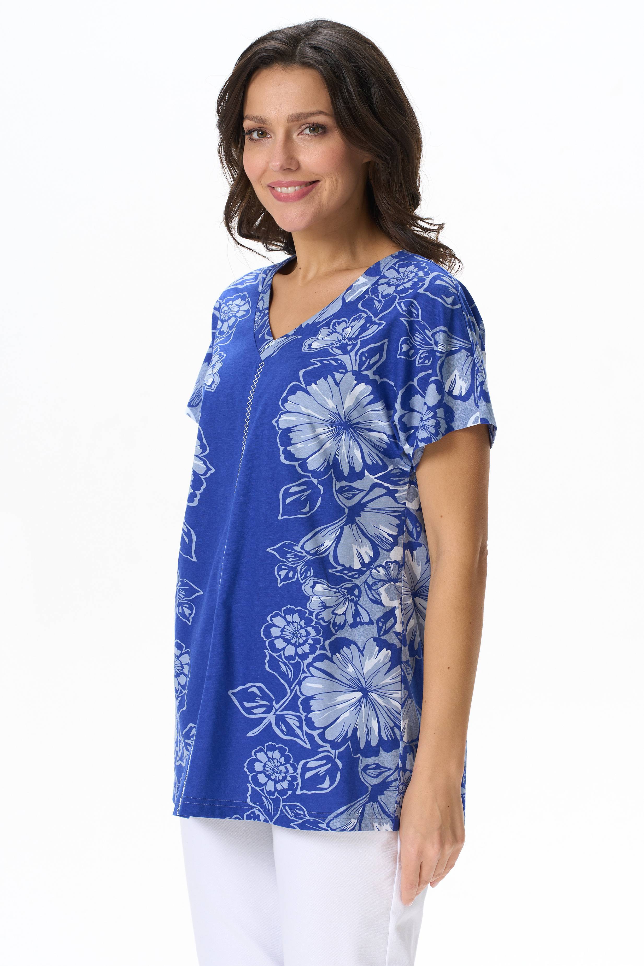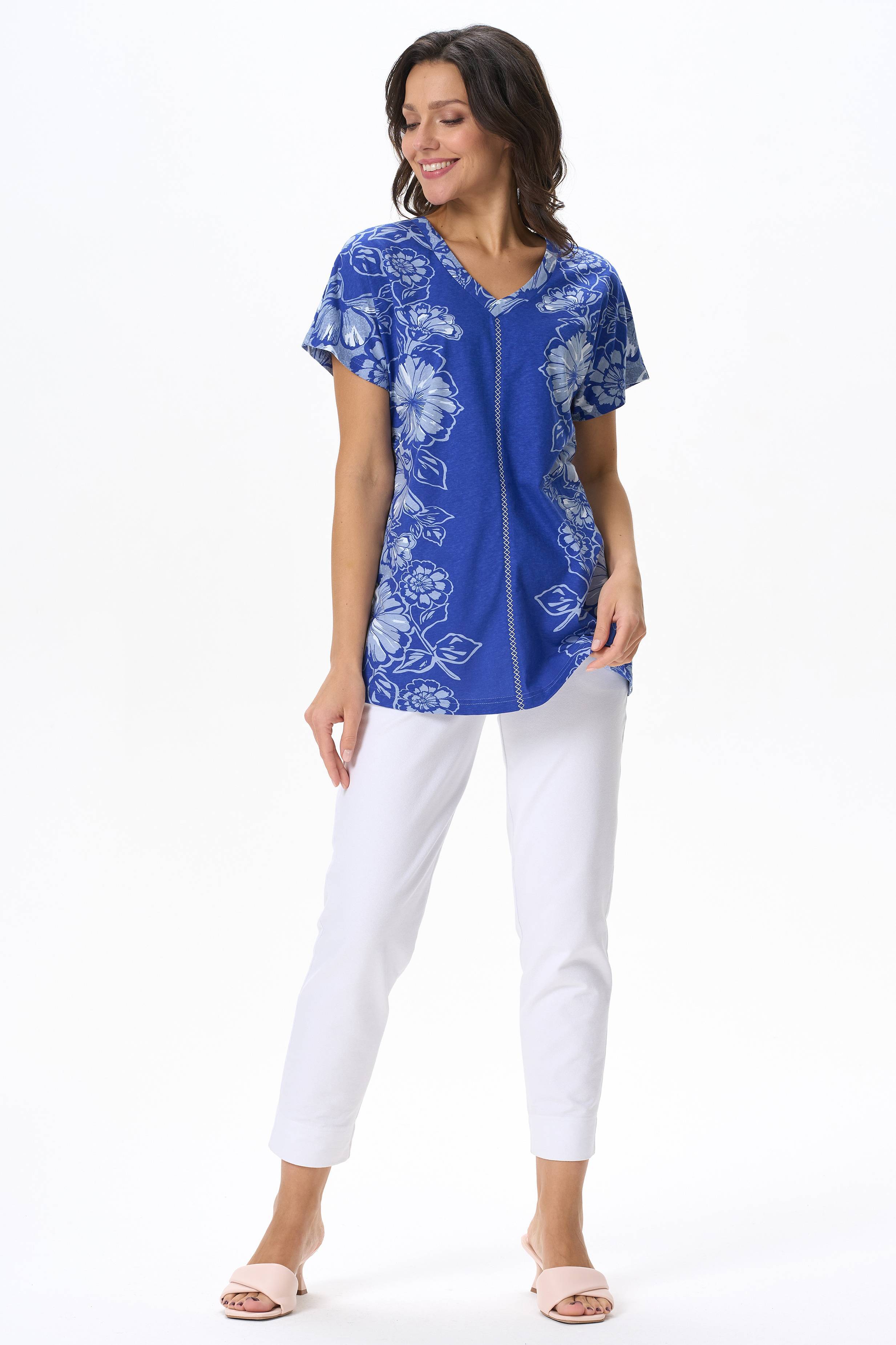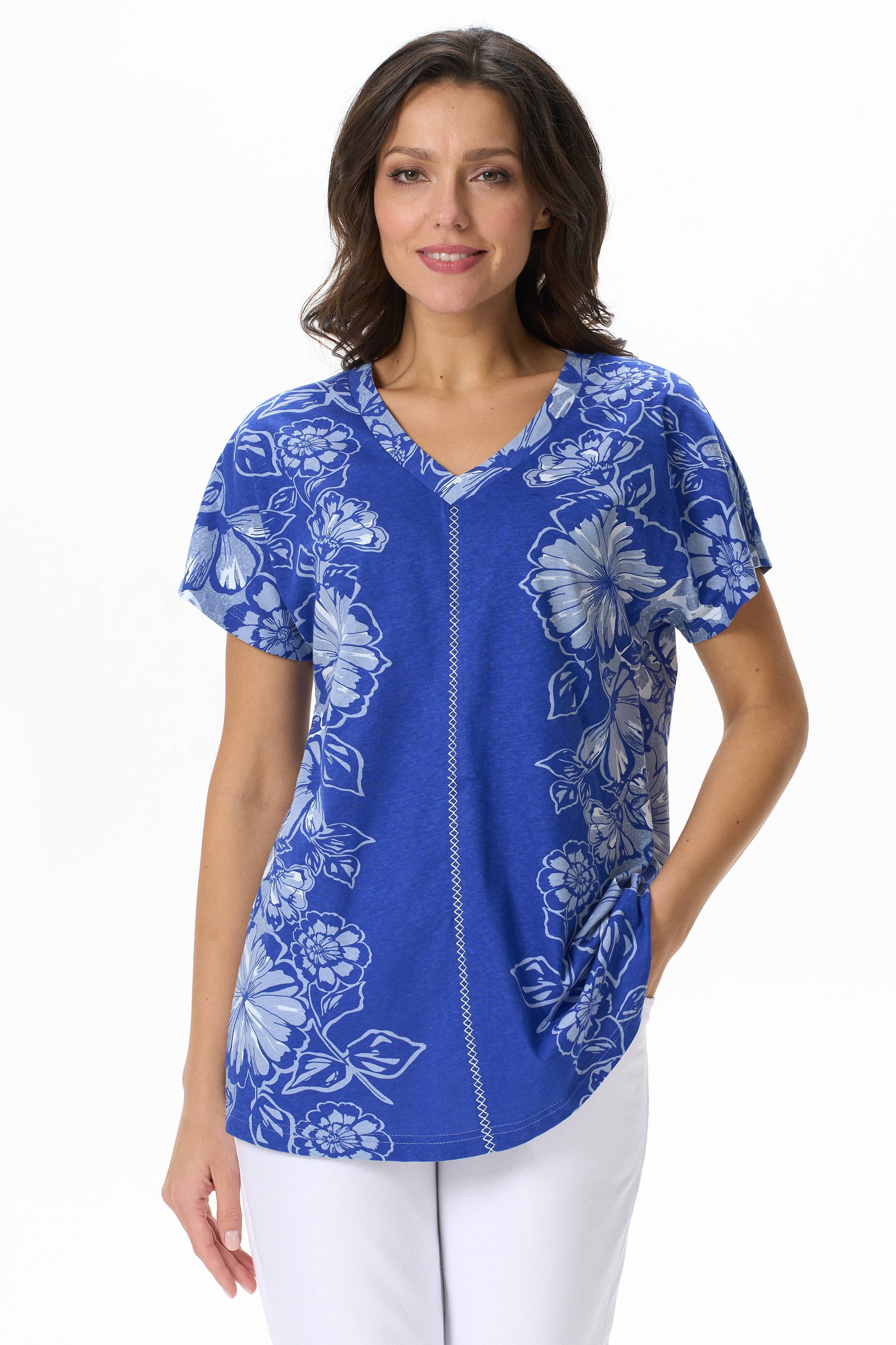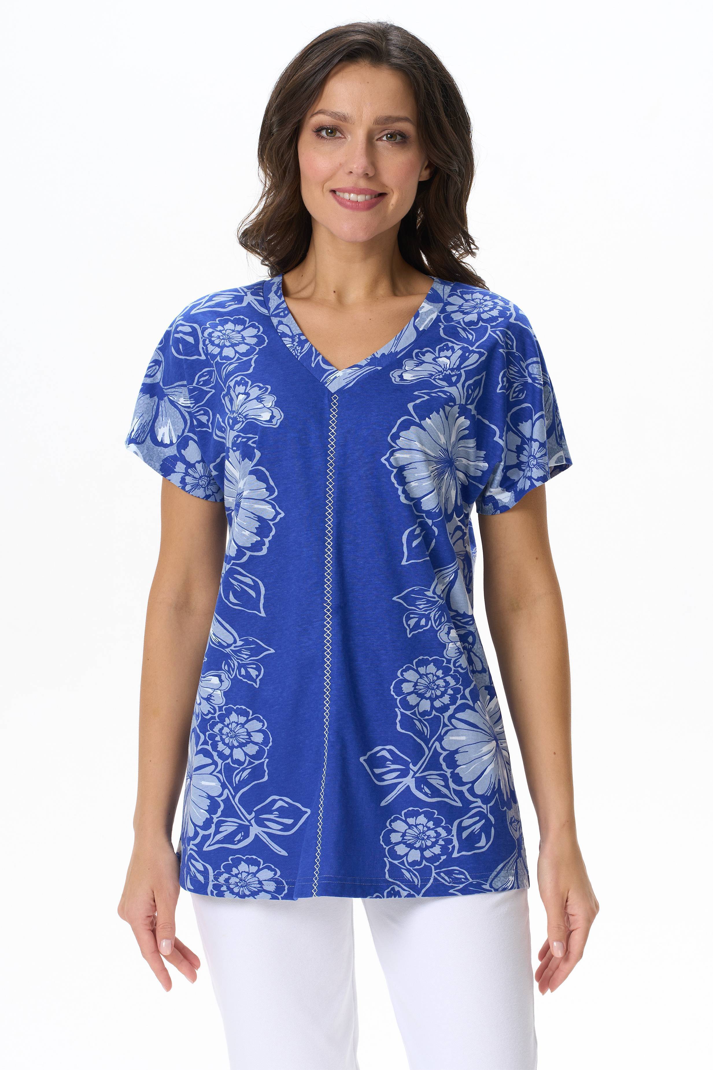 100% хлопок Свободная футболка из хлопкового трикотажного полотна. V-образный вырез горловины оформлен планкой, короткие цельнокроенные рукава. Средний шов полочки декорирован мережкой. Рост модели на фото 170.