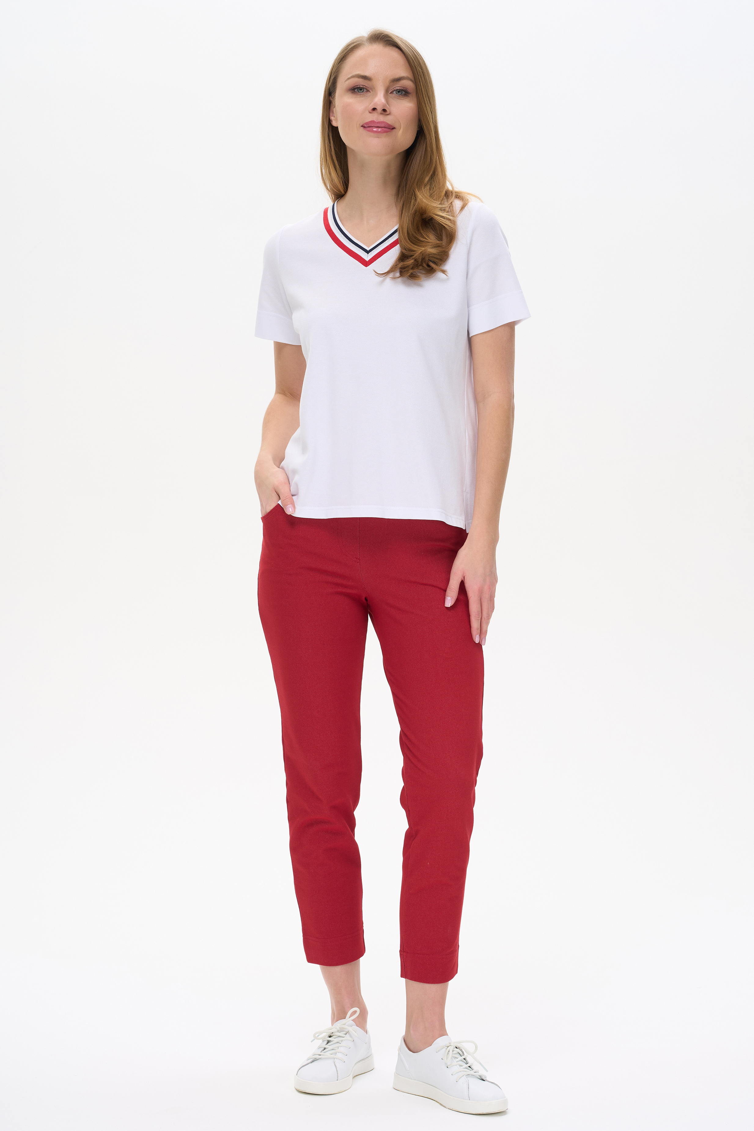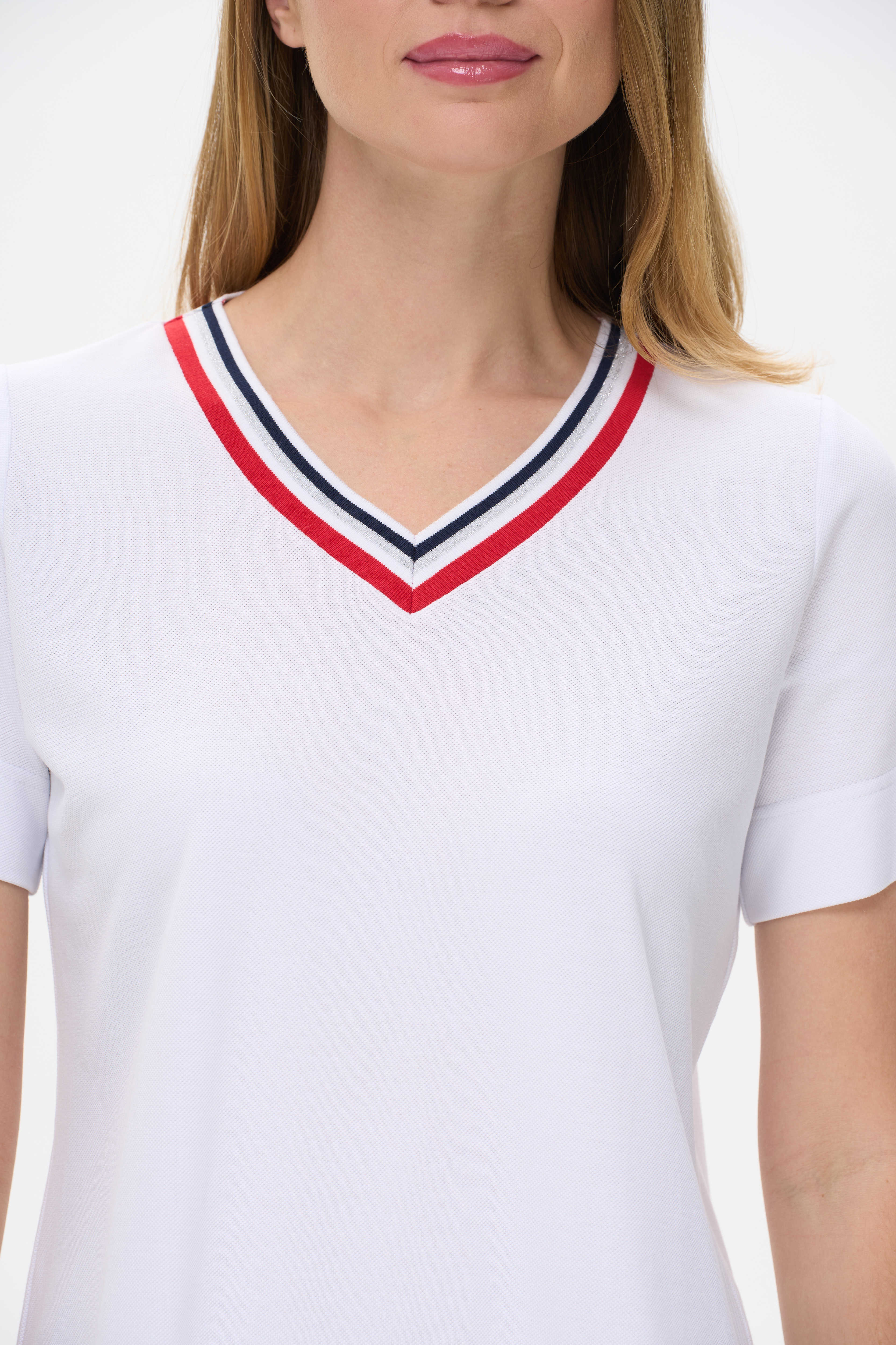 100% хлопок Футболка из однотонного пике 190 гр качества ПЕ в чистом белом оттенке. Модель свободная, прямого силуэта, V-образный вырез горловины оформлен декоративной тесьмой, рукава короткие. Мягкое, фактурное, дышащее полотно обеспечивает комфорт и приятные ощущения. Рост модели 175 см.