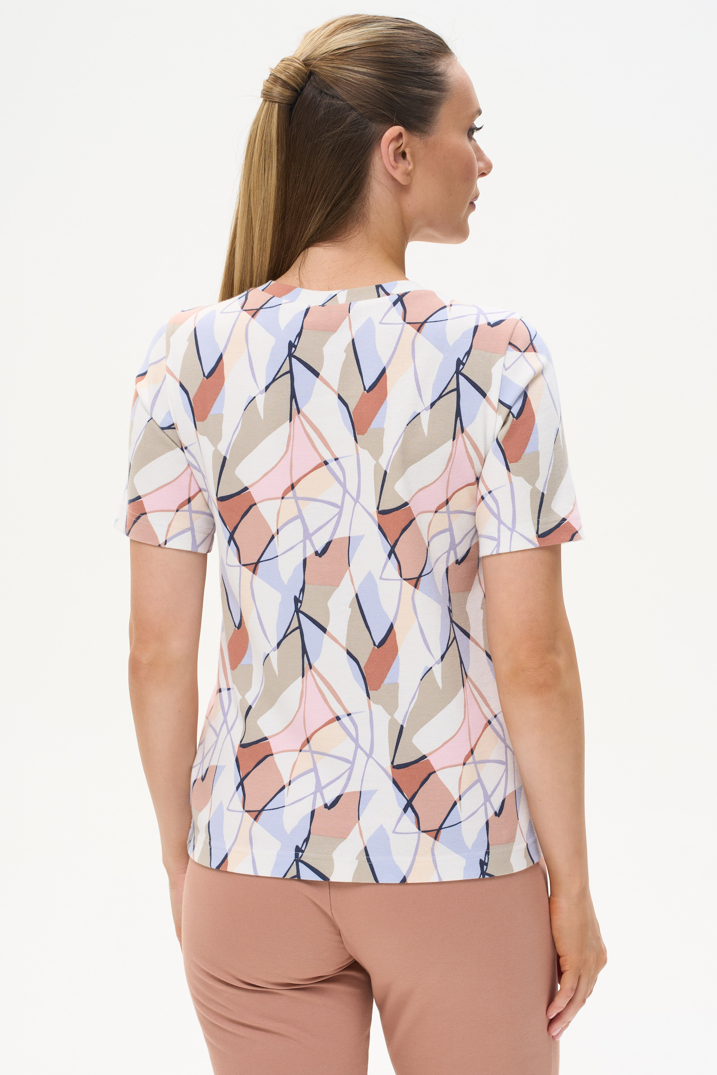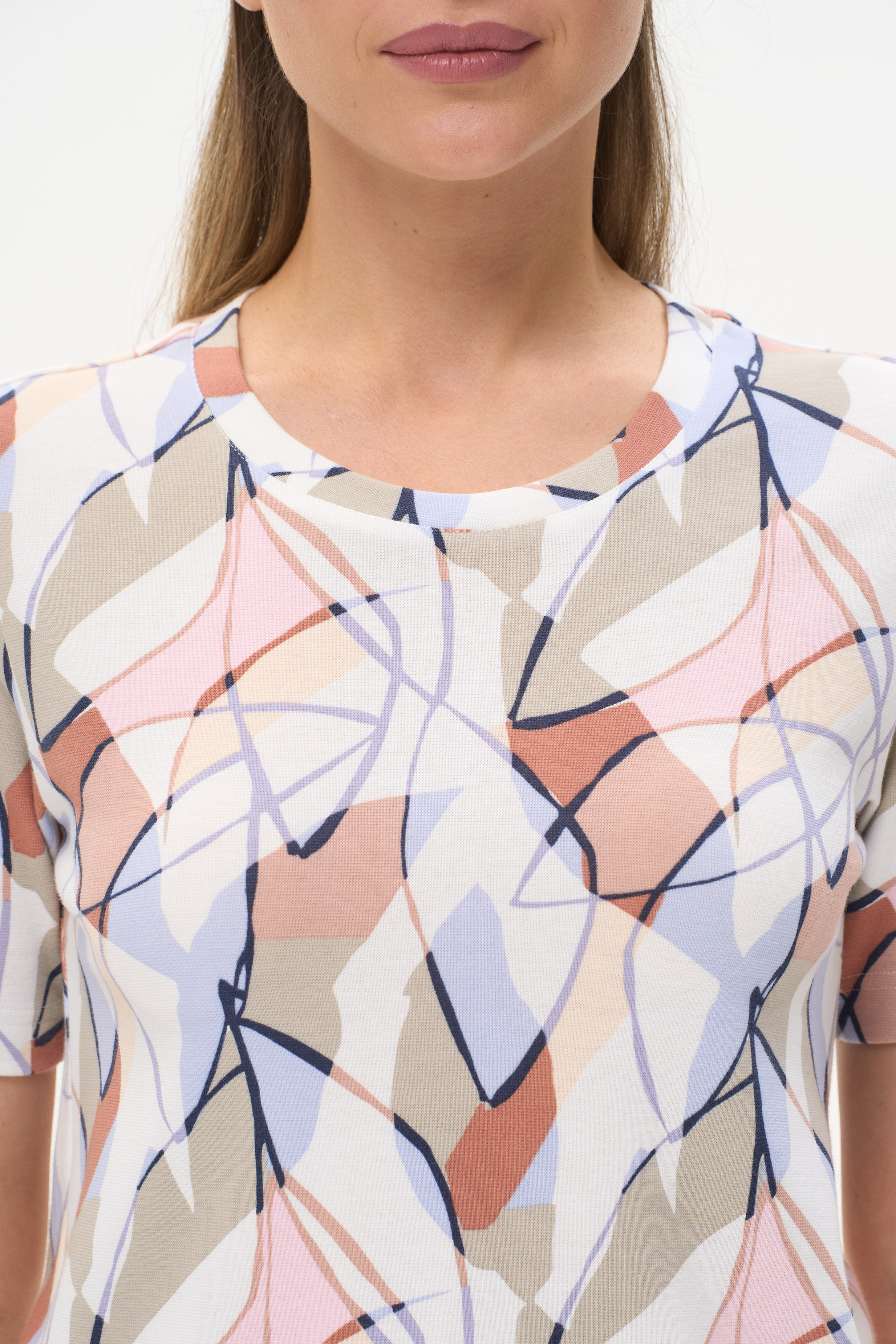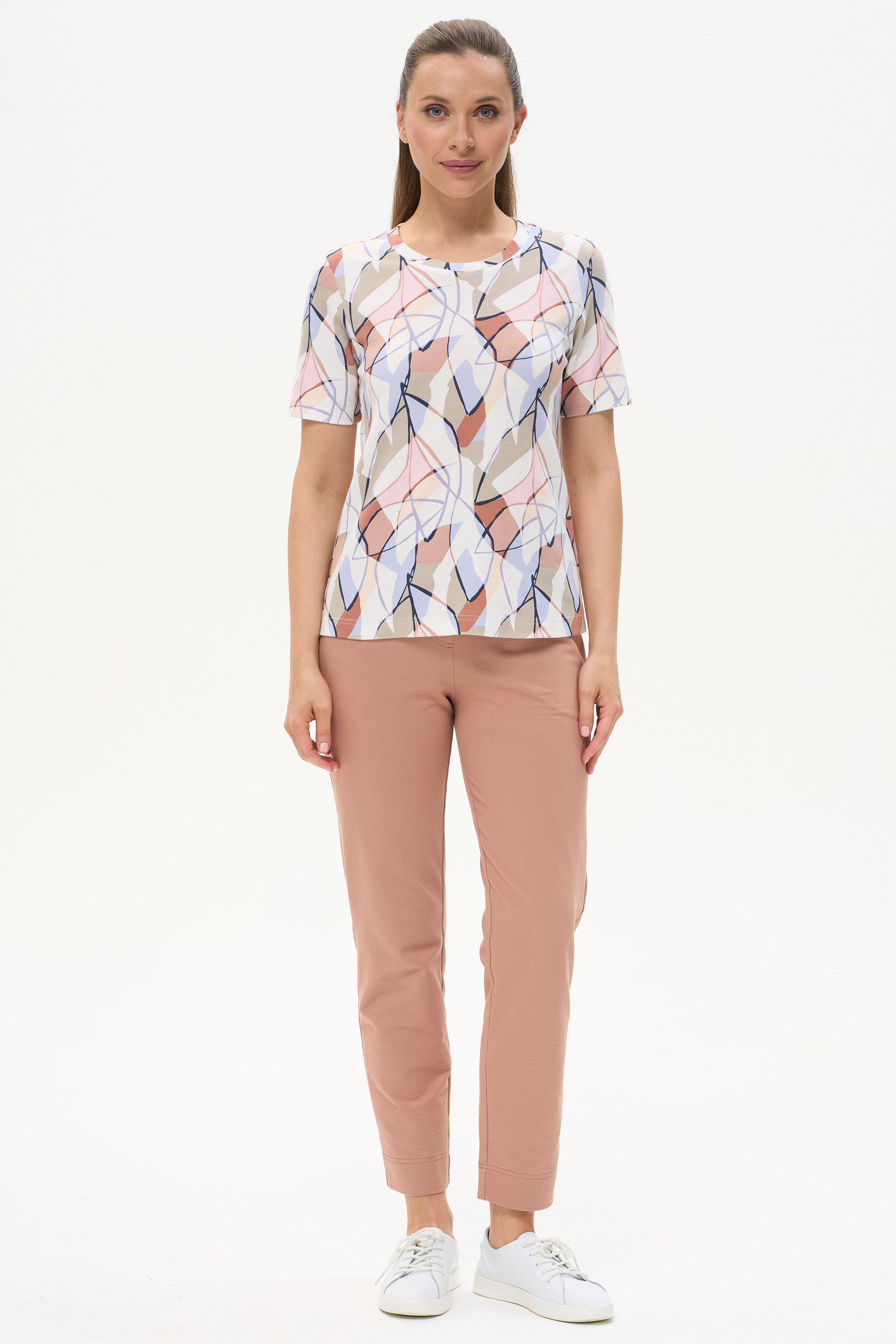 92% хлопок, 8% эластан Стильная футболка прямого силуэта, выполнена из хлопкового трикотажного полотна с эластаном - рибана. Круглый вырез горловины, втачные короткие рукава. Рост модели 175 см.